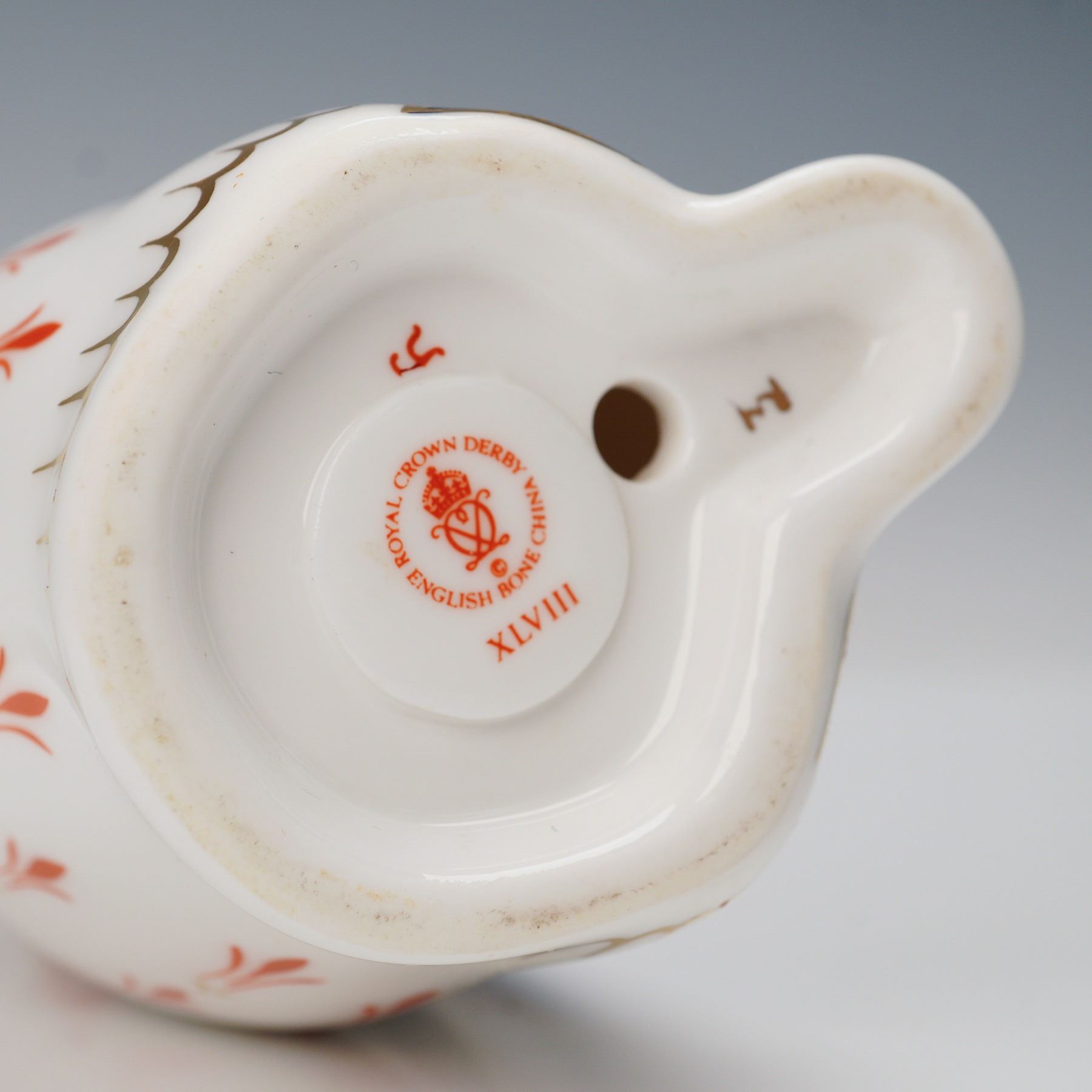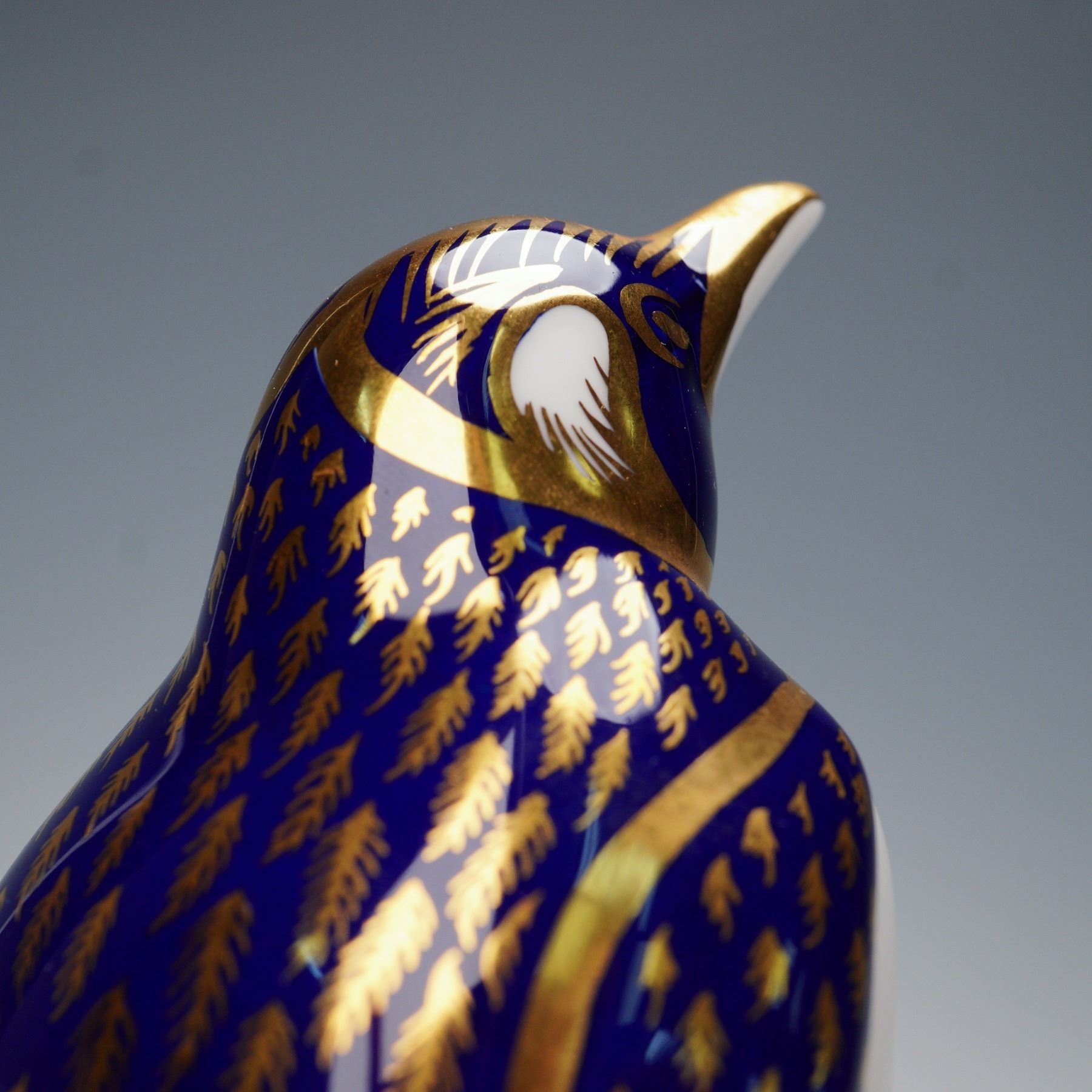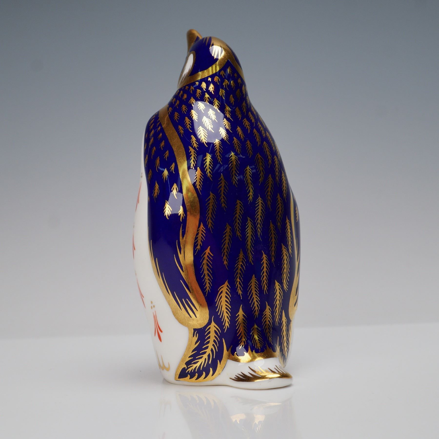 Decorated in the company's signature Imari-inspired palette. The figure features a rich cobalt blue back with intricate gilt feather detailing, contrasted by a white body adorned with repeating red and gold motifs. Accented throughout with hand-applied gilding, including the beak, wings, and base edging. Marked on the underside with the Royal Crown Derby stamp and numbered date.