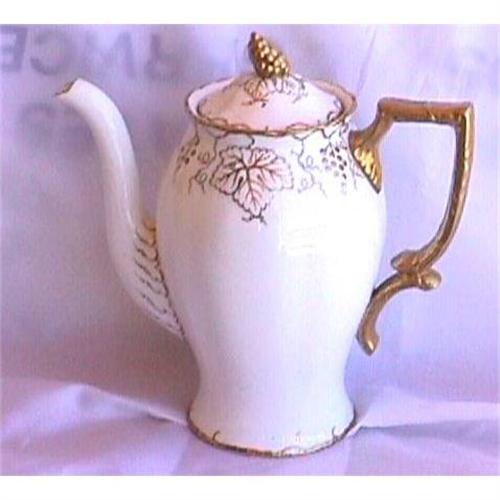 This is a beautiful coffee pot with the lid. It is white with a gold handle and scalloped edges. The pattern is called Vine. It it is decorated with gold grapes and leaves. A beautiful piece. Royal Crown Derby marking. Made in England. The pot alone stands 7.25" or 8.75" with the lid in place. Excellent condition. No chips or cracks.