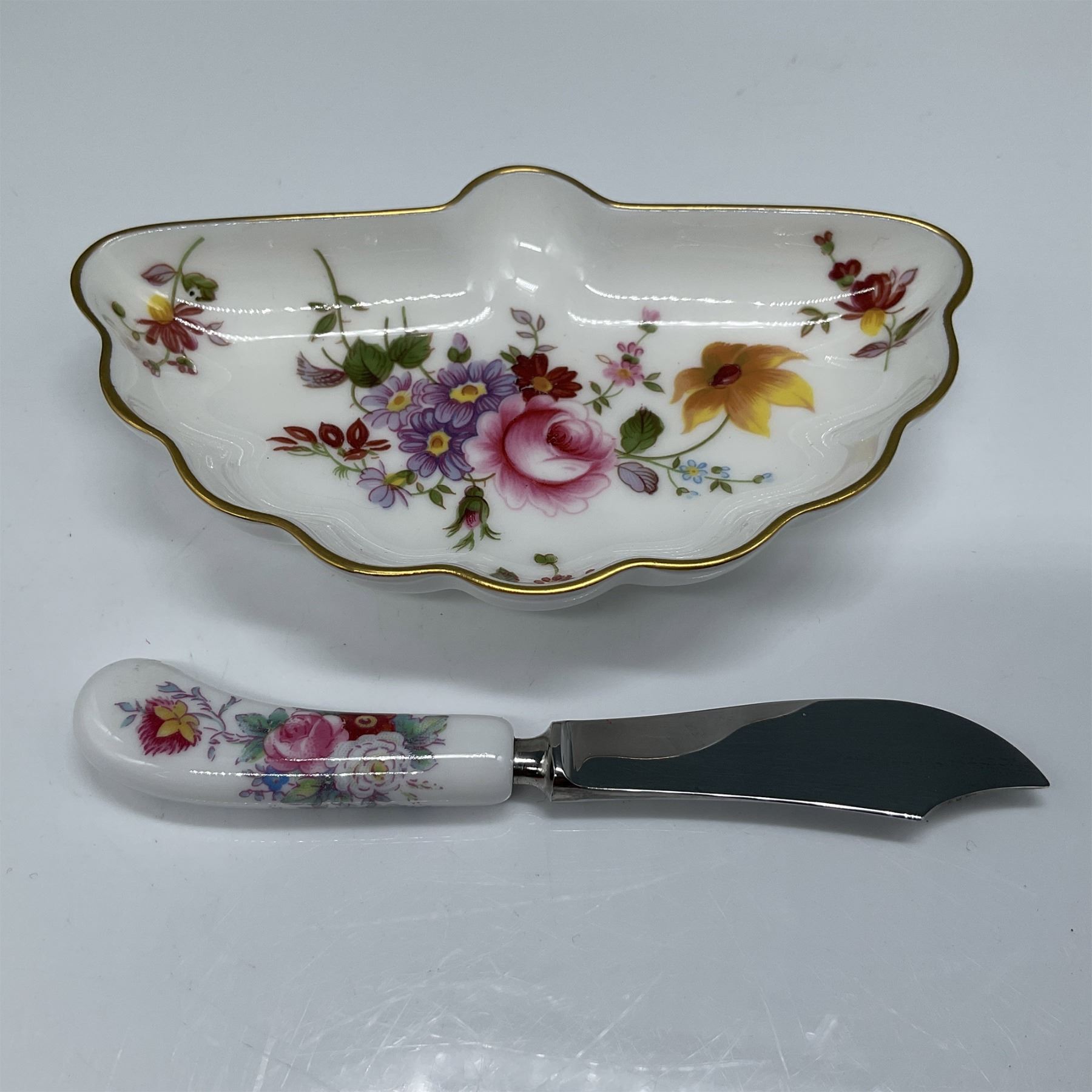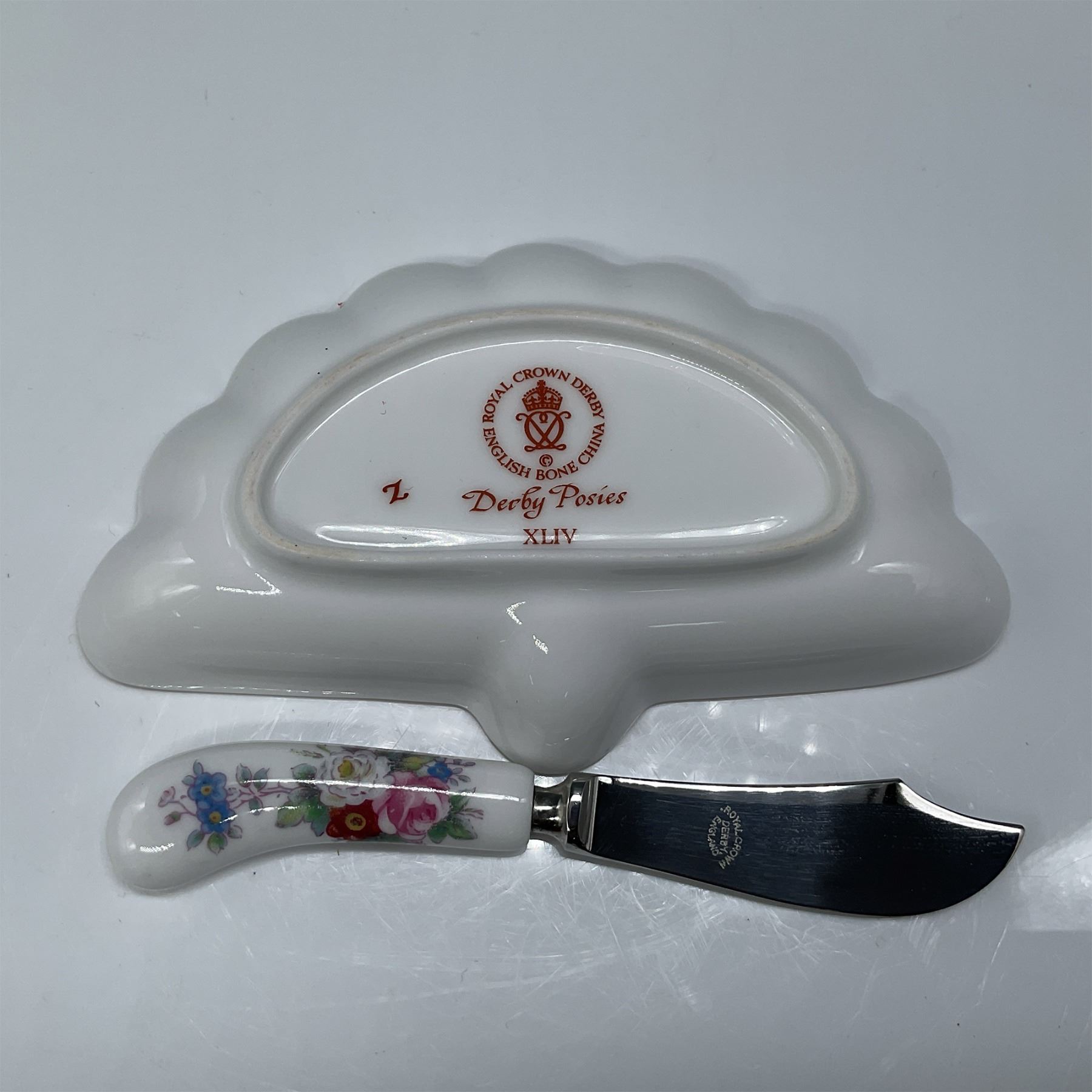 Elegant Royal Crown Derby fine bone china dish and spreader set in the Derby Posies pattern, featuring vibrant floral motifs with gold trim. The set includes a shell-shaped dish and a matching spreader with a porcelain handle. Accompanied by its original presentation box, which measures 5"L x 4.75"W, and an informational booklet. The backstamp on the dish confirms authenticity.