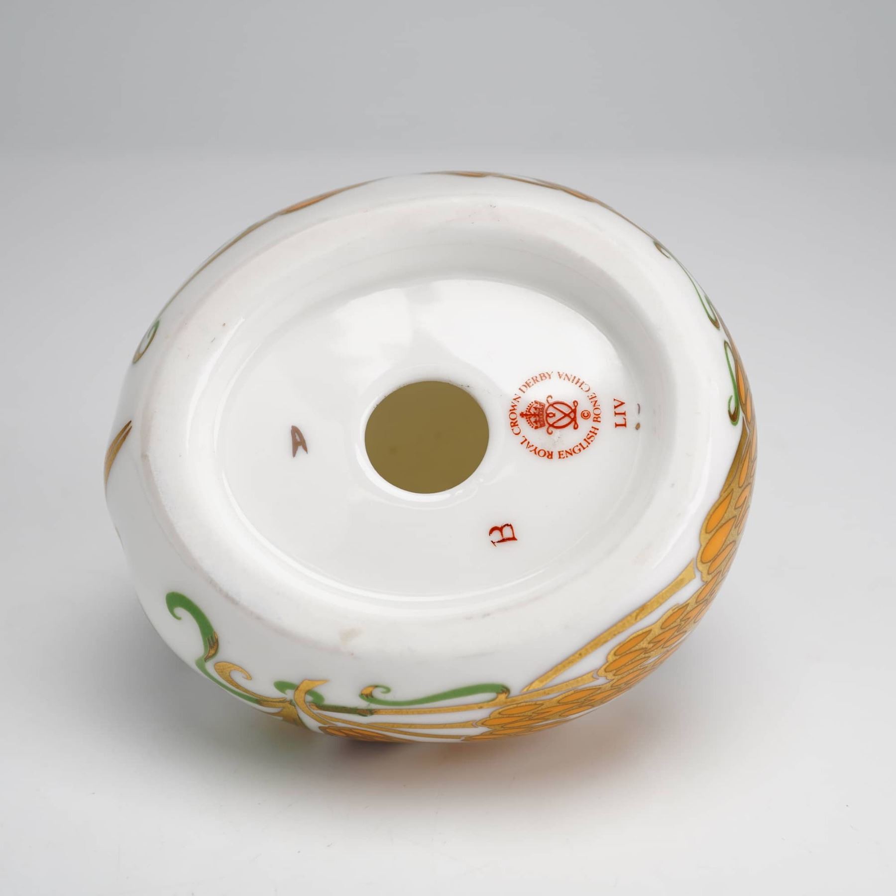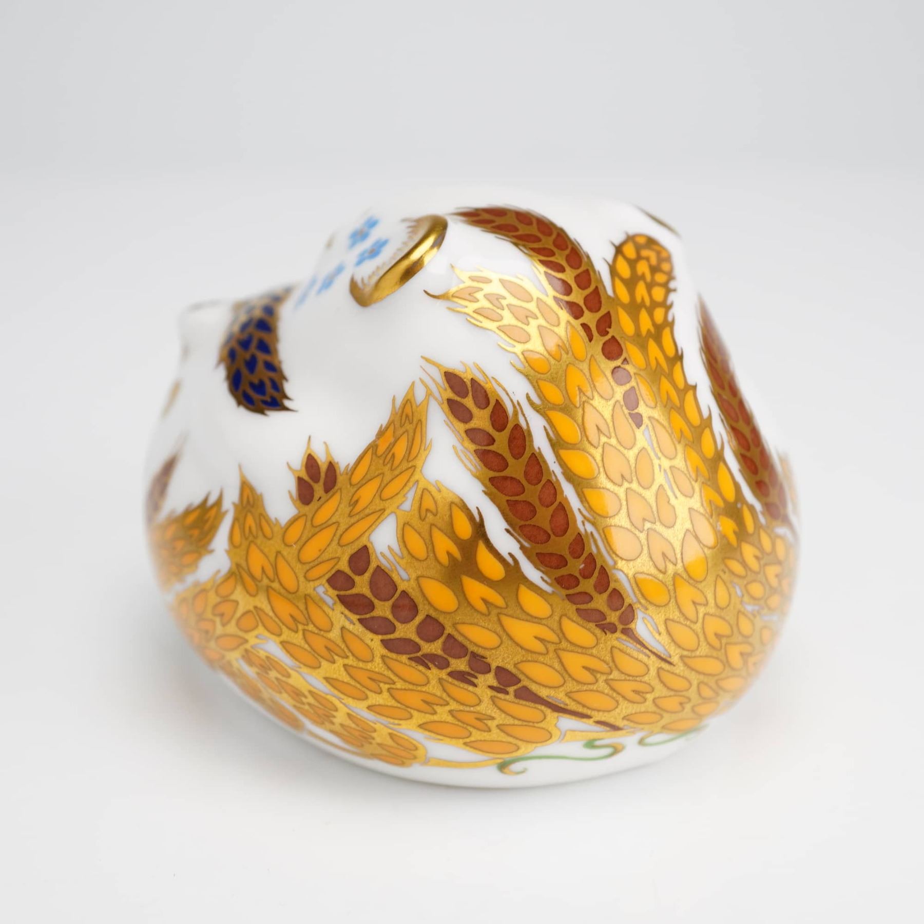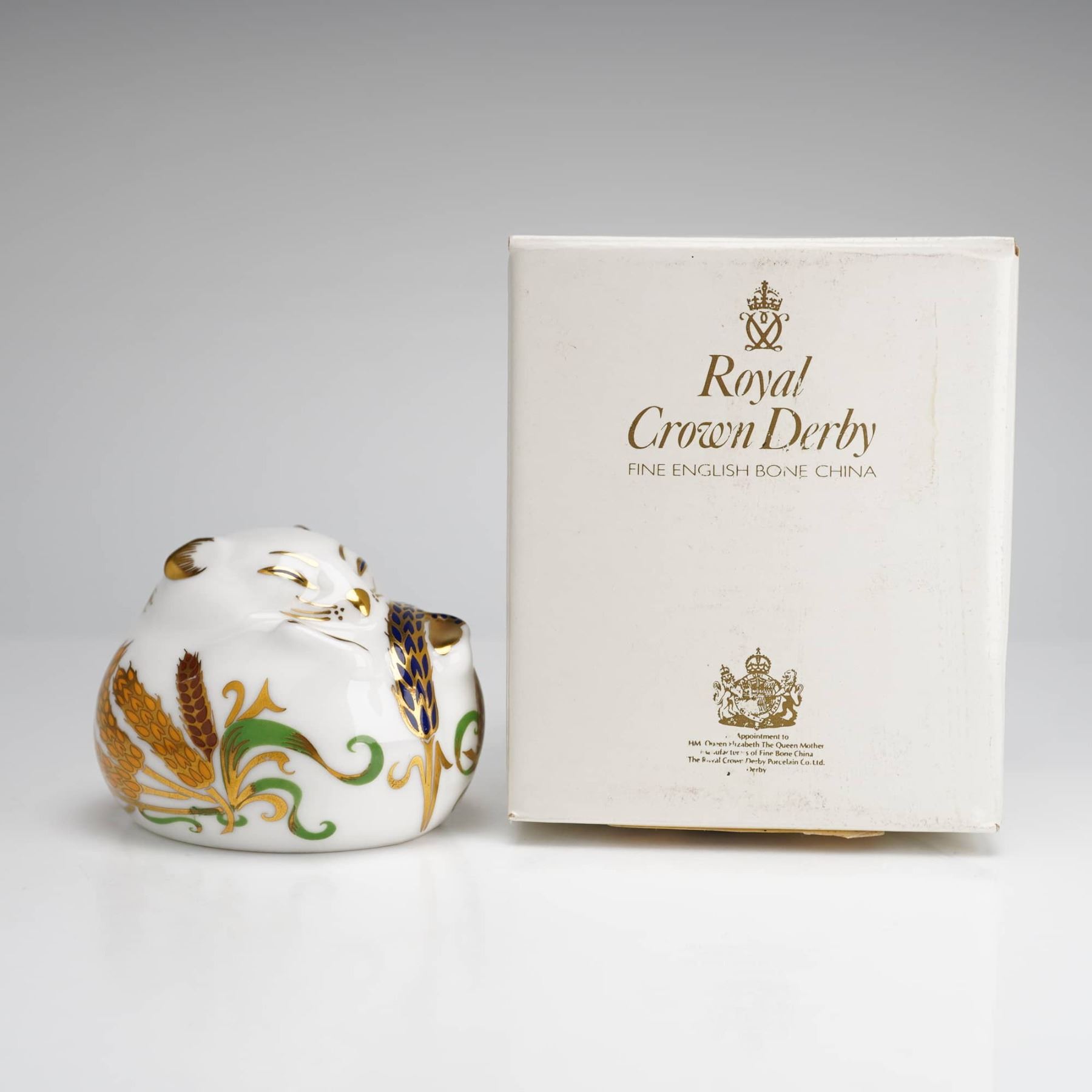 This Royal Crown Derby English bone china paperweight is modeled as a sleeping dormouse in a curled pose. The figurine is decorated with patterns of wheat ears, small blue flowers, and scrolling foliage in cobalt blue, green, and iron red with 22kt gold gilding. The underside bears the red Royal Crown Derby printed backstamp and the Roman numeral date code LIV, indicating a production year of 1991. The item is accompanied by its original blue textured presentation box featuring gold-stamped branding.