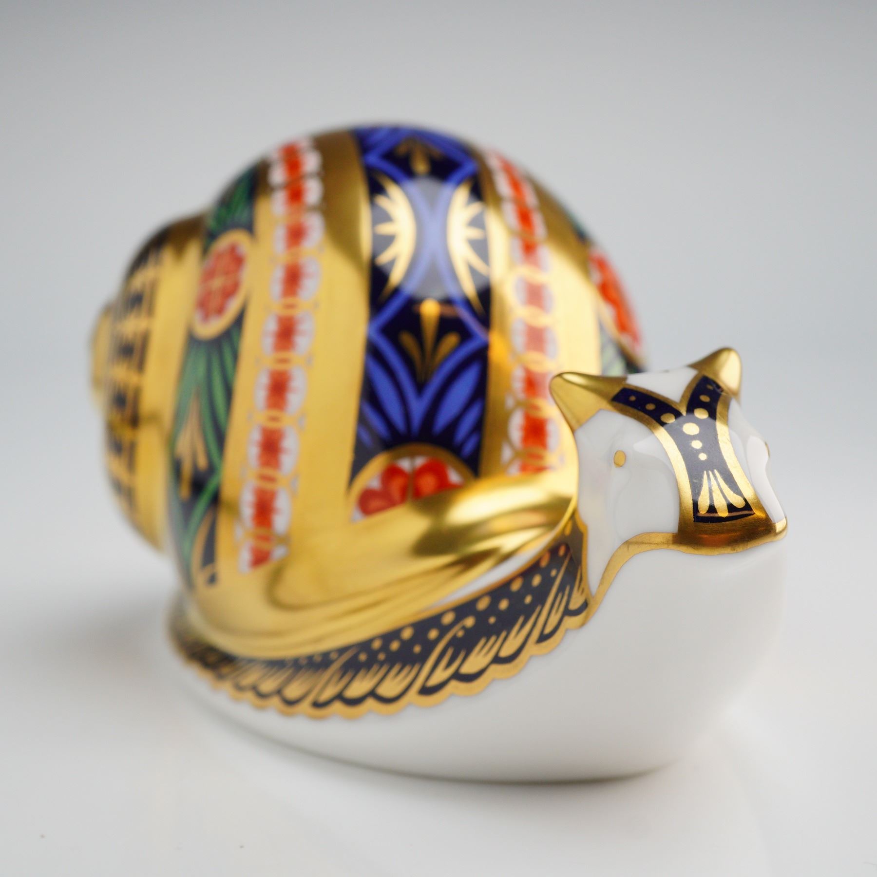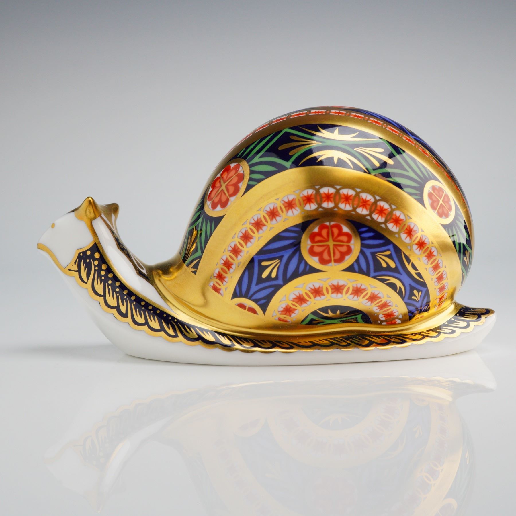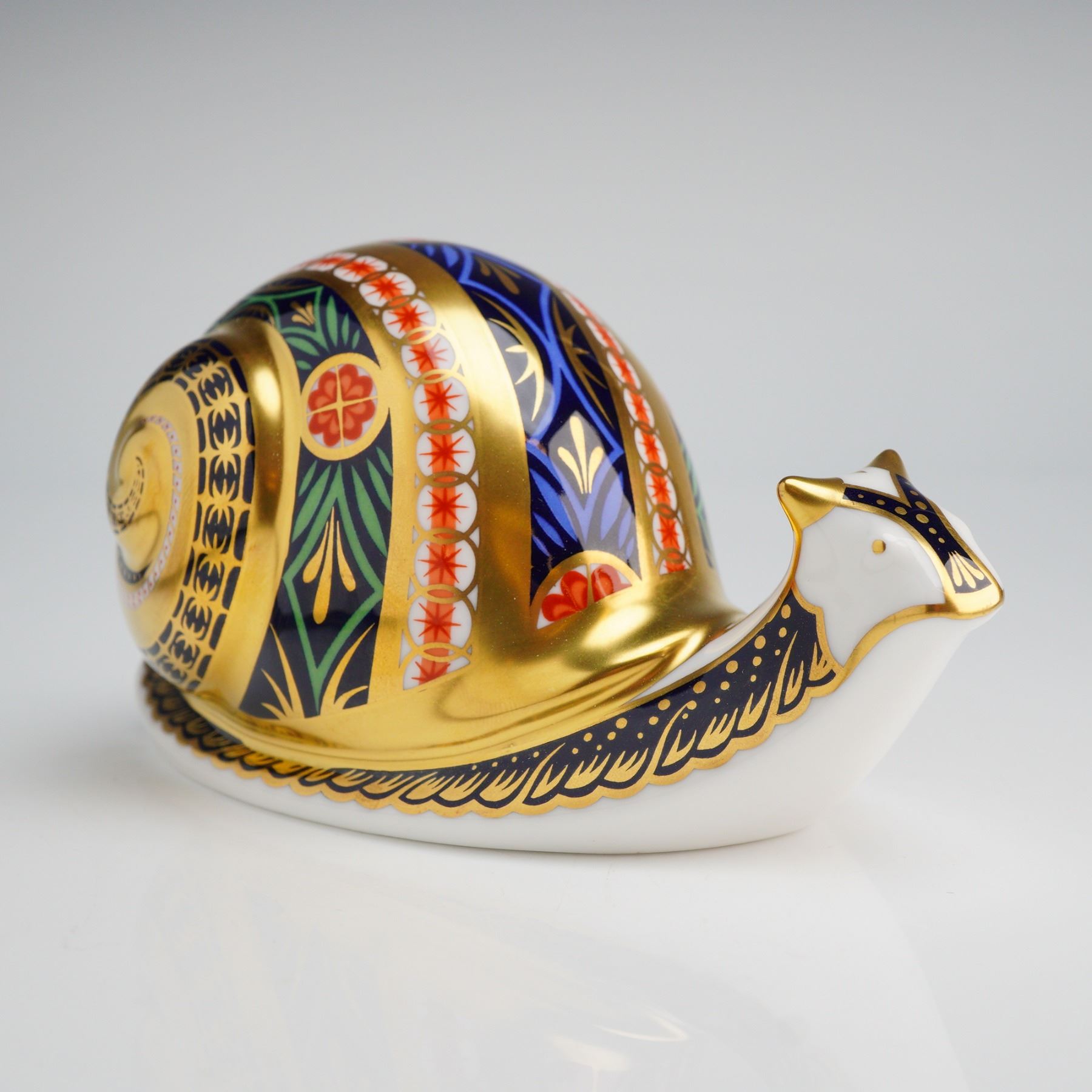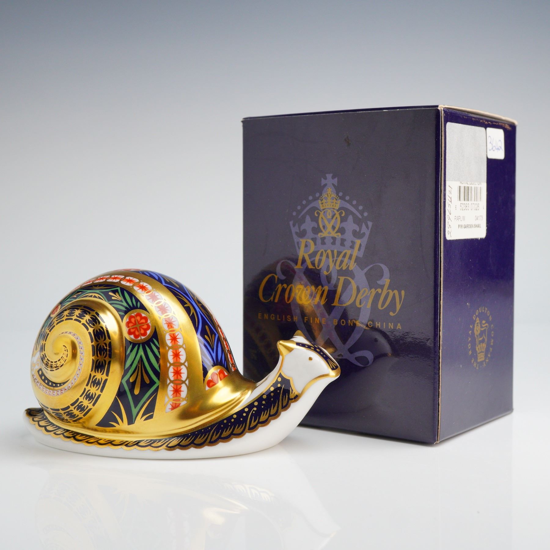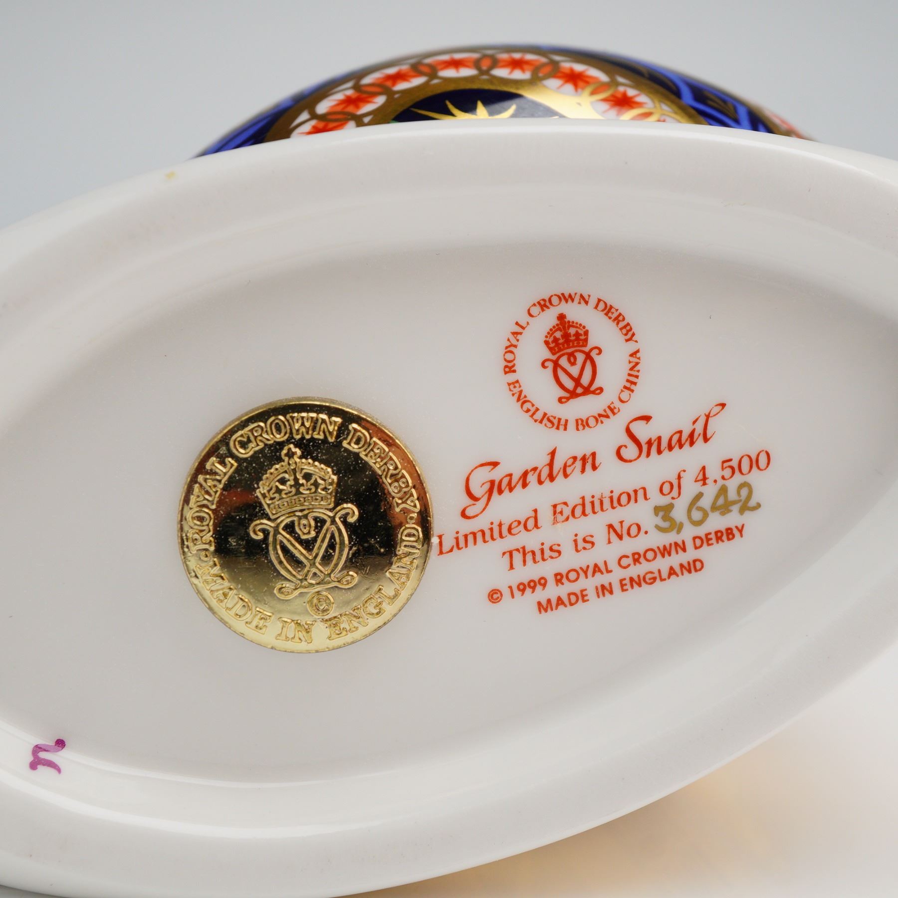 A Royal Crown Derby Garden Snail paperweight crafted from English fine bone china. This piece is decorated in an Imari-style palette featuring navy blue, red, and green with gold-leaf accents. The form is a stylized snail with geometric and floral patterns across the shell and body. The underside bears the red Royal Crown Derby English Bone China stamp and is titled Garden Snail. It is marked as number 3,642 of a limited edition of 4,500 and dated 1999. The item features an inset gold-tone manufacturer stopper. This lot includes the original navy blue presentation box with gold-foil branding.