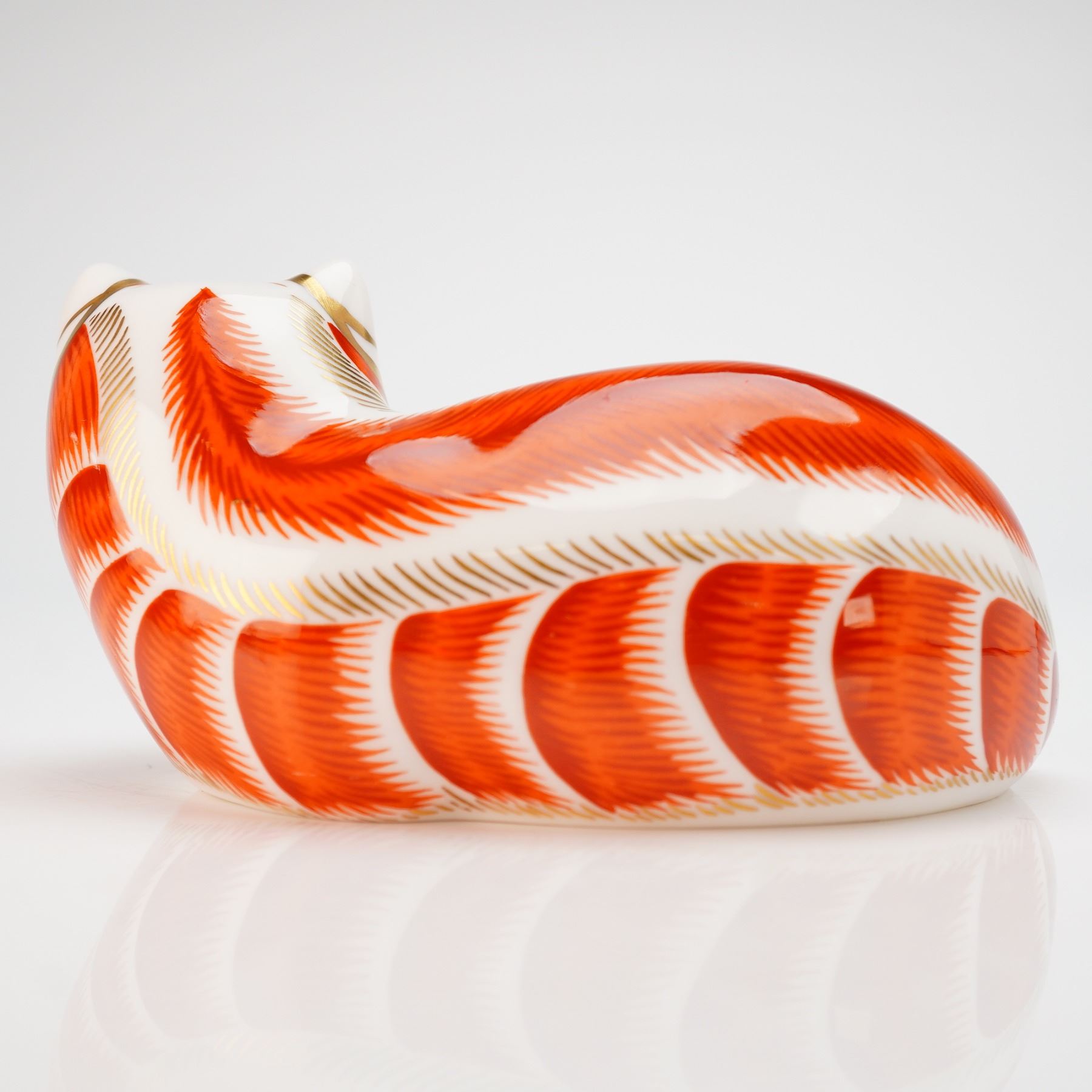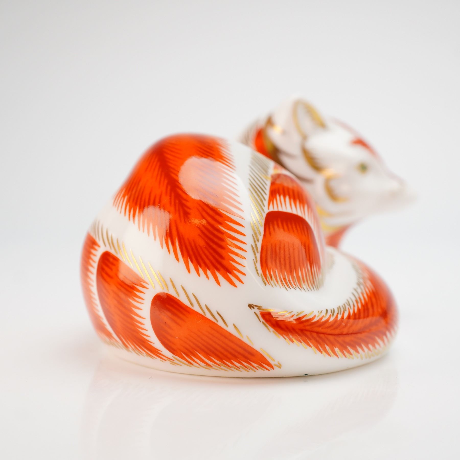A Royal Crown Derby fine bone china paperweight from the Imari collection depicting a reclining red fox. The figurine is decorated with orange-red feathered patterns and 22-karat gold gilding on a white ground. Physical characteristics include green eyes and gold-lined ears. The underside bears the official red Royal Crown Derby backstamp with the Roman numeral date code LIII, indicating a manufacture date of 1990. The base also features a gold-toned stopper and minor handwritten notations. This item is presented with its original purple Royal Crown Derby branded box.