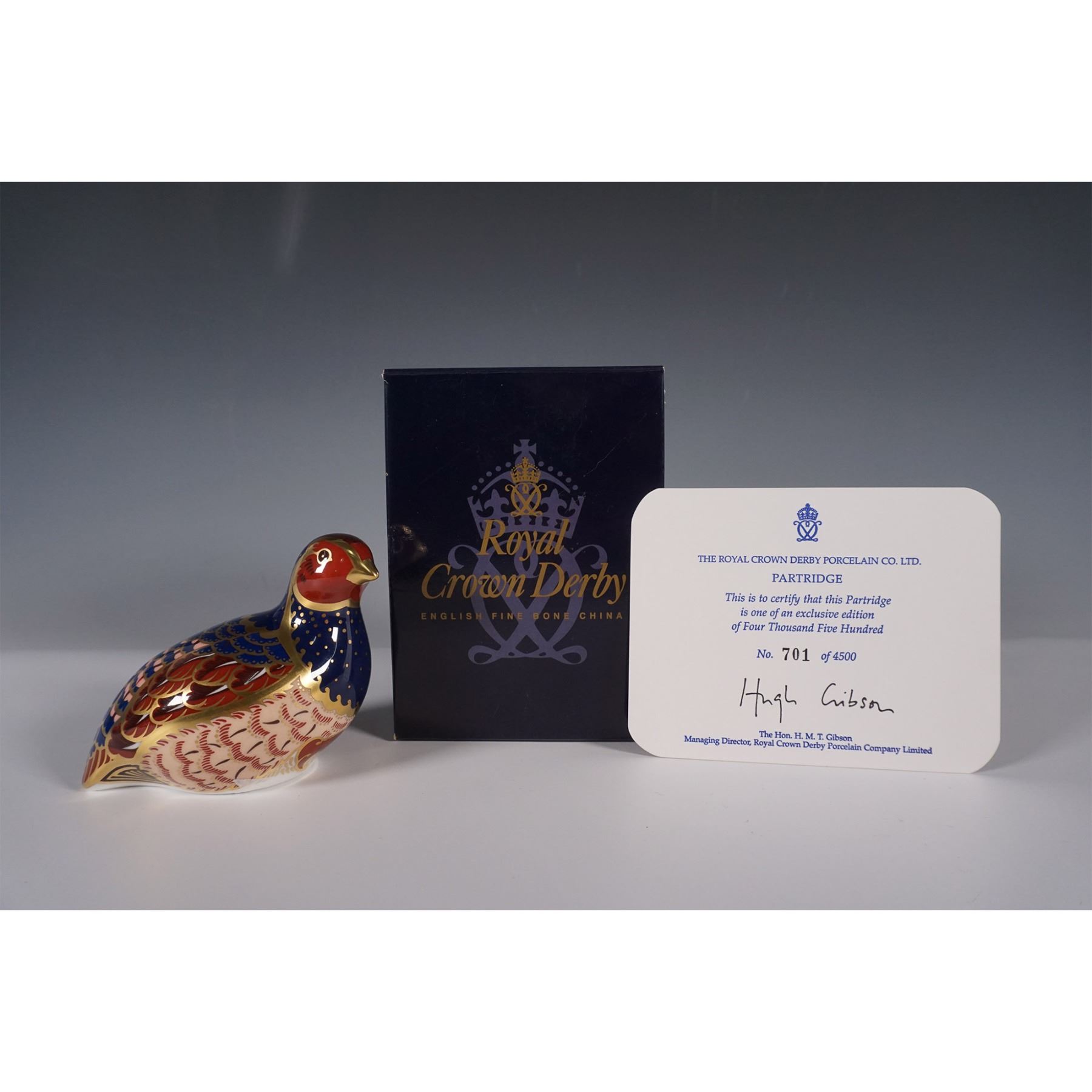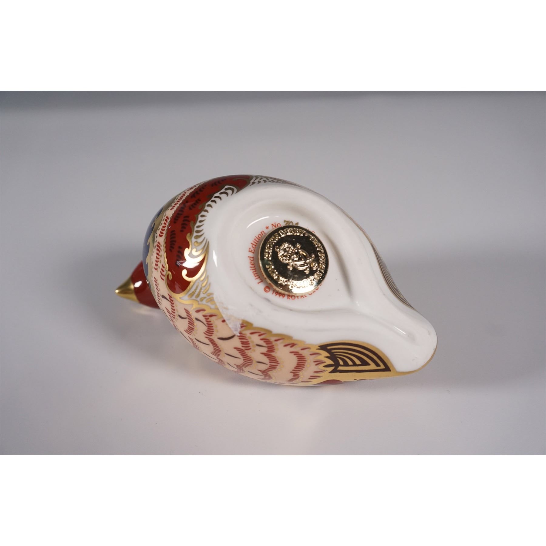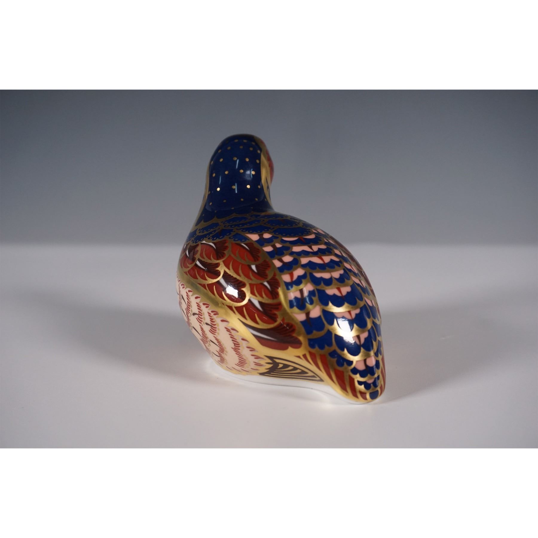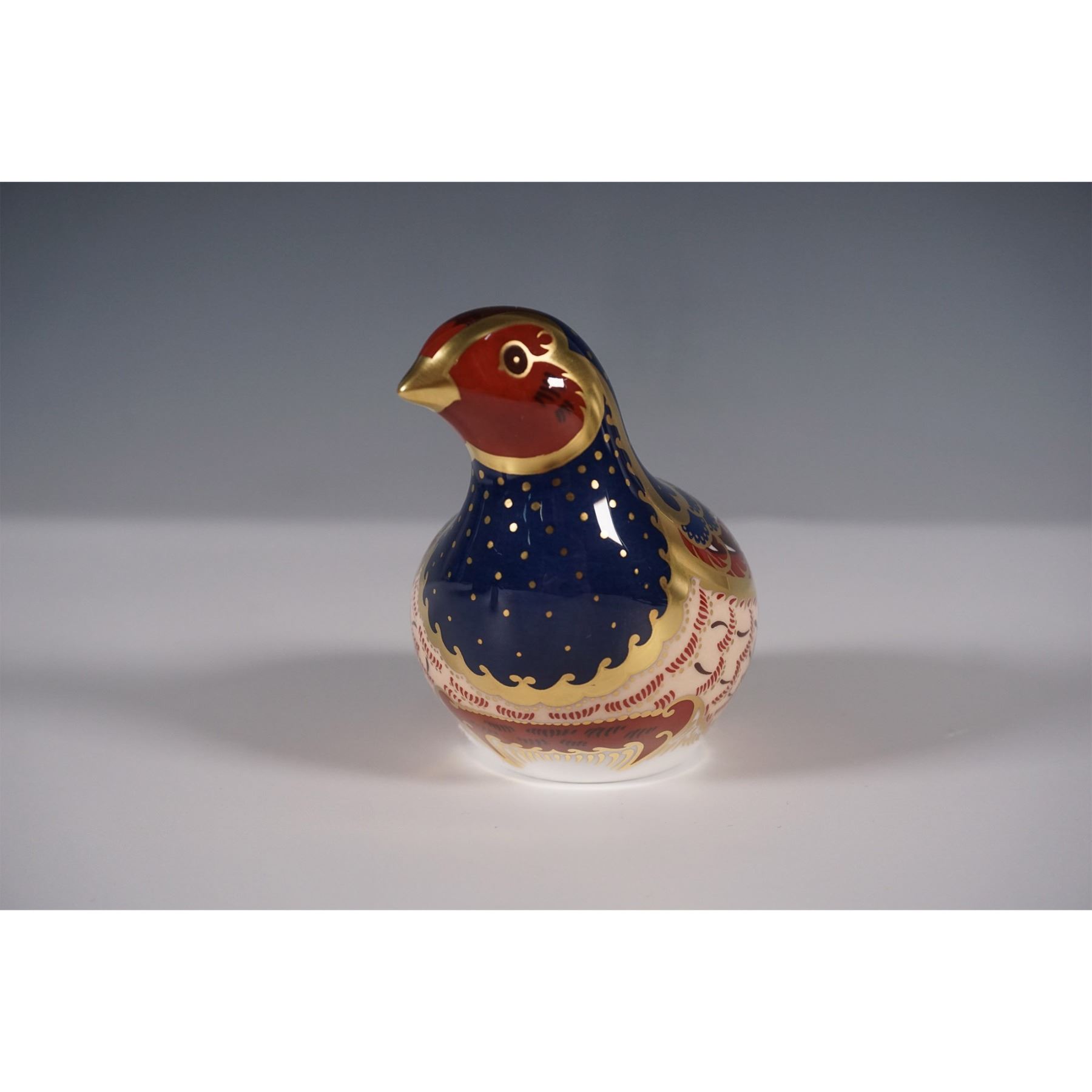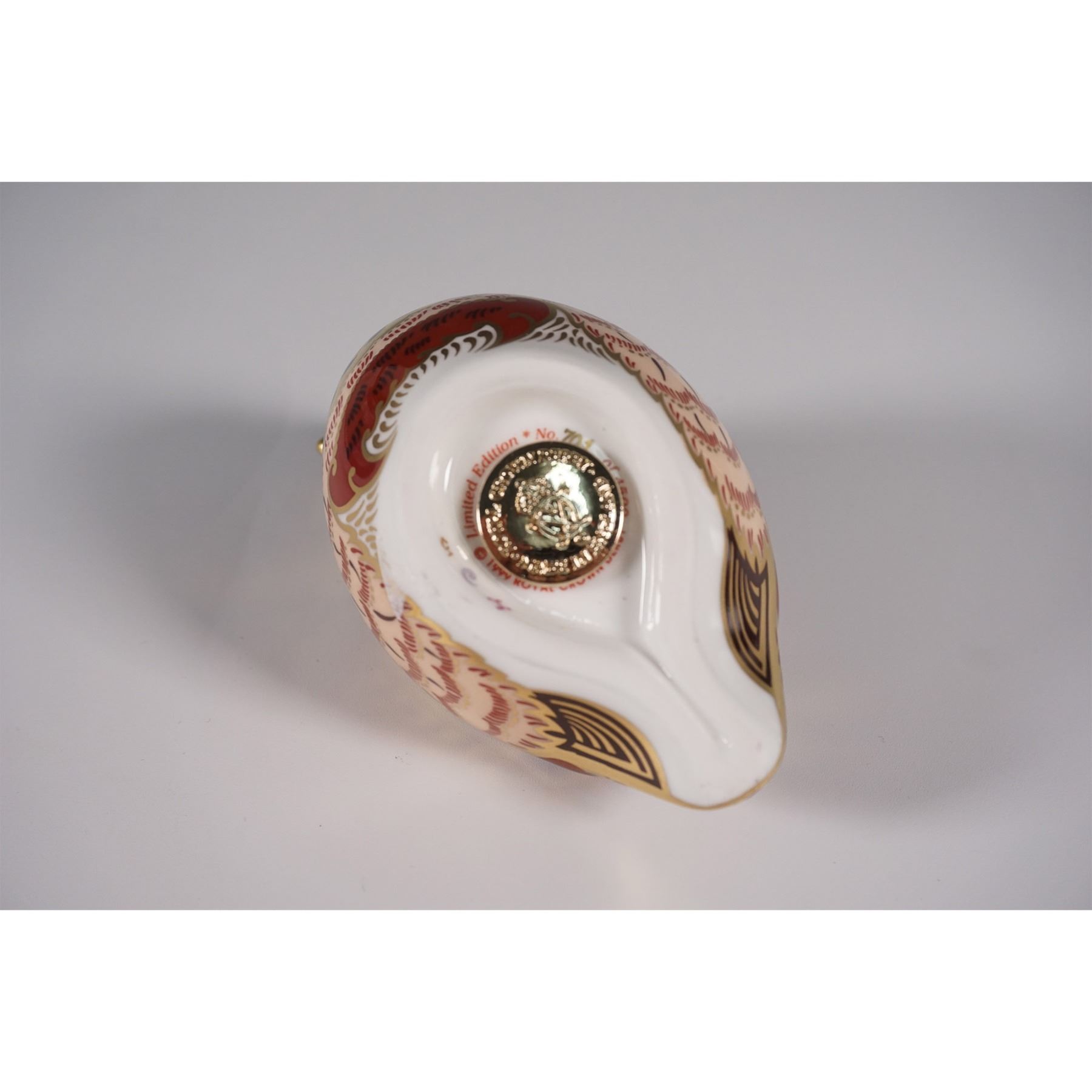 Exquisite porcelain paperweight depicting a partridge, part of the brand's prestigious collection of decorative animal figurines. This piece showcases the brand's signature Imari-inspired palette with deep cobalt blue, rich red, and luxurious gilt detailing. The intricate feathered pattern highlights the craftsmanship Royal Crown Derby is renowned for, with hand-applied gilding enhancing the lifelike elegance of the bird. This limited edition paperweight features a gold stopper on the base, signifying its exclusivity, and is accompanied by its original box and Certificate of Authenticity. A highly collectible piece, this Royal Crown Derby partridge is a stunning addition to any collection of fine ceramics.