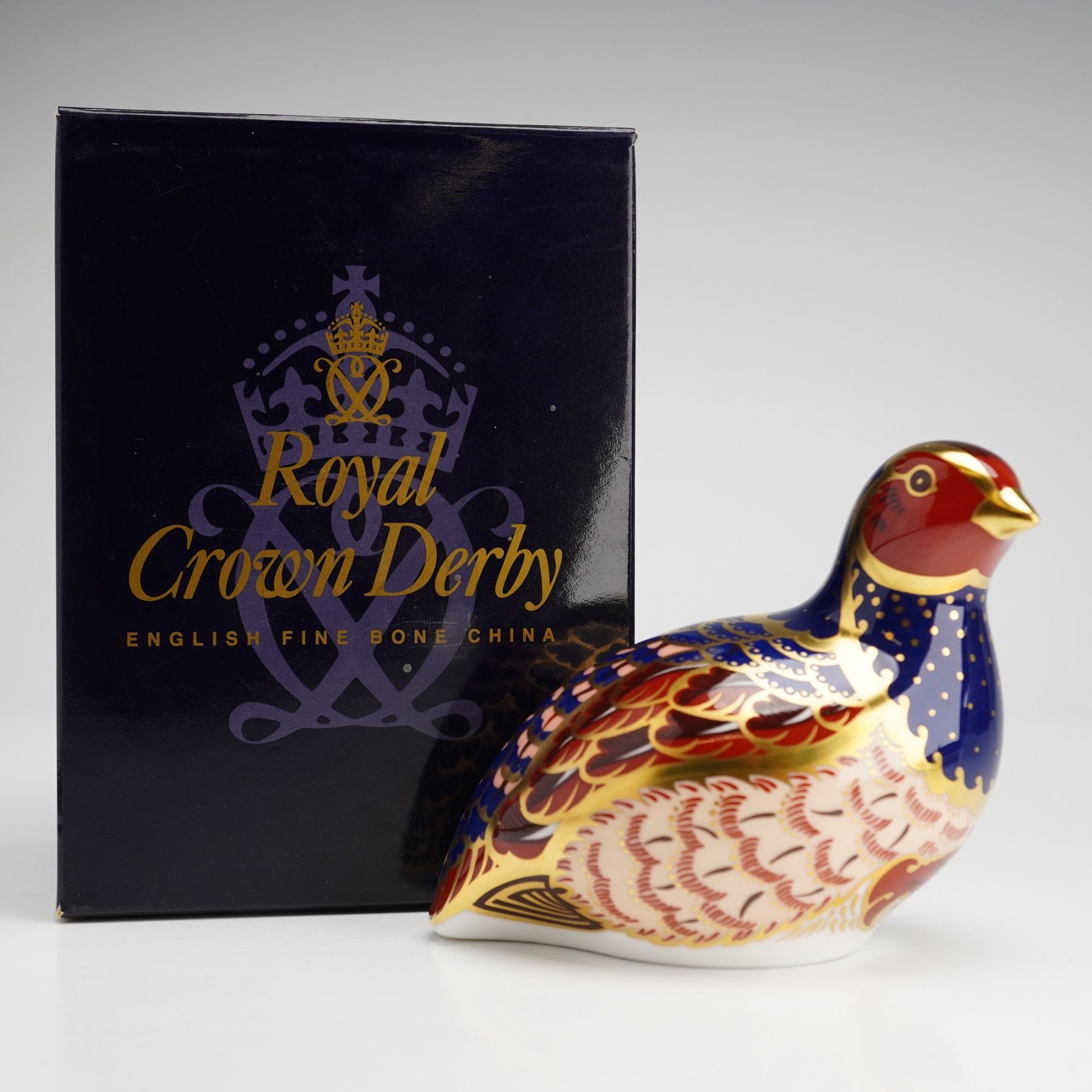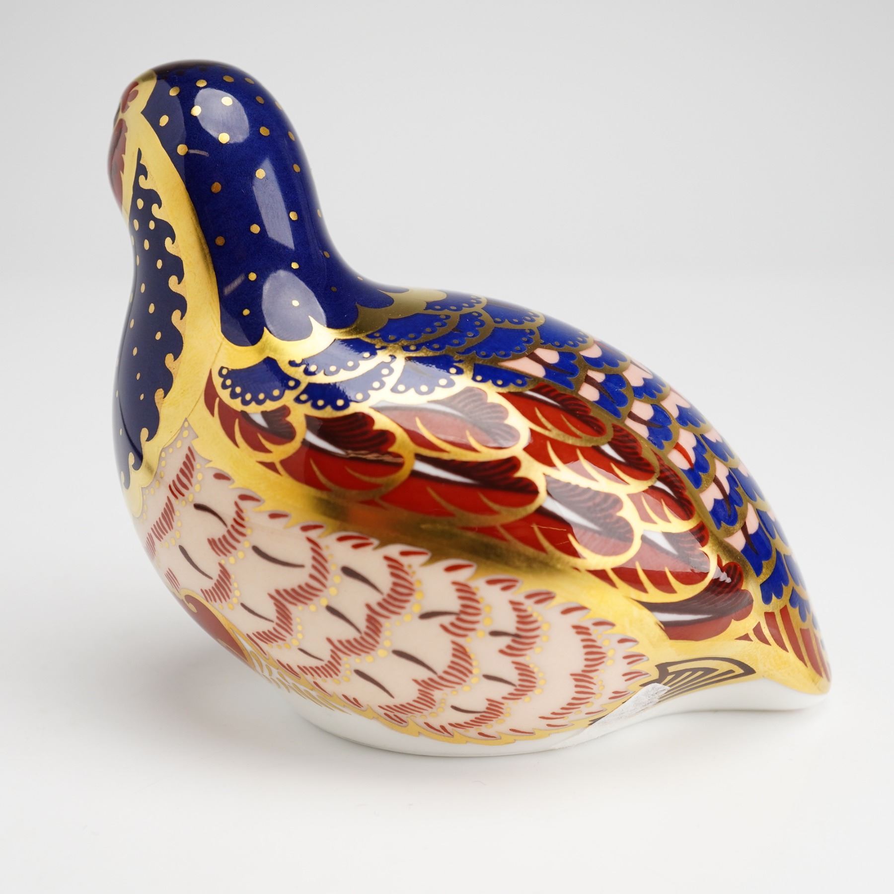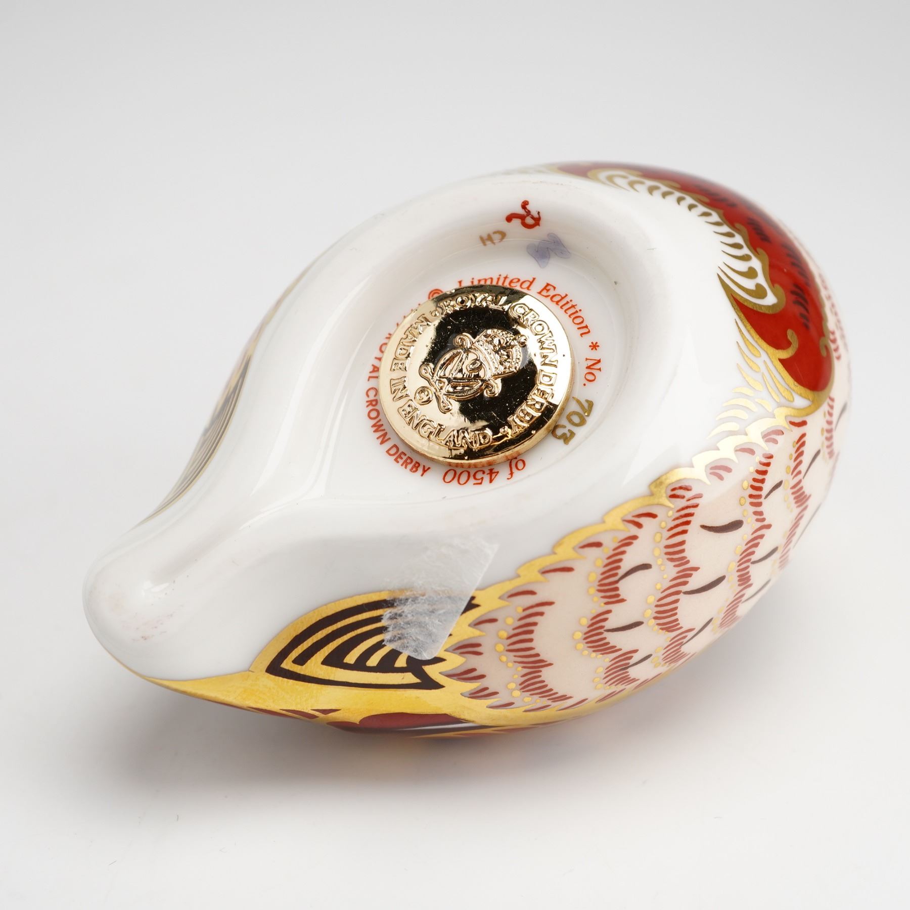The figure is decorated in a traditional Imari style with cobalt blue and iron red glazes, accented with extensive gold gilding. The decoration includes stylized feather patterns and gold stippling. The base is inset with a gold-tone manufacturer's stopper and bears the Royal Crown Derby mark along with the limited edition numbering 703 of 4500. The piece is accompanied by the original dark blue manufacturer's box.