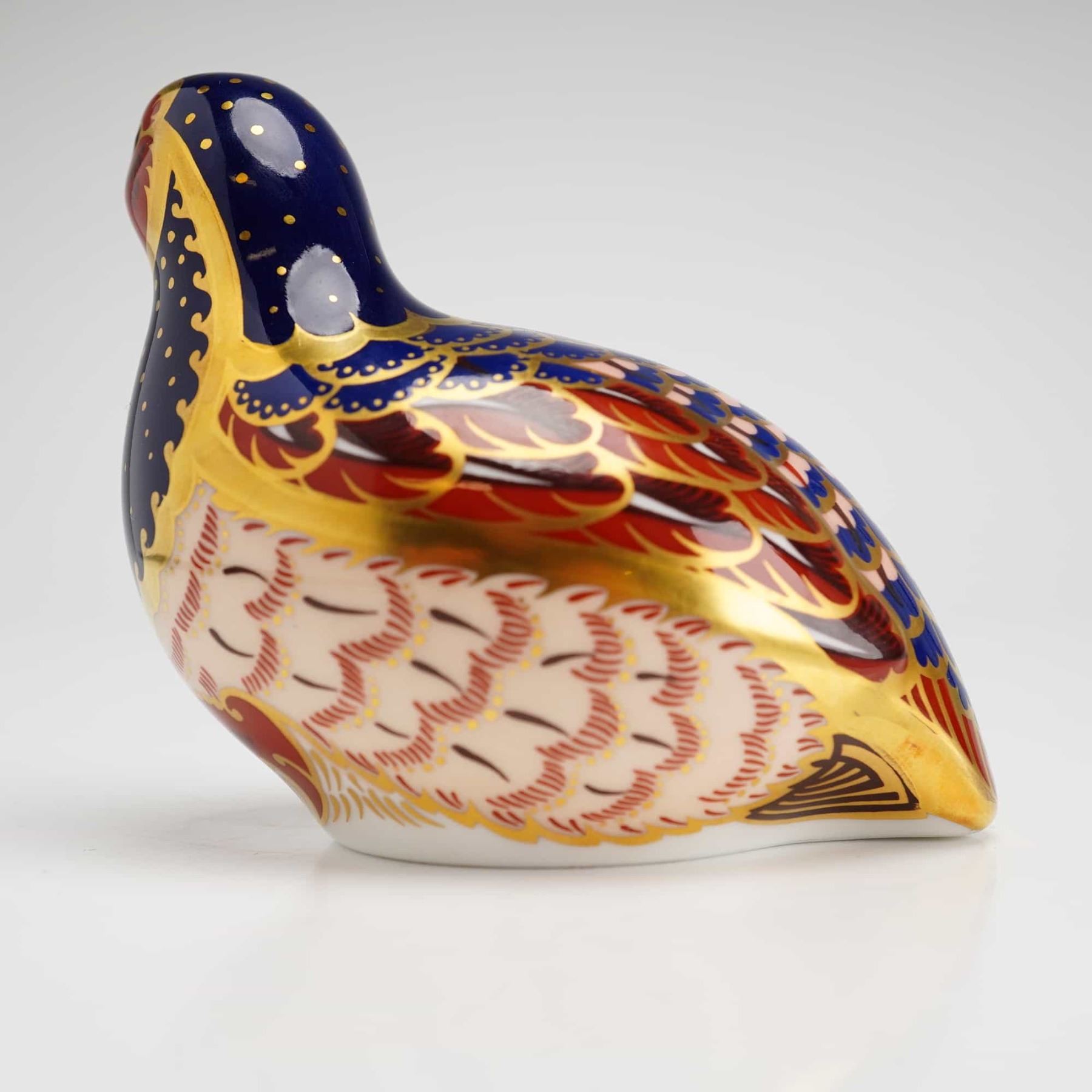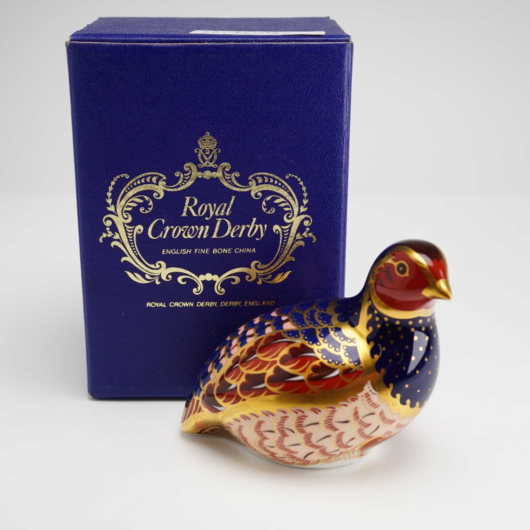 A Royal Crown Derby fine bone china paperweight modeled as a partridge. The figurine is decorated in a traditional Imari style with cobalt blue, iron red, and gold gilding. The base features the Royal Crown Derby backstamp, the year 1999, and is numbered 2,853 from a limited edition of 4,500. A gold-colored stopper is fitted to the underside. This lot includes the original blue Royal Crown Derby presentation box.