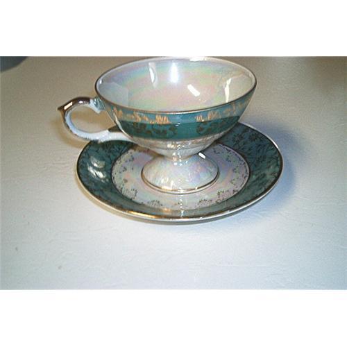 Featuring a beautiful teacup/saucer. Stamped On The Bottom In GOLD: Royal Crown. Also displays a Royal Crown Emblem. Turquoise background with gold trim around the edges and gold flowers, stems, and leaves. Lusterware. Number: 44/660. (Painted in Gold). Saucer measures: 5 1/2 inches in diameter. Teacup measures 2 3/4 inches tall; Opening diameter measures 3 3/4 inches. Mint Condition.