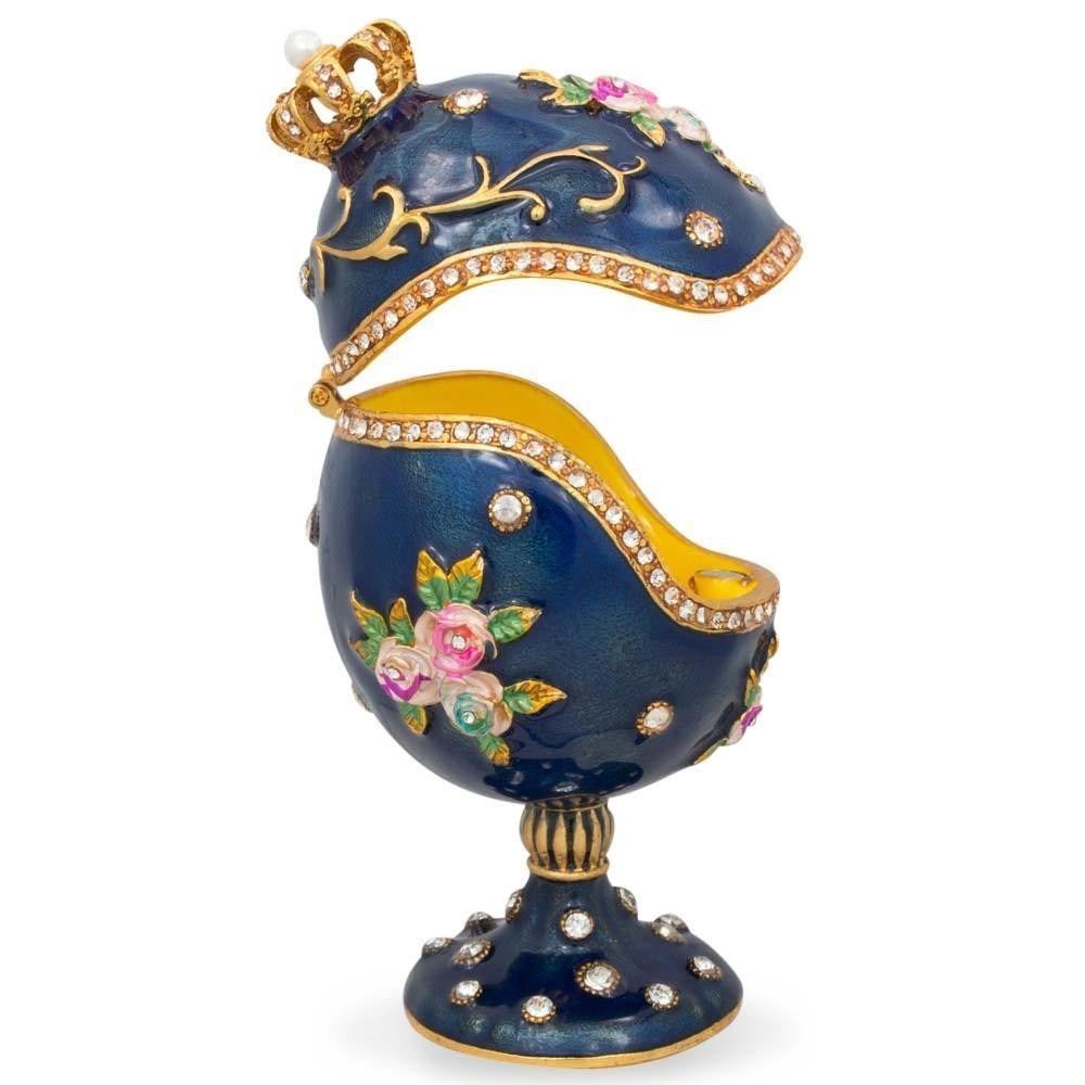 4.5" Royal Crown with Flowers Blue Enamel Inspired Russian Egg 4.5 Inches Tall X 2.6 Inches Diameter Pewter, Crystals, Enamel Boxed This sparkling egg is adorned with clear crystals and high-polished enamel with golden trim. It opens on a hinge and has a magnetic closure to keep the box securely shut. The piece also comes in a beautiful gift box. With crown shape, floral motif, blue enamel, and golden trim, the 4.5" Royal Crown with Flowers Blue Enamel Inspired Russian Egg is an exceptional piece of art. It is perfected from fine Pewter and clear crystals. You can gift it to loved ones to celebrate Eastertide.Â