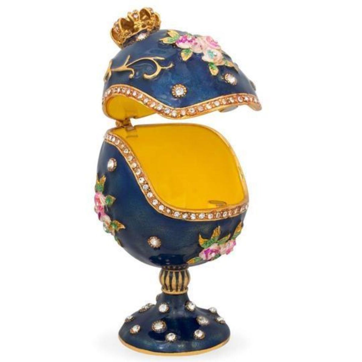 4.5" Royal Crown with Flowers Blue Enamel Inspired Russian Egg 4.5 Inches Tall X 2.6 Inches Diameter Pewter, Crystals, Enamel Boxed This sparkling egg is adorned with clear crystals and high-polished enamel with golden trim. It opens on a hinge and has a magnetic closure to keep the box securely shut. The piece also comes in a beautiful gift box. With crown shape, floral motif, blue enamel, and golden trim, the 4.5" Royal Crown with Flowers Blue Enamel Inspired Russian Egg is an exceptional piece of art. It is perfected from fine Pewter and clear crystals. You can gift it to loved ones to celebrate Eastertide.Â