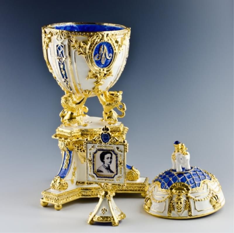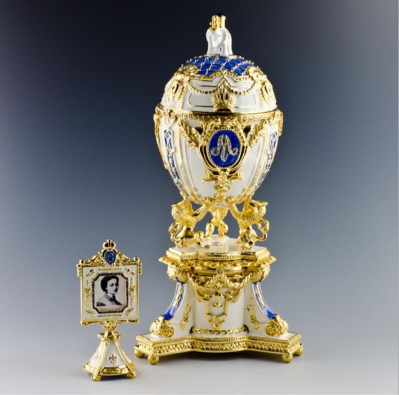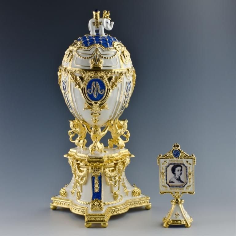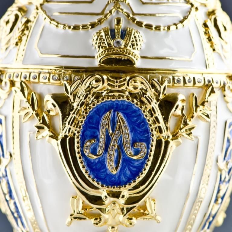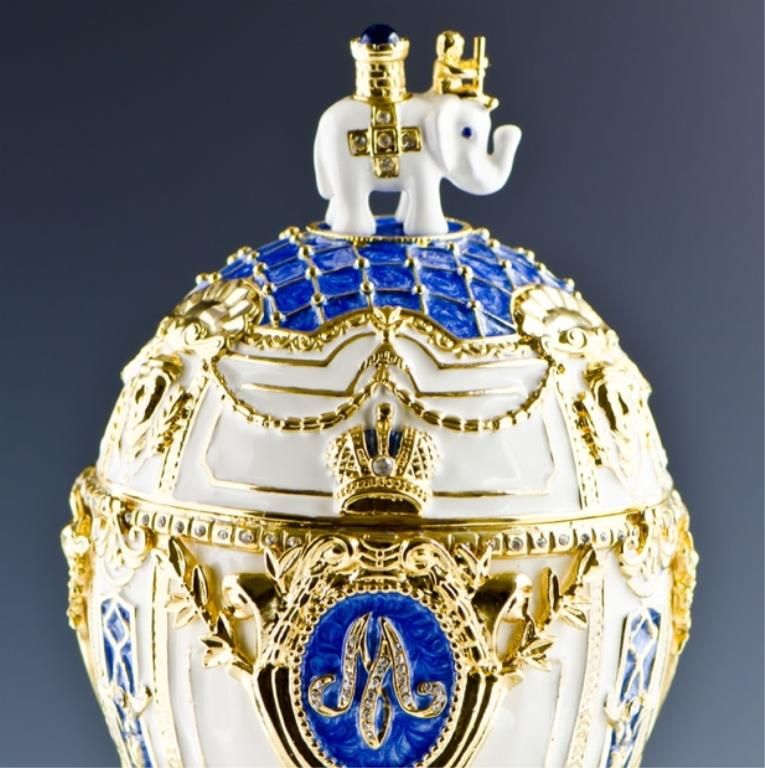 9.5'' (H) X 3.25'' (W) 3 lbs 12 oz Picture Frame Included Contains Music Box and Plays "For Elise" by Ludwig van Beethoven Pewter, Enamel, Crystals Russian Imperial Royal Danish Jubilee Egg is surmounted by a Danish Royal Elephant and supported by 3 danish heraldic lions, the white enameled egg is marked by diamond-set imperial crown. At the center it has the crowned monogram of Tsarina Mariya name, emblazoned in rose-cut crystals. The double-sided miniature photo frame surmounted by a crystal crown is fitted inside. The egg was gifted by Russian czar Nicholas to his wife Mariya Fyodorovna in 1903. It's missing nowadays. Faberge is a trademark of Pallinghurst Resources LLP. This piece of art should not be associated with Pallinghurst Resources LLP, Faberge Limited Co. who acquired the Faberge trademark in 2007. This item is an exacting replication of a piece of priceless value.
