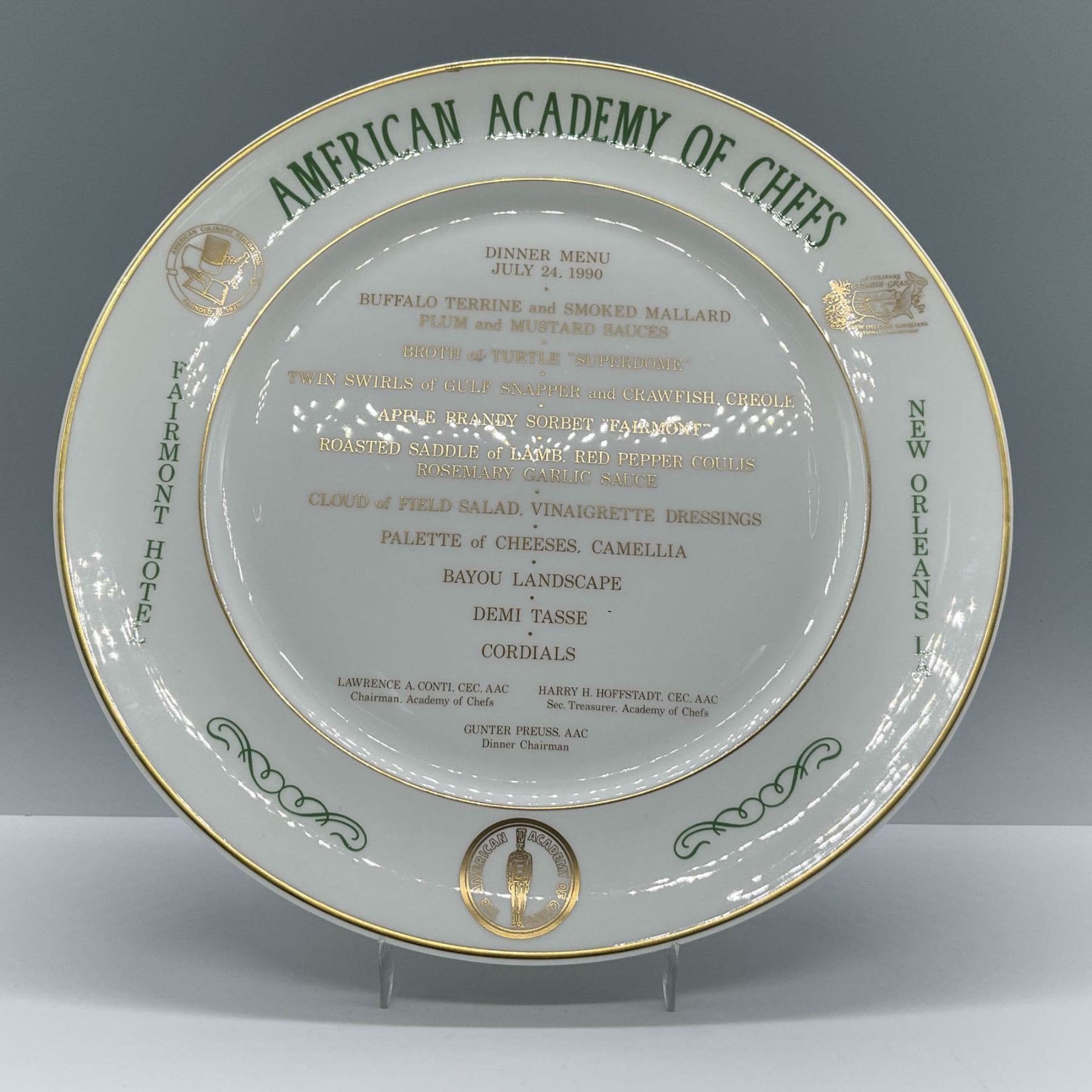 A rare and significant commemorative dinner plate crafted by Royal Doulton to honor the prestigious New Orleans American Academy of Chefs' event held at the Fairmont Hotel on July 24, 1990. This elegant plate prominently features the event's formal dinner menu, written in a detailed script, and surrounded by gold and green accents with the official insignias of the American Academy of Chefs. The rim is adorned with the venue name, "Fairmont Hotel," and the location, "New Orleans," making it a true keepsake of this historic culinary gathering. Royal Doulton, a British manufacturer established in 1815, is celebrated worldwide for its fine bone china, porcelain, and collectible wares. Known for their unparalleled craftsmanship and timeless designs, Royal Doulton pieces often commemorate significant events, making them highly sought-after by collectors. About the Event: The American Academy of Chefs (AAC), the honor society of the American Culinary Federation, represents the pinnacle of culinary excellence. Their 1990 event at the Fairmont Hotel in New Orleans was a grand celebration of gastronomy, highlighting top-tier chefs, exquisite menus, and a commitment to culinary artistry. The listed menu reflects the sophistication and creativity of the event, with dishes such as Buffalo Terrine, Smoked Mallard, and Bayou Landscape desserts. This plate encapsulates the event's importance as a culinary milestone in New Orleans, a city renowned for its rich food heritage. Â