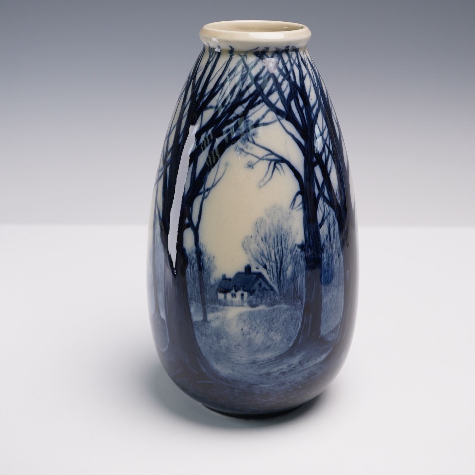 Royal Doulton vase decorated in the blue flambe palette, featuring a hand-painted continuous winter woodland landscape in dark blue and cream tones. The scene depicts a solitary thatched-roof cottage nestled among trees, with leafless branches arching across the shoulders of the vase. The vase has a bulbous ovoid form that tapers to a narrow opening with a short collar rim. It is finished in a glossy glaze that enhances the depth and fluidity of the landscape design. The base bears the green Royal Doulton mark with lion and crown above, and reads: Royal Doulton England over Flambe.