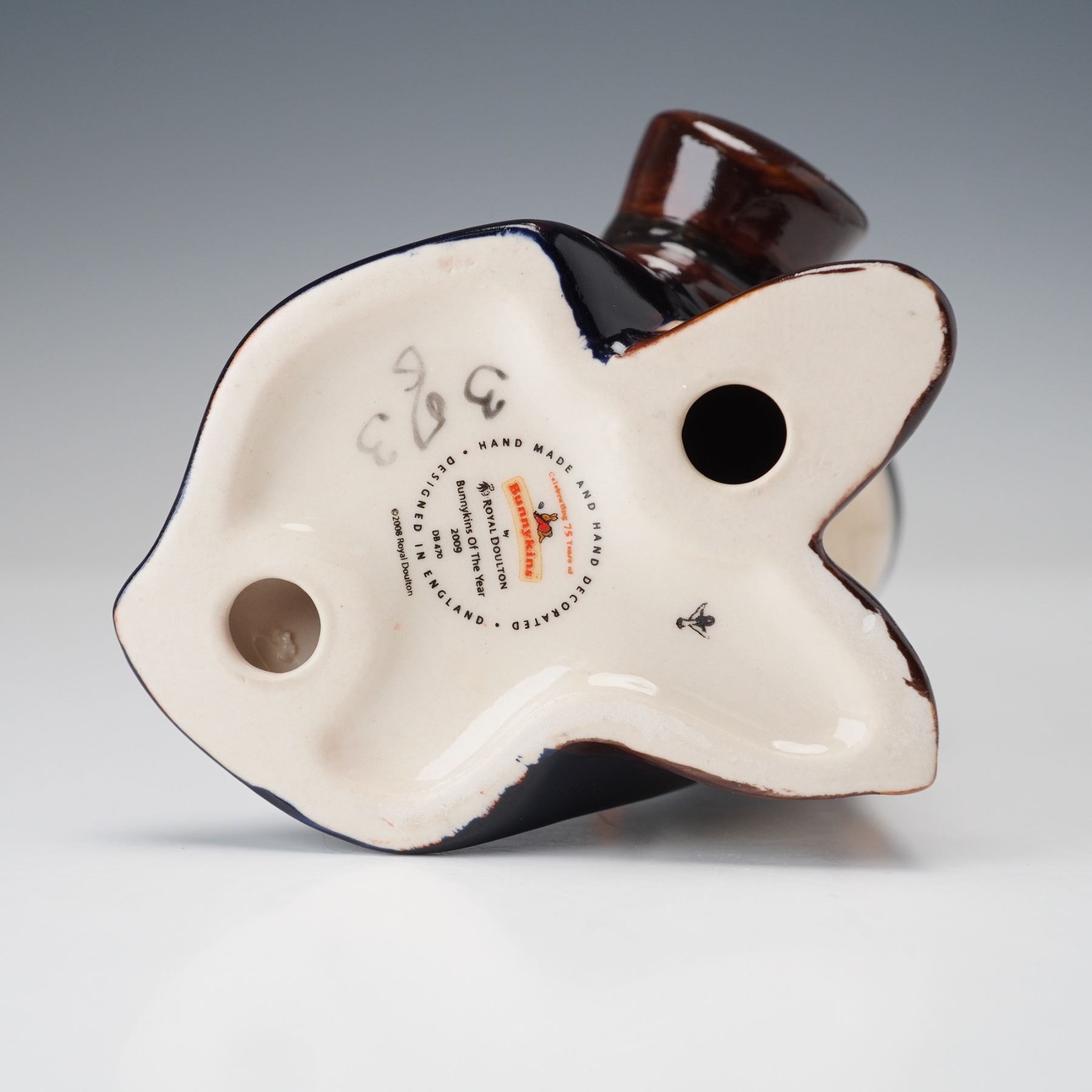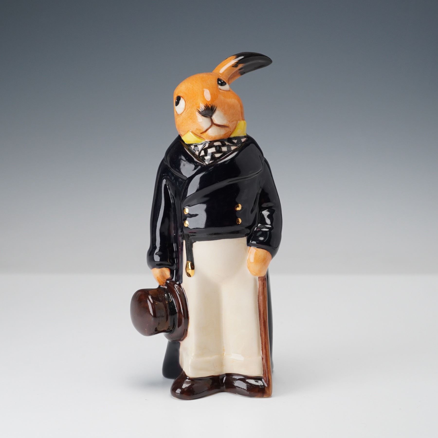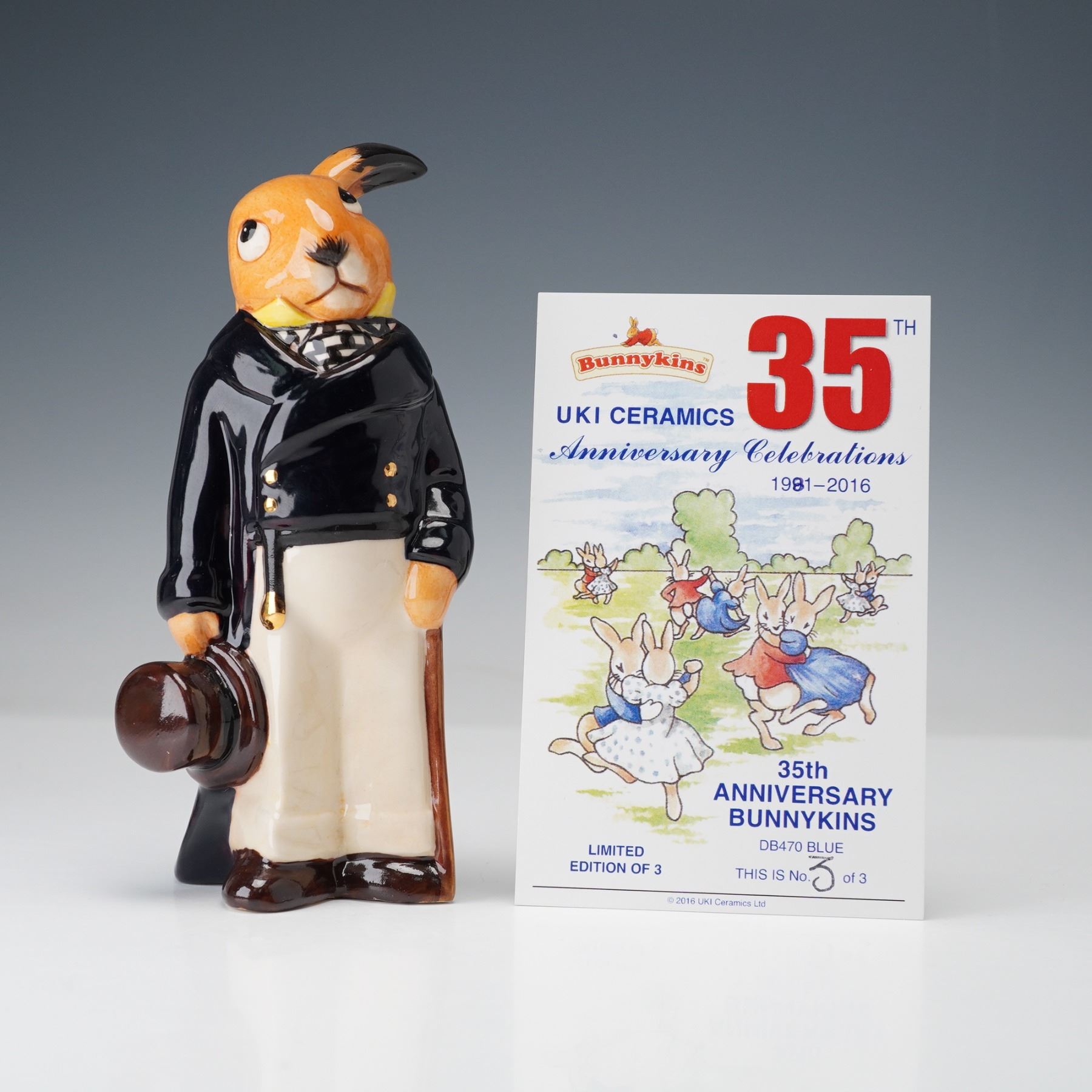 This figure, produced for the 35th Anniversary Celebrations of UKI Ceramics. Modeled as a standing rabbit in formal attire holding a bowler hat at its side. Blue, brown and yellow colorway with gold painted buttons. Produced exclusively for UKI Ceramics Ltd in an edition of only 3. Royal Doulton Bunnykins backstamp. Certificate of Authenticity included.