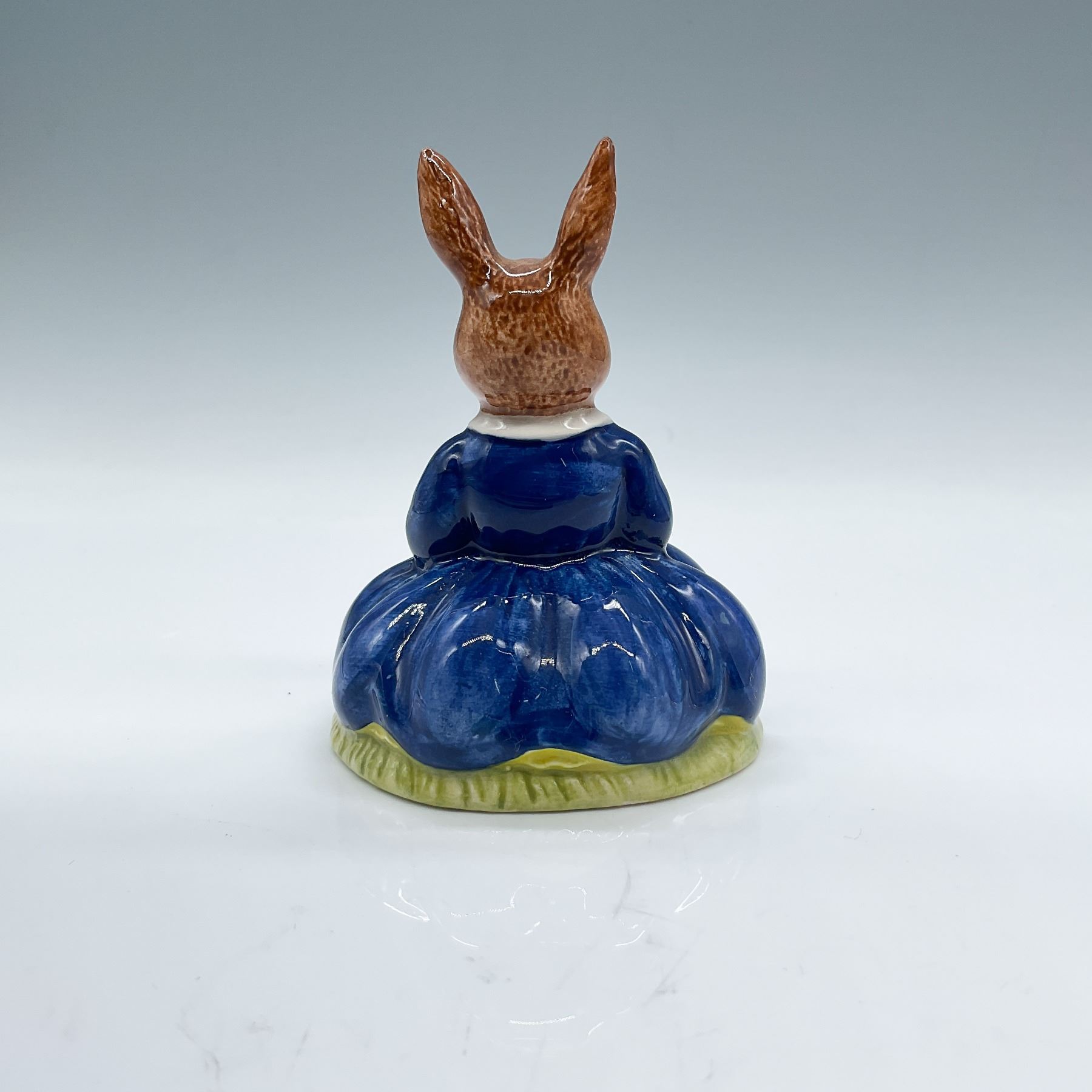 Charming Royal Doulton Bunnykins figurine titled "Daisie Bunnykins Springtime," model DB7, standing 3"H. Depicts Daisie Bunnykins in a vibrant blue dress, holding delicate flowers, with fine details and hand-painted accents. Backstamp includes "Royal Doulton Bunnykins" and "Springtime," along with copyright 1972 marking. A collectible piece showcasing the whimsical charm of the Bunnykins series, perfect for adding a touch of nostalgia and artistry to any collection.