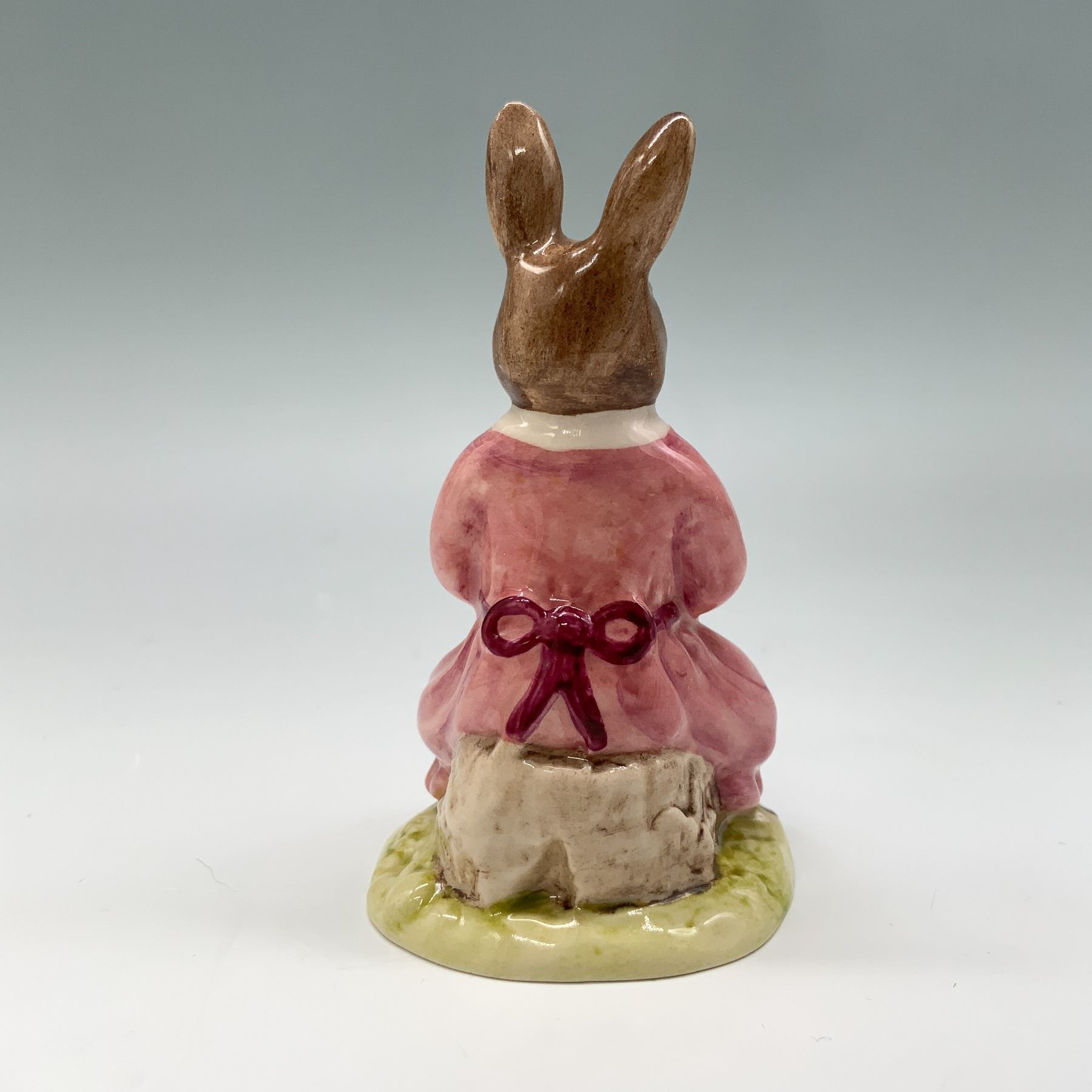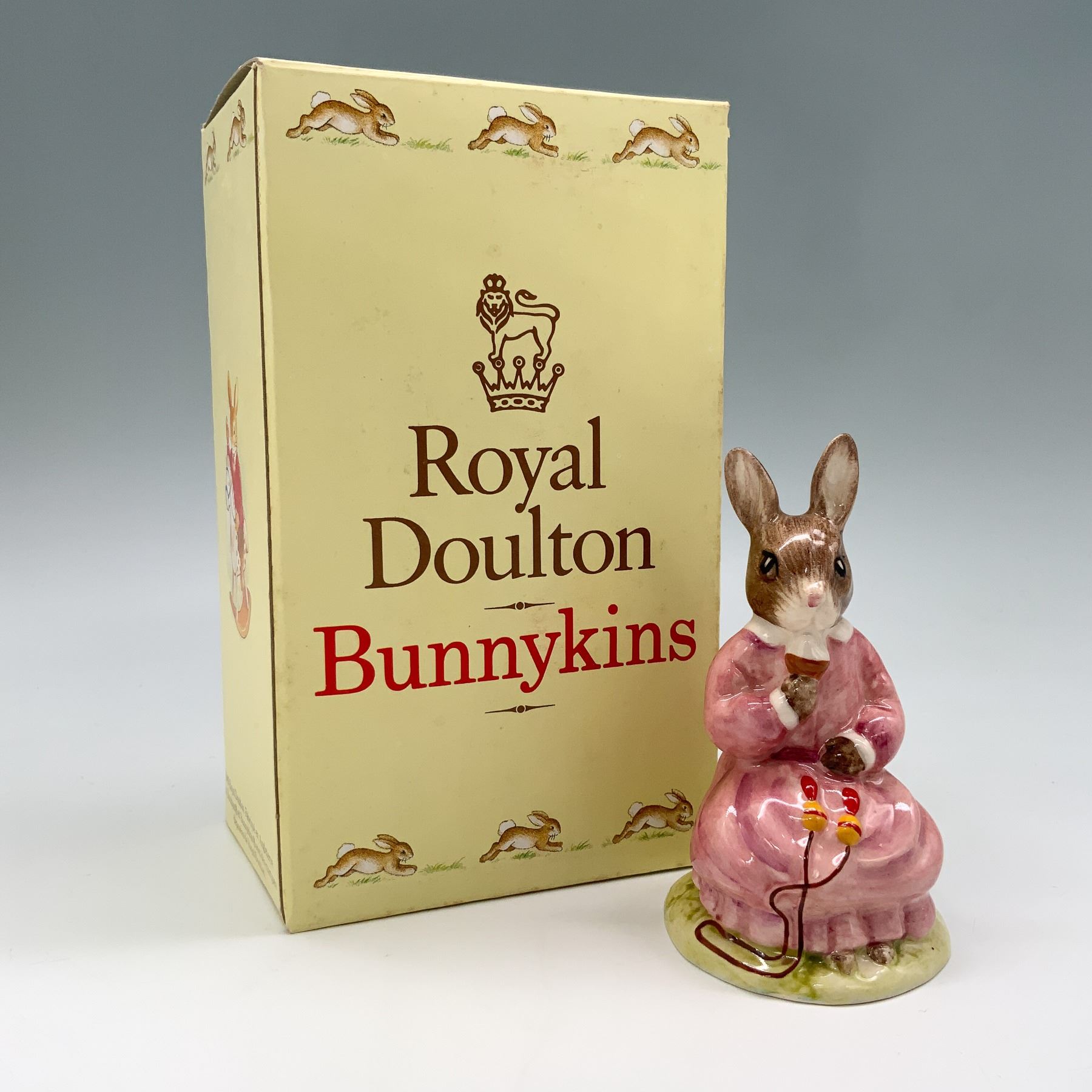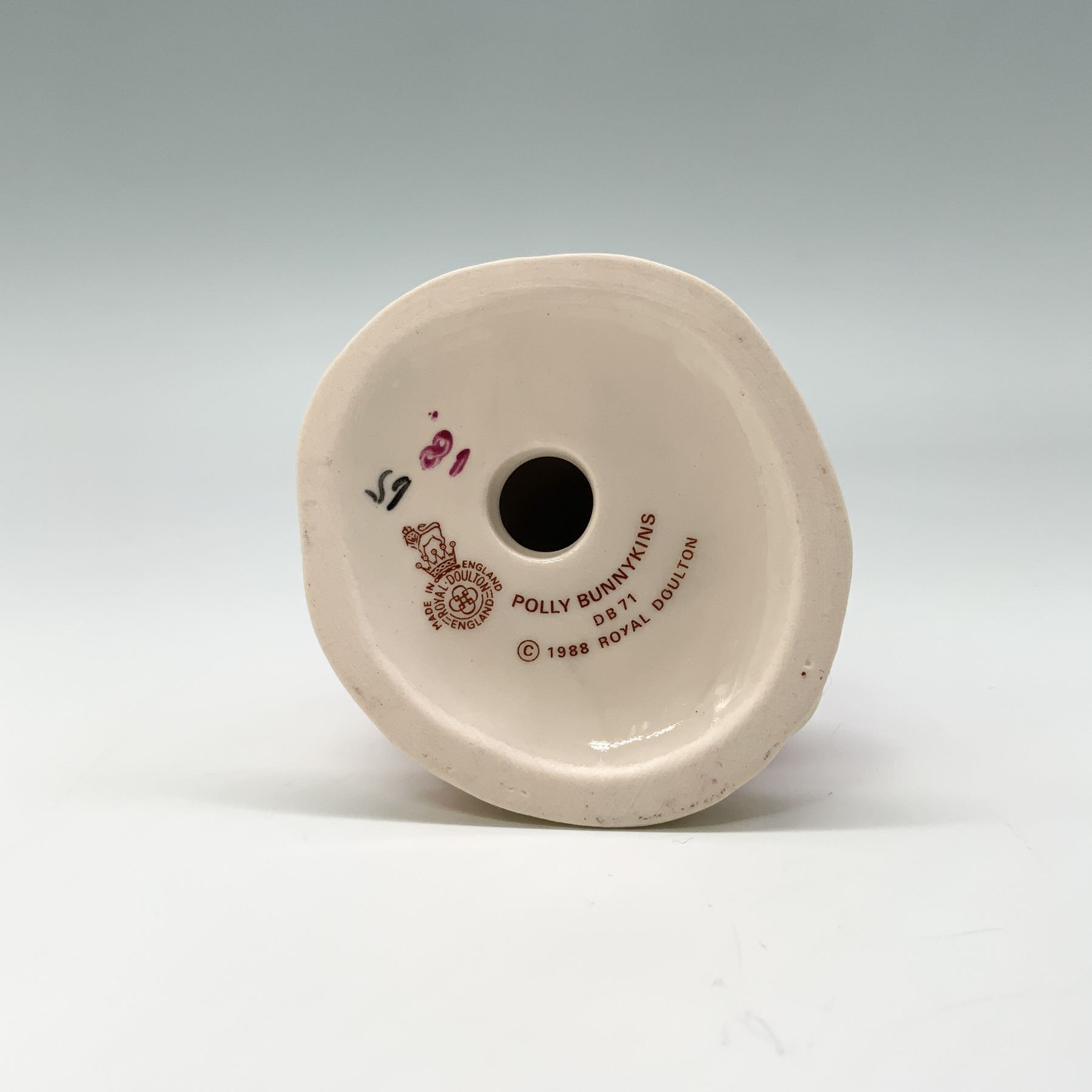 Charming Royal Doulton Bunnykins Polly DB71 figurine, featuring a seated rabbit wearing a pink dress. The figurine is marked on the underside with the Royal Doulton backstamp and copyright date of 1998. Comes with the original box, adding to its collectible appeal.