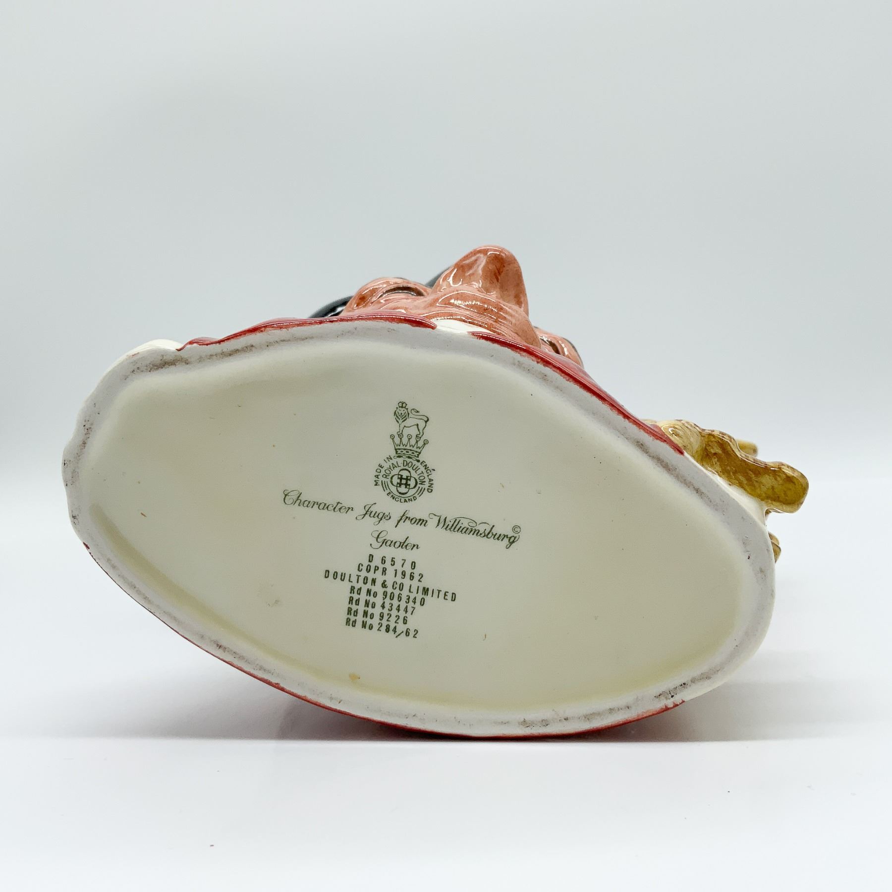 A Royal Doulton Character Jug featuring the Gaoler, model number D6570, introduced in 1962. Designed with intricate detail, this jug depicts the Gaoler with a large key, symbolizing his role. The piece showcases hand-painted features and a glossy finish. Measuring approximately 7.25 inches in height, this character jug is part of the renowned Williamsburg series, making it a valuable collectible. The backstamp confirms its authenticity and date of production.