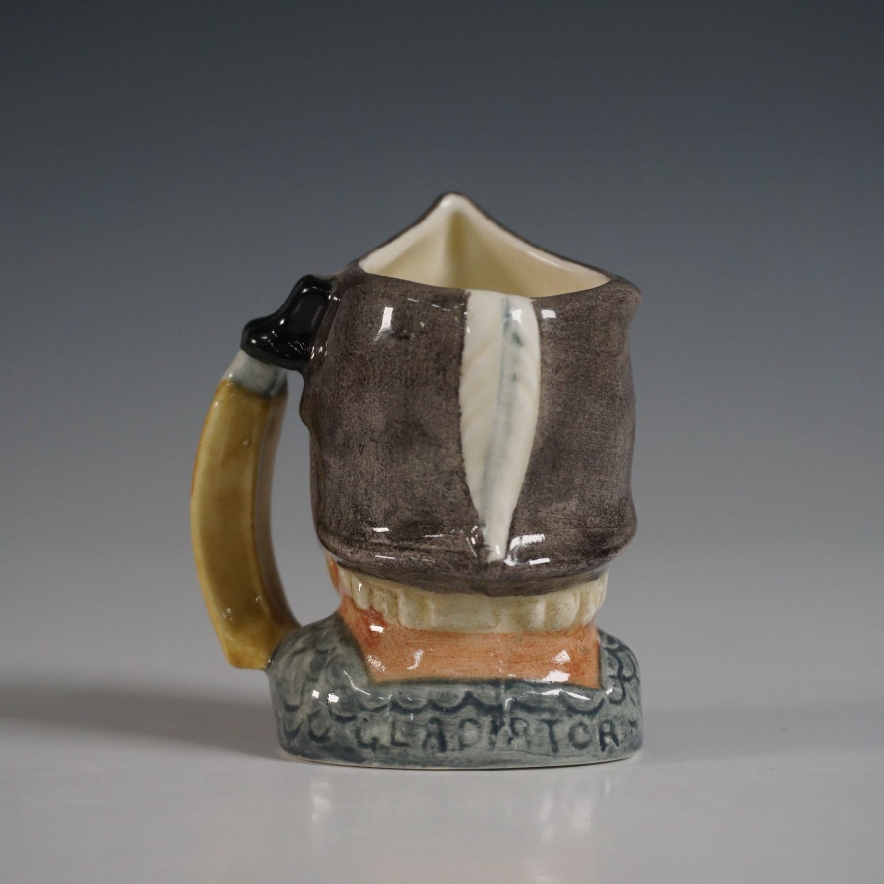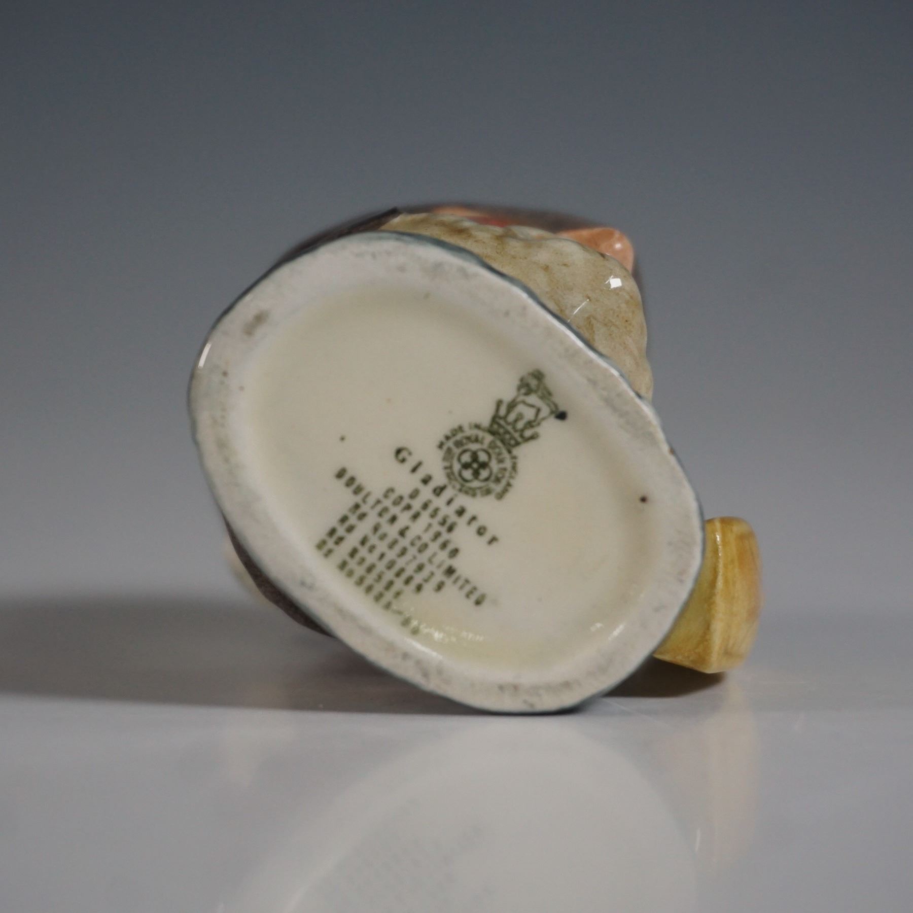 A Royal Doulton miniature character jug depicting a Gladiator, model number D6556. This finely crafted ceramic jug features a Roman gladiator in a detailed helmet, with a handle designed to resemble a gladiatorial weapon. Part of Royal Doulton's character jug series, this piece exemplifies the brand's renowned craftsmanship and attention to historical themes. The base is marked with the Royal Doulton backstamp and additional identifying details.