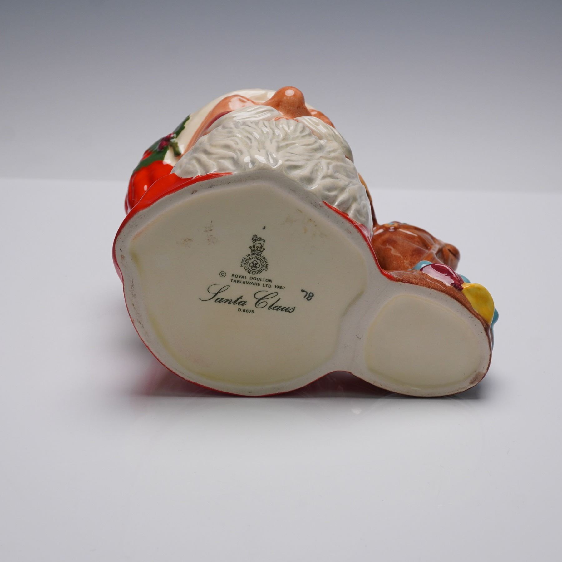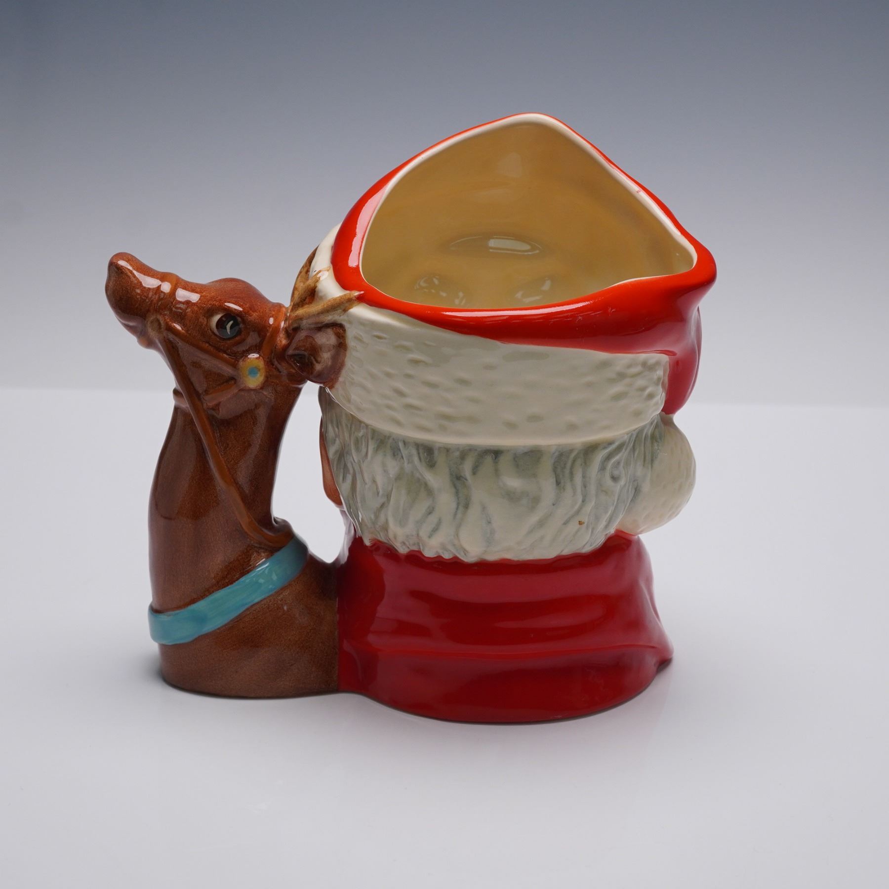 Royal Doulton character jug D6675, Santa Claus, issued in 1982. This festive jug portrays Santa in traditional red hat and white beard, with the handle modeled as a reindeer decorated with a bow and bells. Hand painted in glossy finish and marked with the Royal Doulton backstamp on the base.