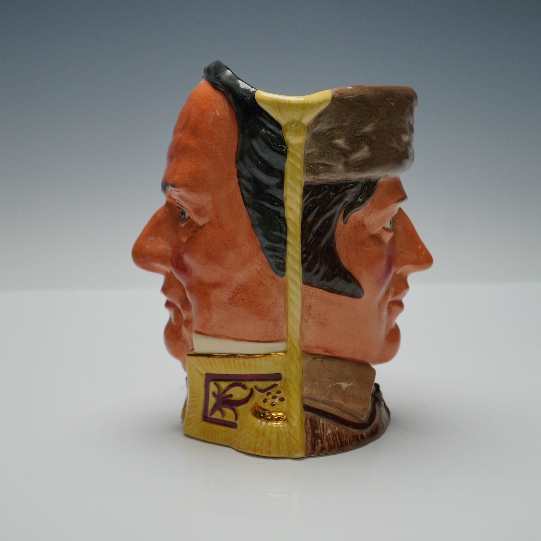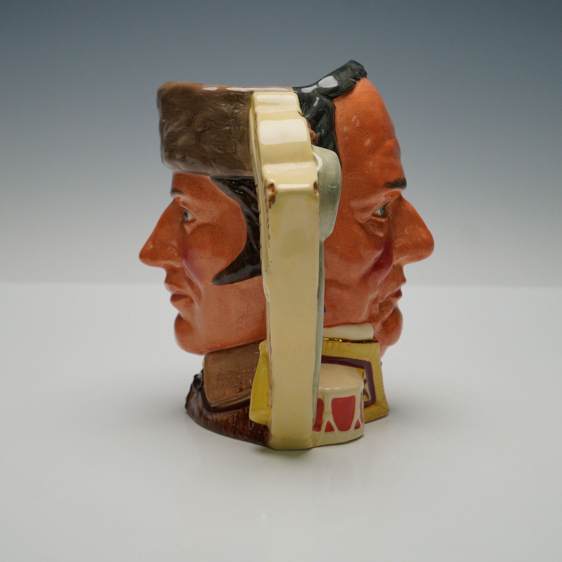 Royal Doulton character jug The Battle of the Alamo D6729, issued in 1984 as part of The Antagonists Collection. This limited edition jug depicts the opposing figures of Davy Crockett and General Antonio Lopez de Santa Anna, designed by Michael Abberley. The handle is decorated with the word Alamo, symbolizing the famous 1836 battle. Numbered 4559 of 9500, with Royal Doulton backstamp and limited edition details on the underside.