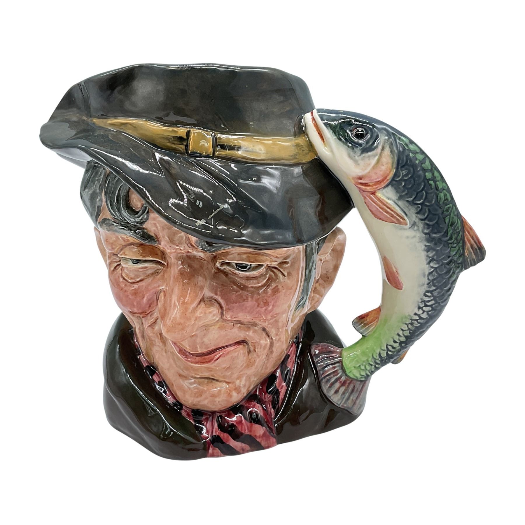 D6429. Hand painted figural jug of a man in a brown-green coat, a red scarf with black stripes, and a gray-yellow fishing hat. A trout forms the handle. Royal Doulton backstamp.
