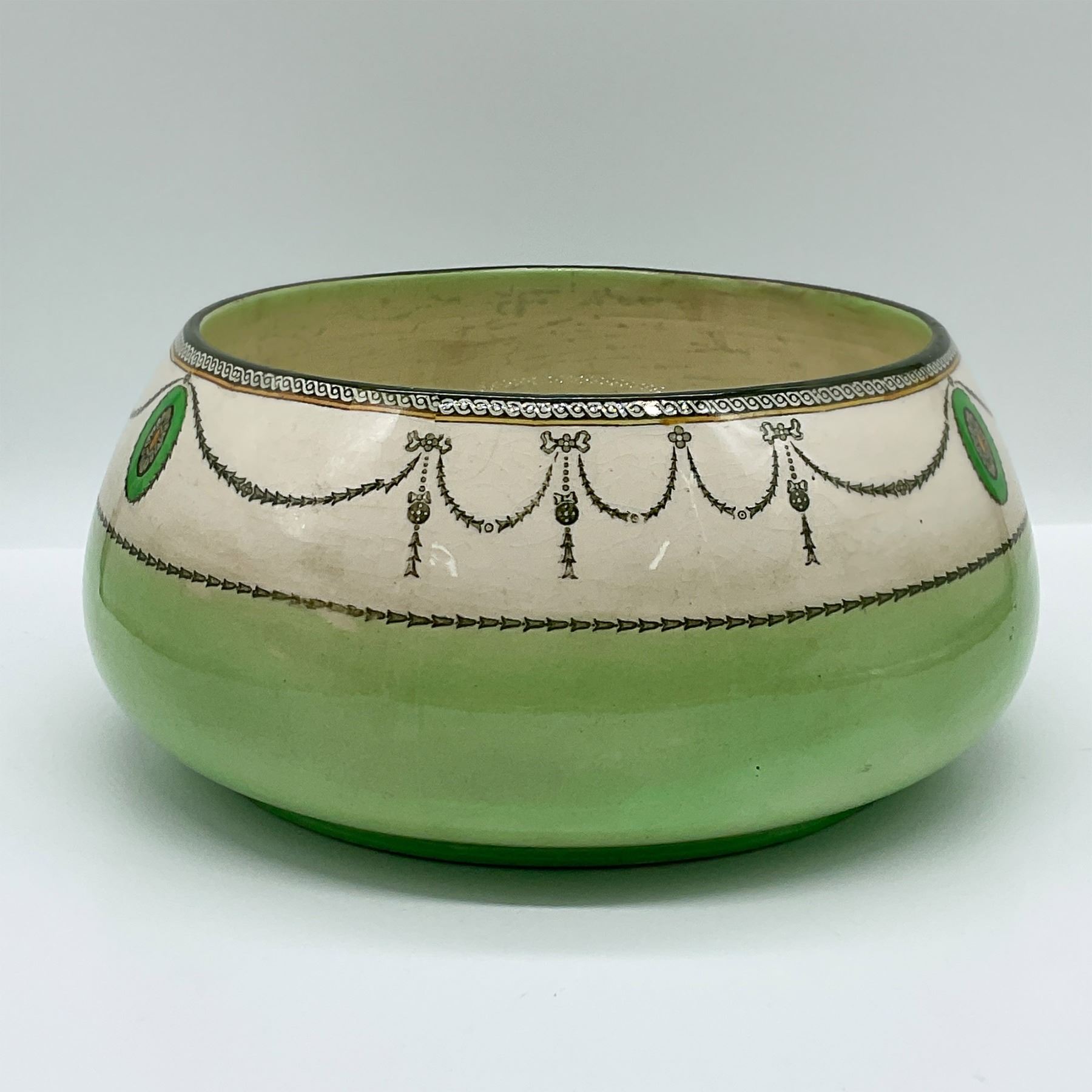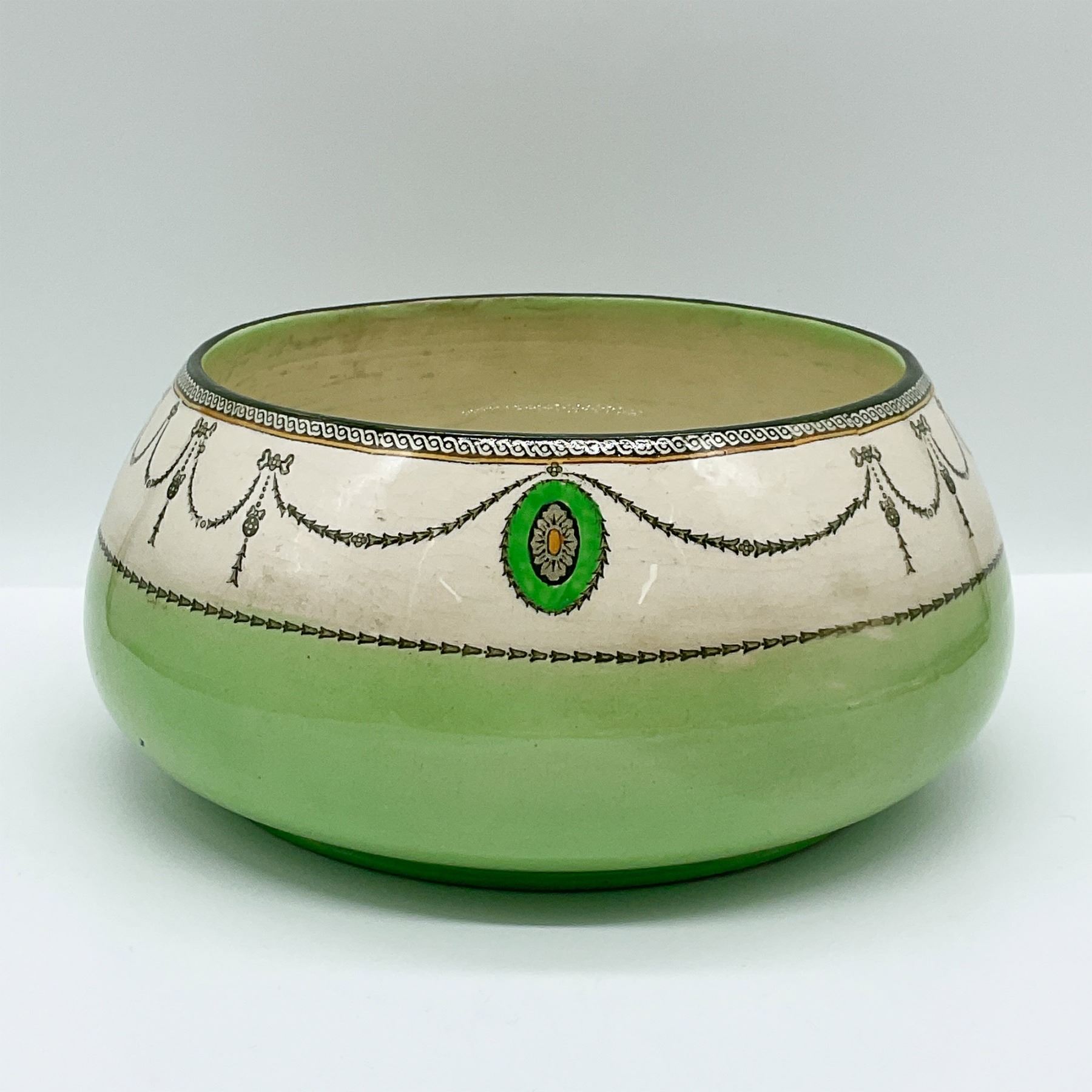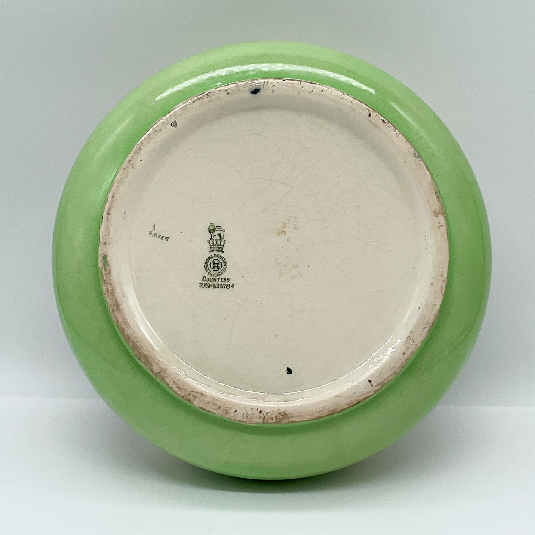 This elegant Royal Doulton bowl features the refined Countess pattern, with the design registered under number 523784. Crafted in England, this piece showcases a graceful combination of green and ivory tones, complemented by intricate garland and medallion motifs encircling the rim. The delicate gold trim further enhances its timeless appeal. Measuring 3.75 inches in height, this bowl embodies the exceptional quality and artistry synonymous with Royal Doulton. Perfect for collectors of fine porcelain or as a decorative accent in any sophisticated setting.