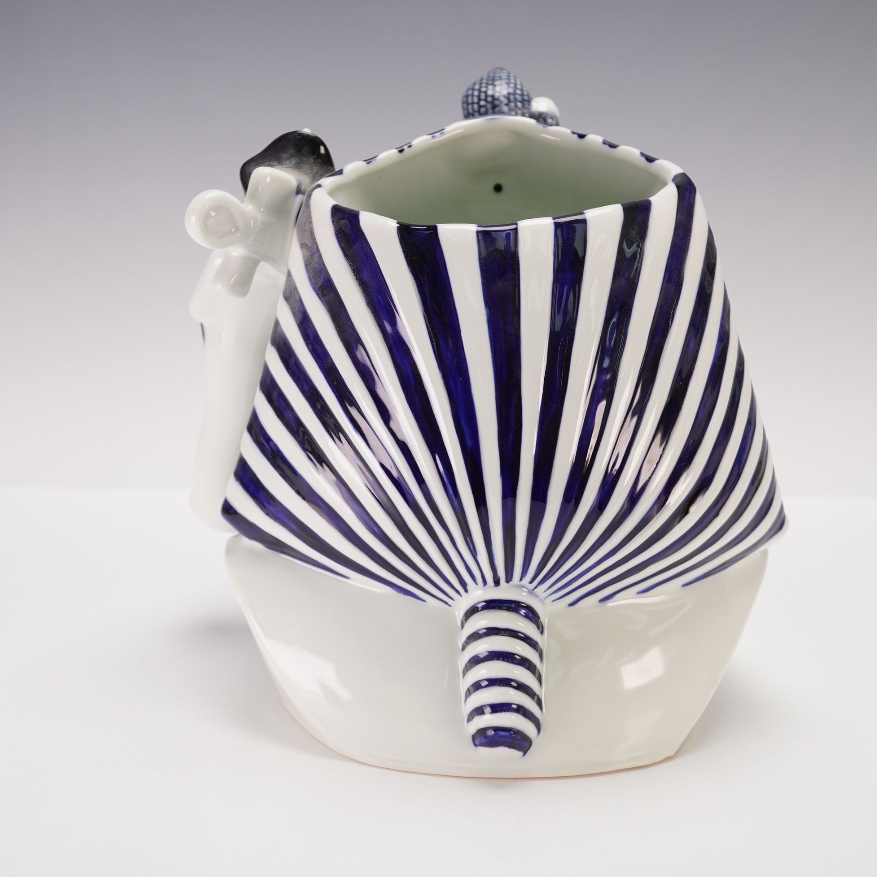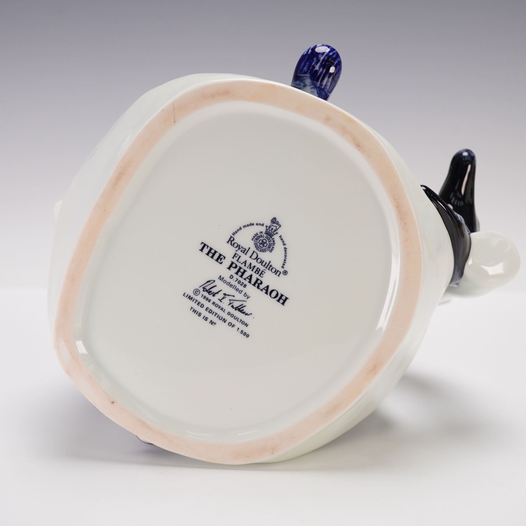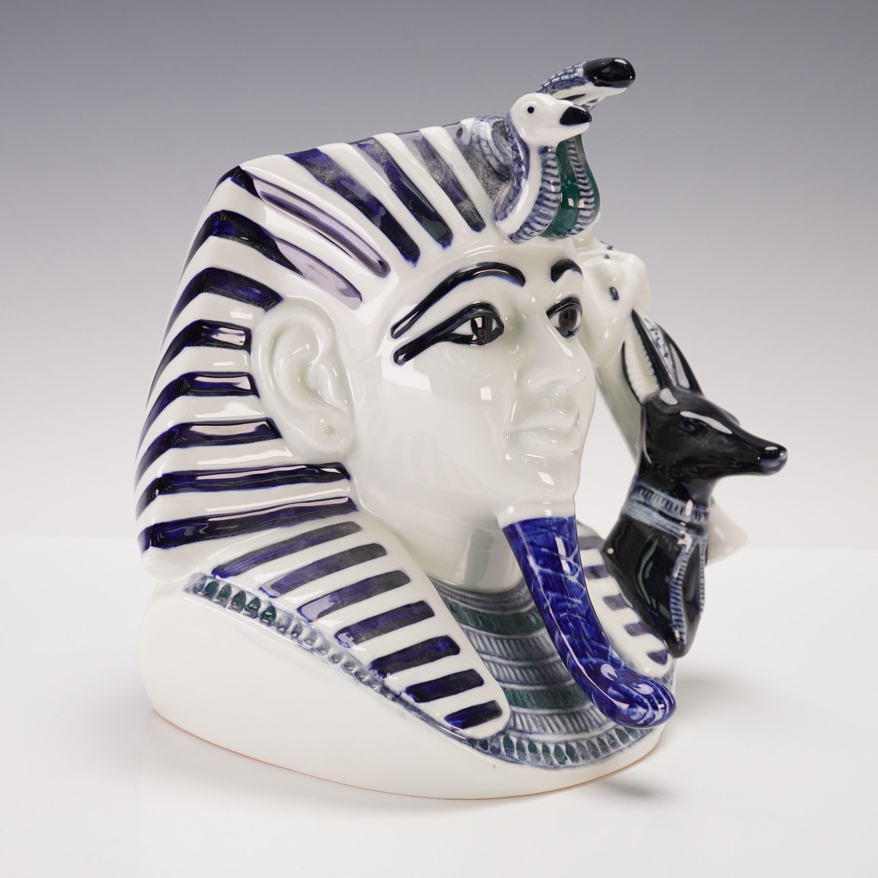 This factory proof character jug is modeled in the distinctive Blue Flambe colorway, combining blue, white, and black tones. The jug depicts an Egyptian Pharaoh with striking detail, from his iconic striped headdress to the intricately sculpted cobra on top. Symbol Ankh, Shawabty, and the head of Anubis handle enhance the design. A limited edition piece, this jug is part of Royal Doulton's exclusive character jug collection and features the backstamp along with the limited edition numbers although the edition number is not filled in.