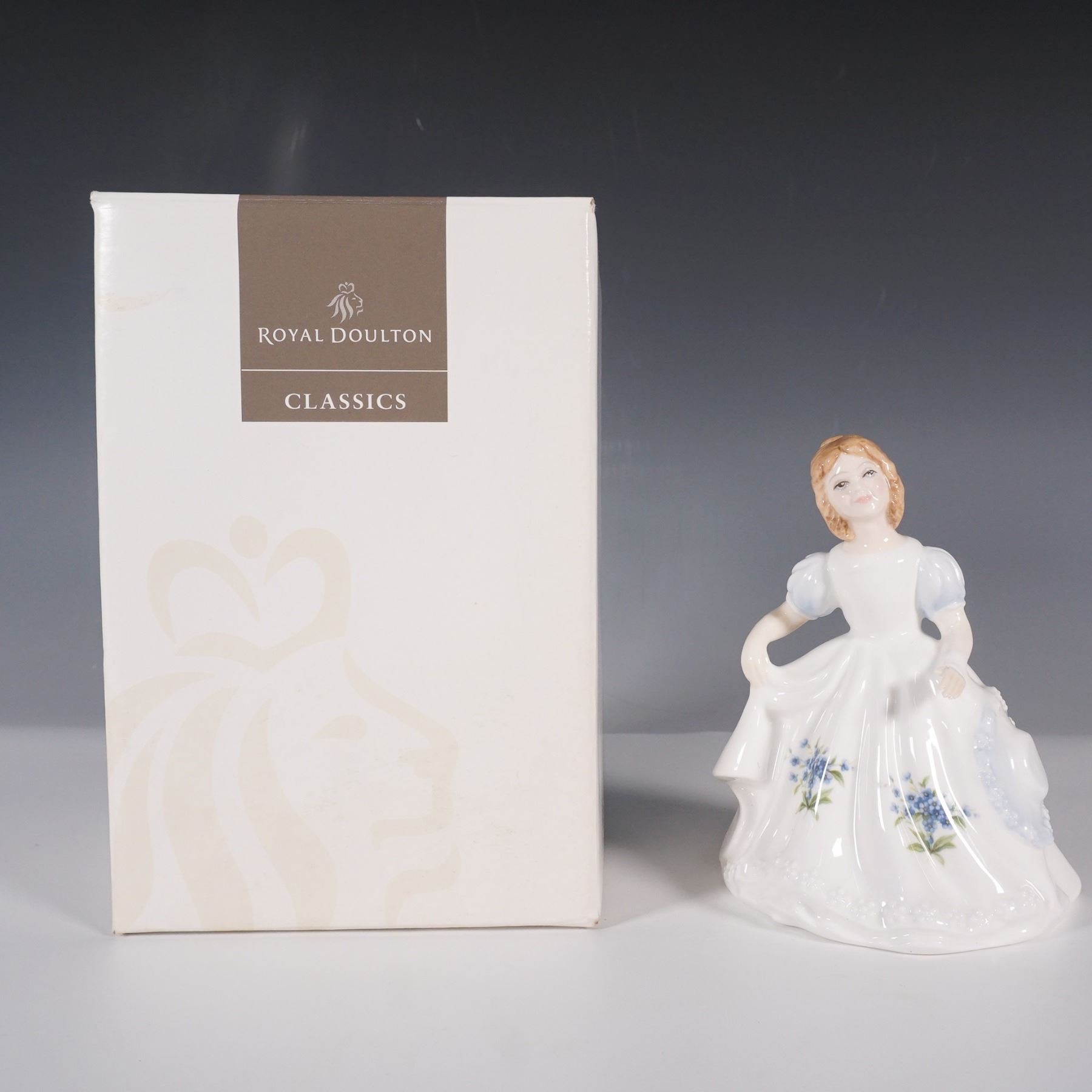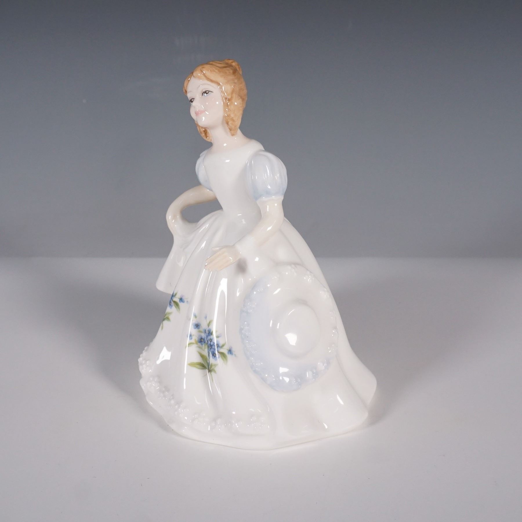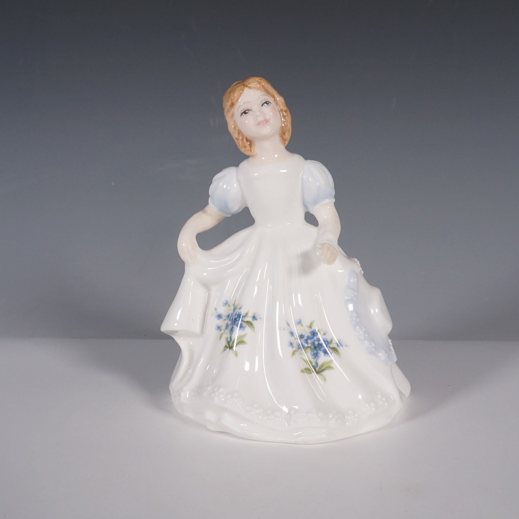 The Figure of the Month - July figurine (HN3324) was issued in 1990 as part of Royal Doulton's Figure of the Month series. Designed by Robert Tabbenor, this delicate bone china piece features a young girl in a flowing white gown adorned with hand-painted blue floral accents. Her gentle expression and elegant pose, lifting the hem of her dress, capture the charm of the series. The base bears the Royal Doulton backstamp, confirming authenticity. Includes original box.