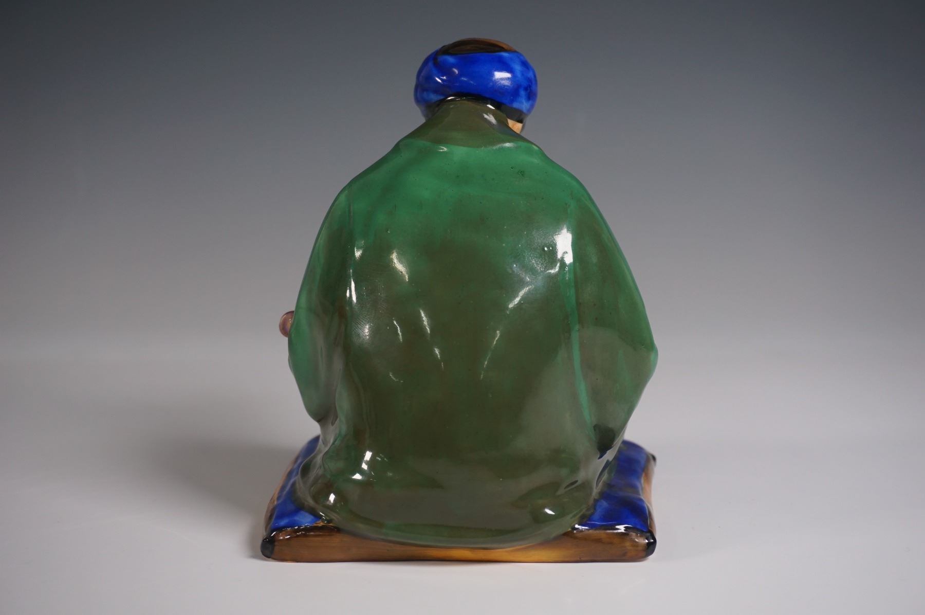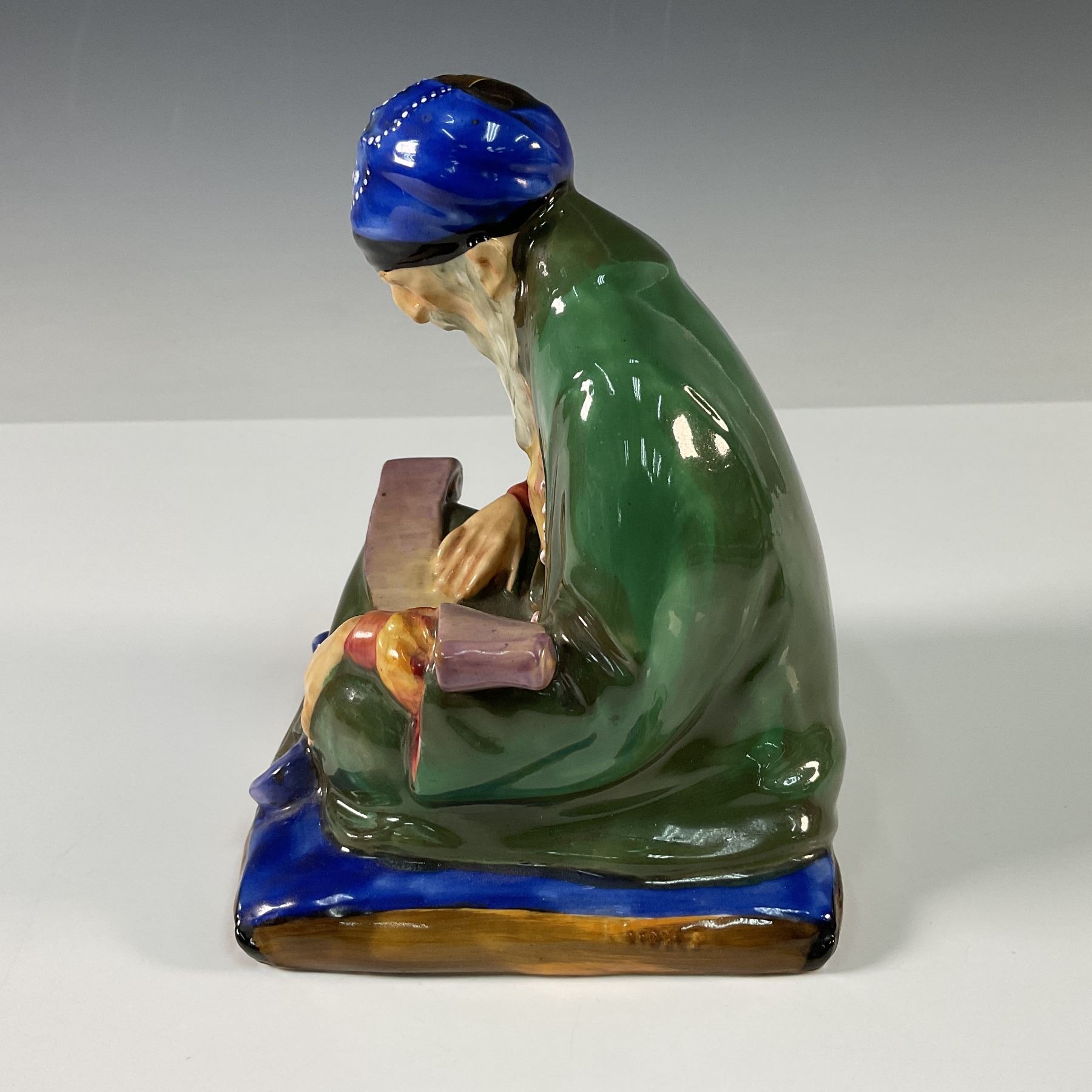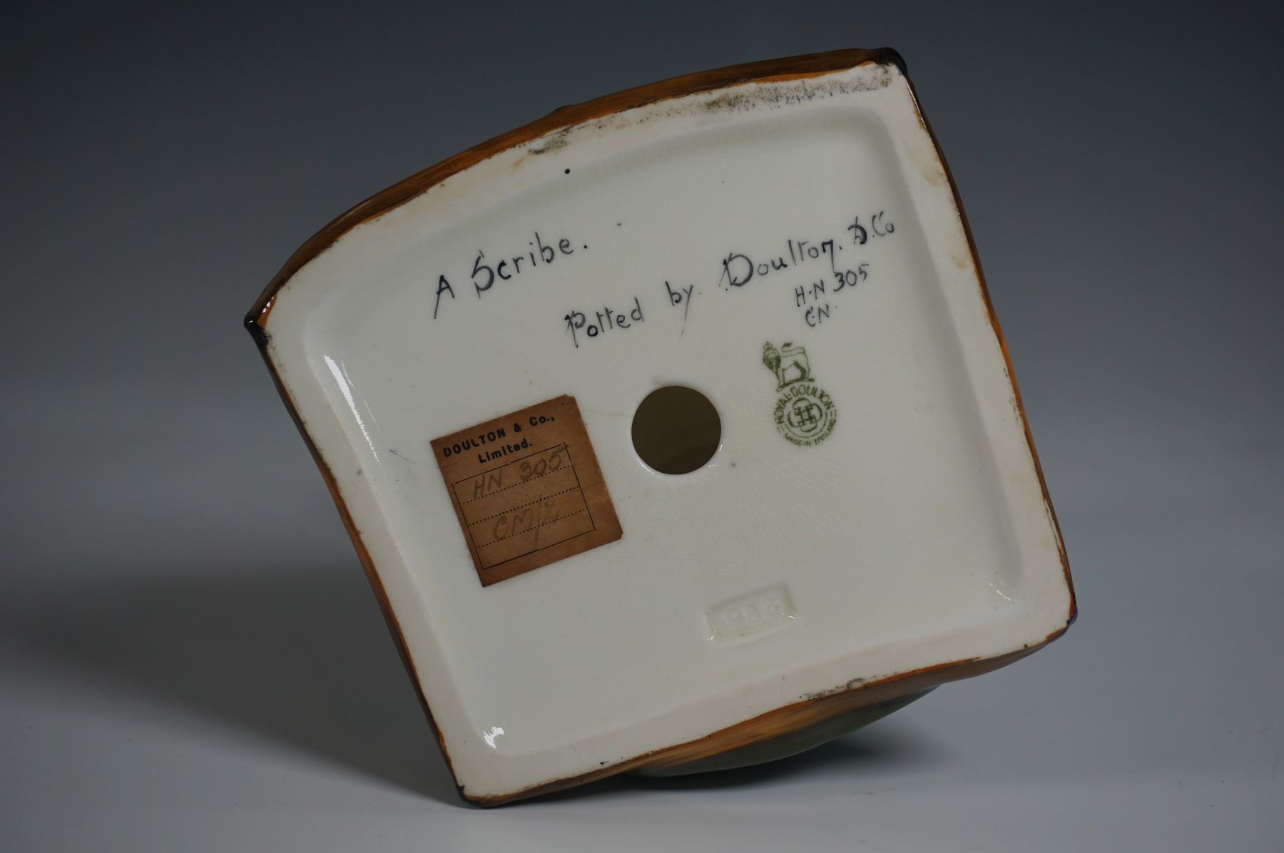 This Royal Doulton figurine was designed by renowned artist Charles J. Noke. The figure depicts a scribe seated with a scroll in his hands, dressed in rich robes with intricate detailing. The vibrant color palette includes shades of green, blue, and gold, highlighting the fine craftsmanship of the piece. Introduced as part of Royal Doulton's collectible figurines, this item embodies the historical and cultural significance often depicted in Noke's work. Royal Doulton backstamp. Noke signed on the side.