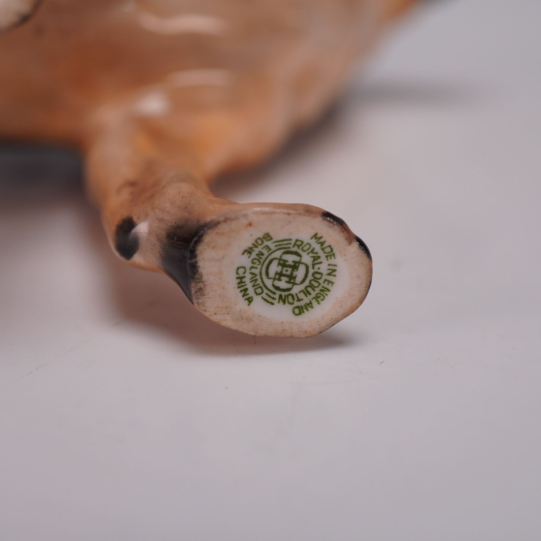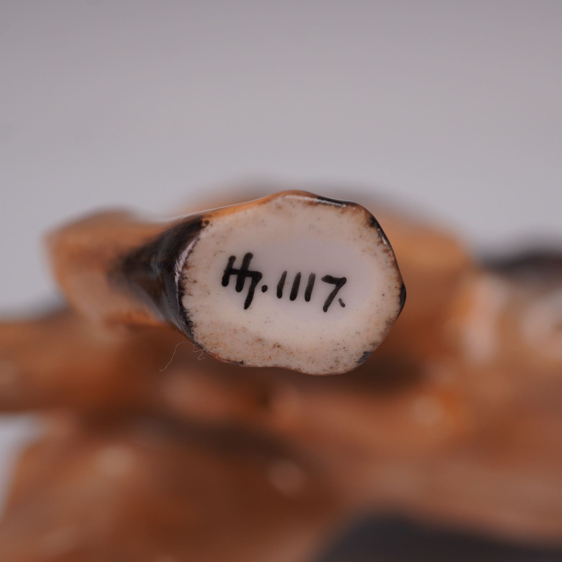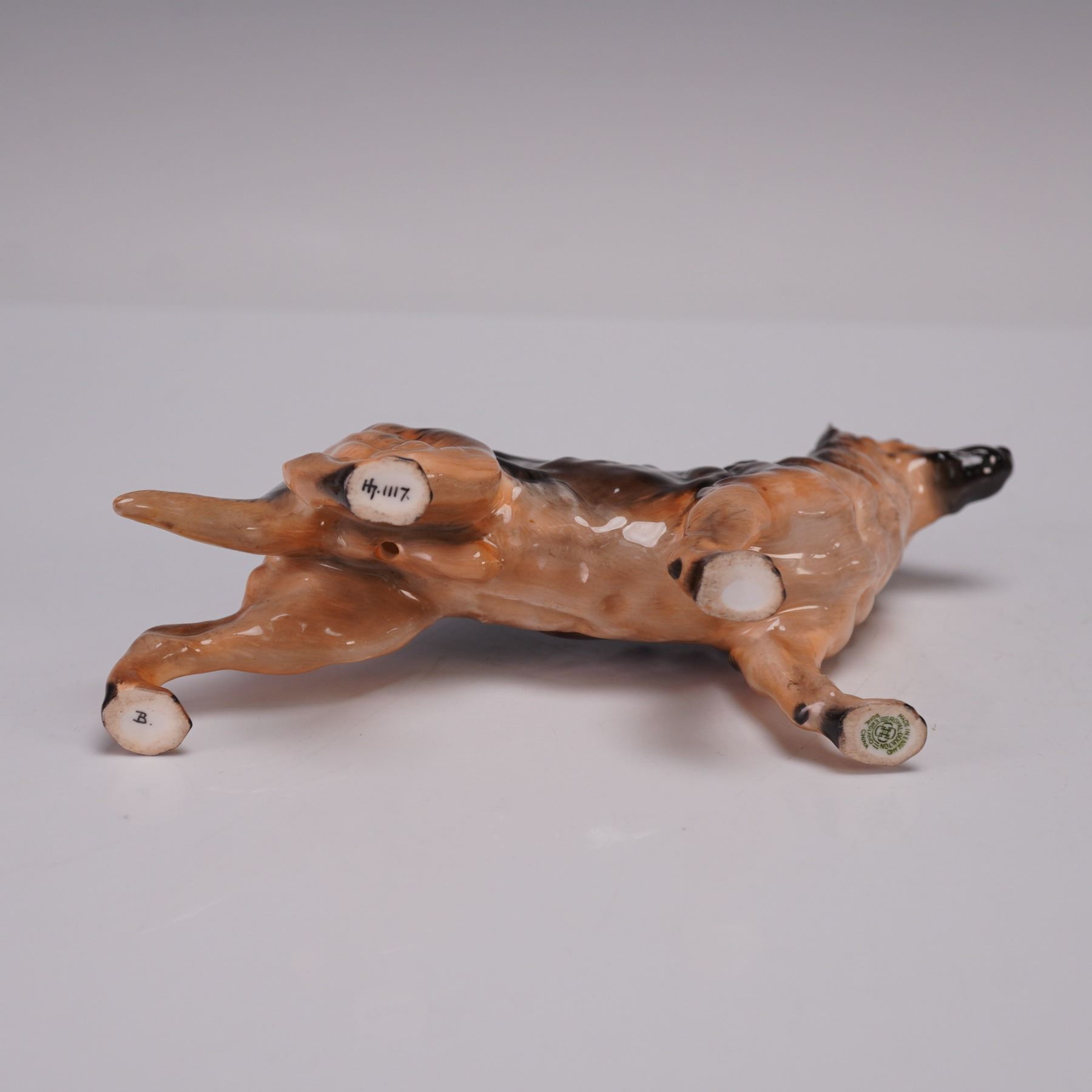 Strong lines and a glossy hand painted coat define this Royal Doulton Alsatian, model HN1117, in the small size and designed by Frederick Daws. The figure stands alert with pricked ears and a natural tan and brown body shaded with black along the back and muzzle. Underside with the green Royal Doulton bone china backstamp and hand inscribed HN1117 to the paw. A classic breed study with lifelike stance and clean detailing throughout.