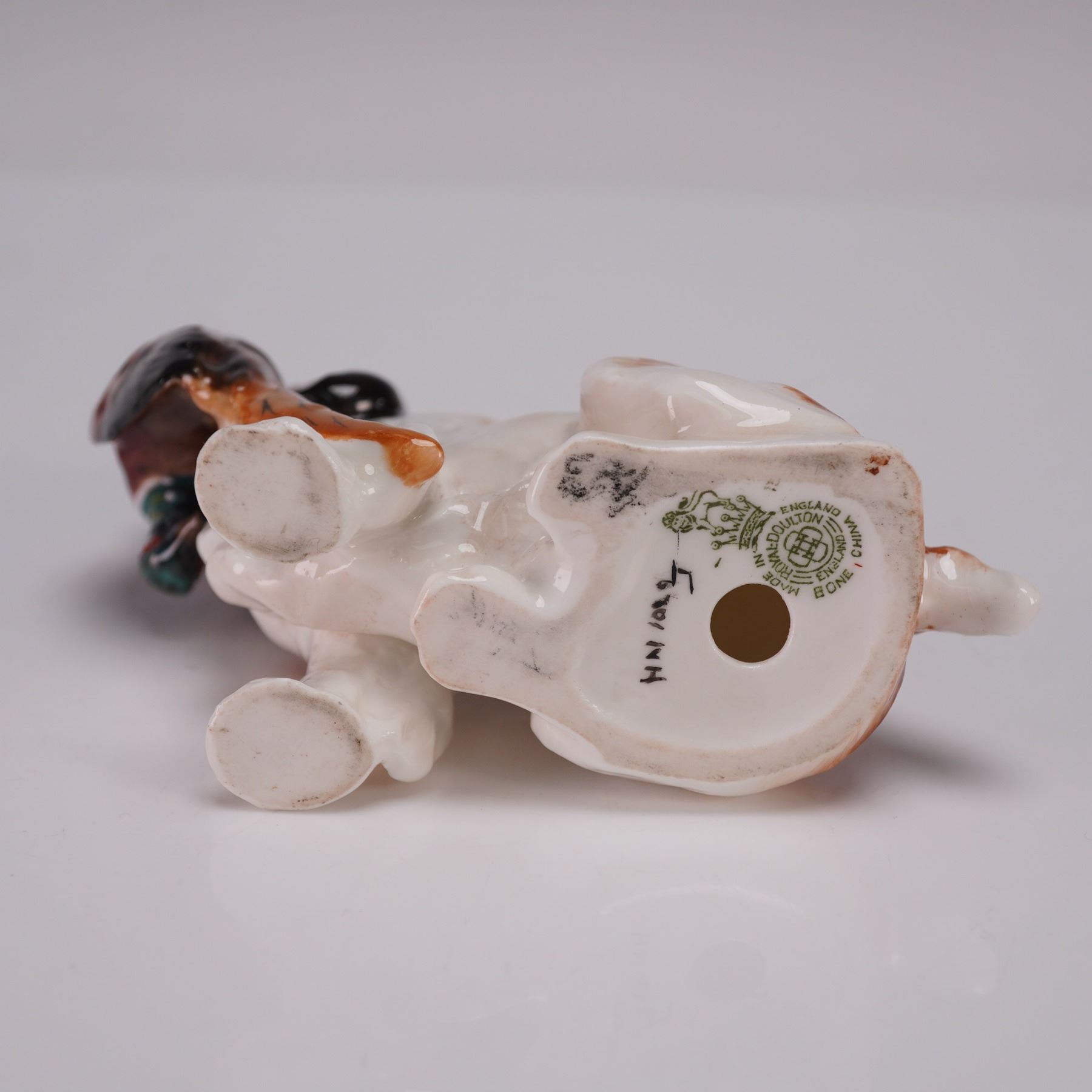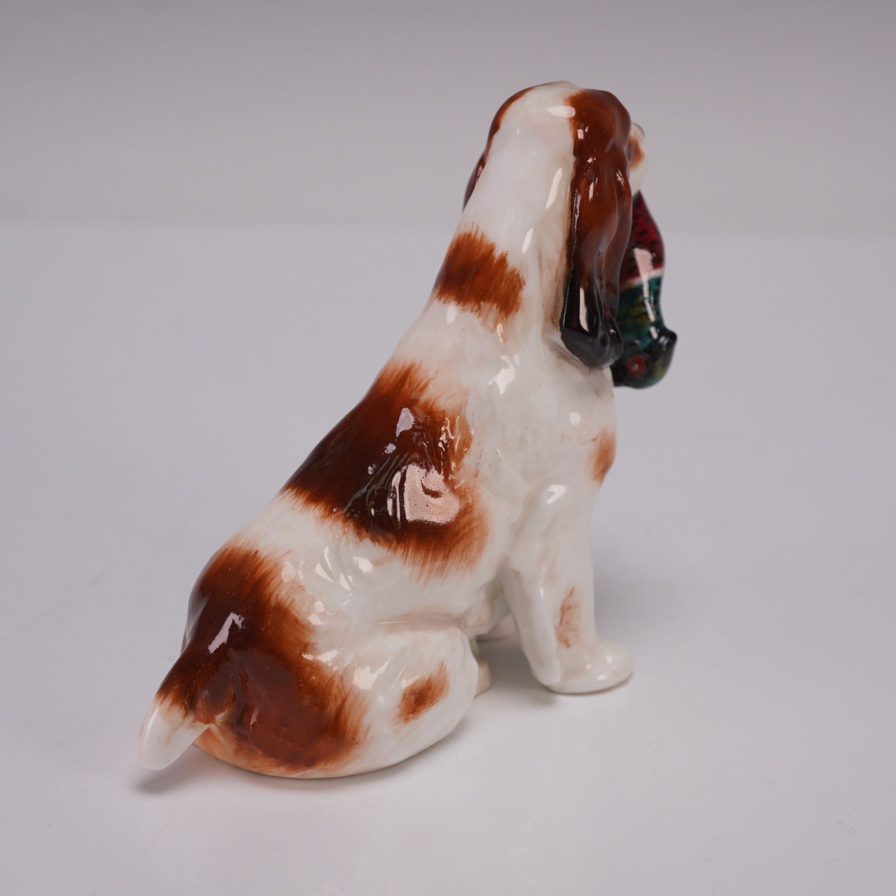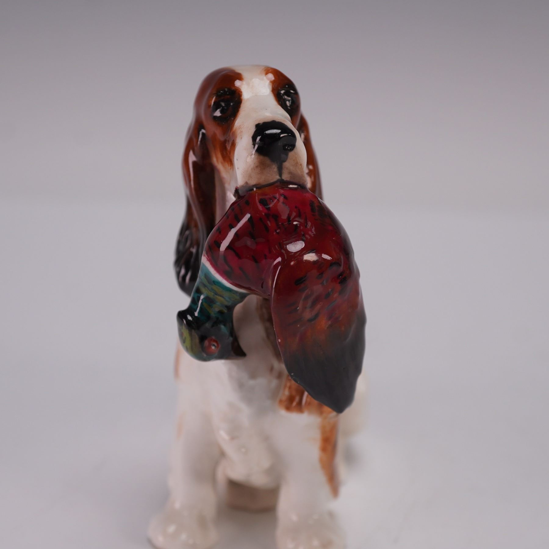 A finely hand painted Bone China figurine depicting a seated spaniel with a pheasant held carefully in its mouth, rendered in naturalistic tones of brown, white, and russet with vibrant plumage detail to the bird. Handwritten HN number. Royal Doulton backstamp.