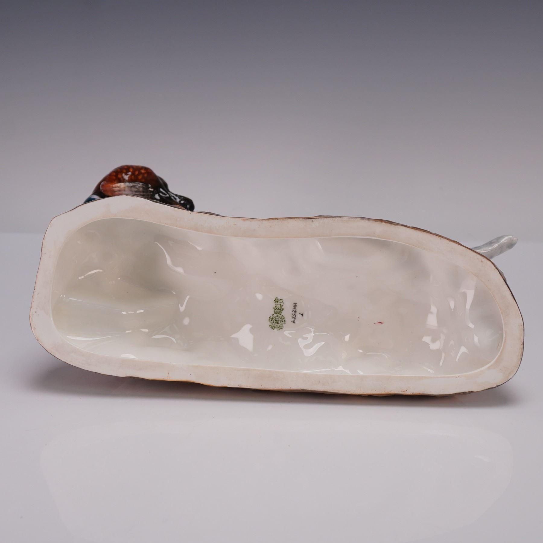 A porcelain figurine depicting an English Setter posed upon a rocky base with a game bird clasped in its mouth, executed with lifelike detail and a rich glossy glaze. The coat of the dog is rendered in mottled tones of white and black with subtle tan markings, while the bird displays vivid plumage of red, green, and brown, enhancing the dynamic composition. Handwritten HN number. Royal Doulton backstamp.