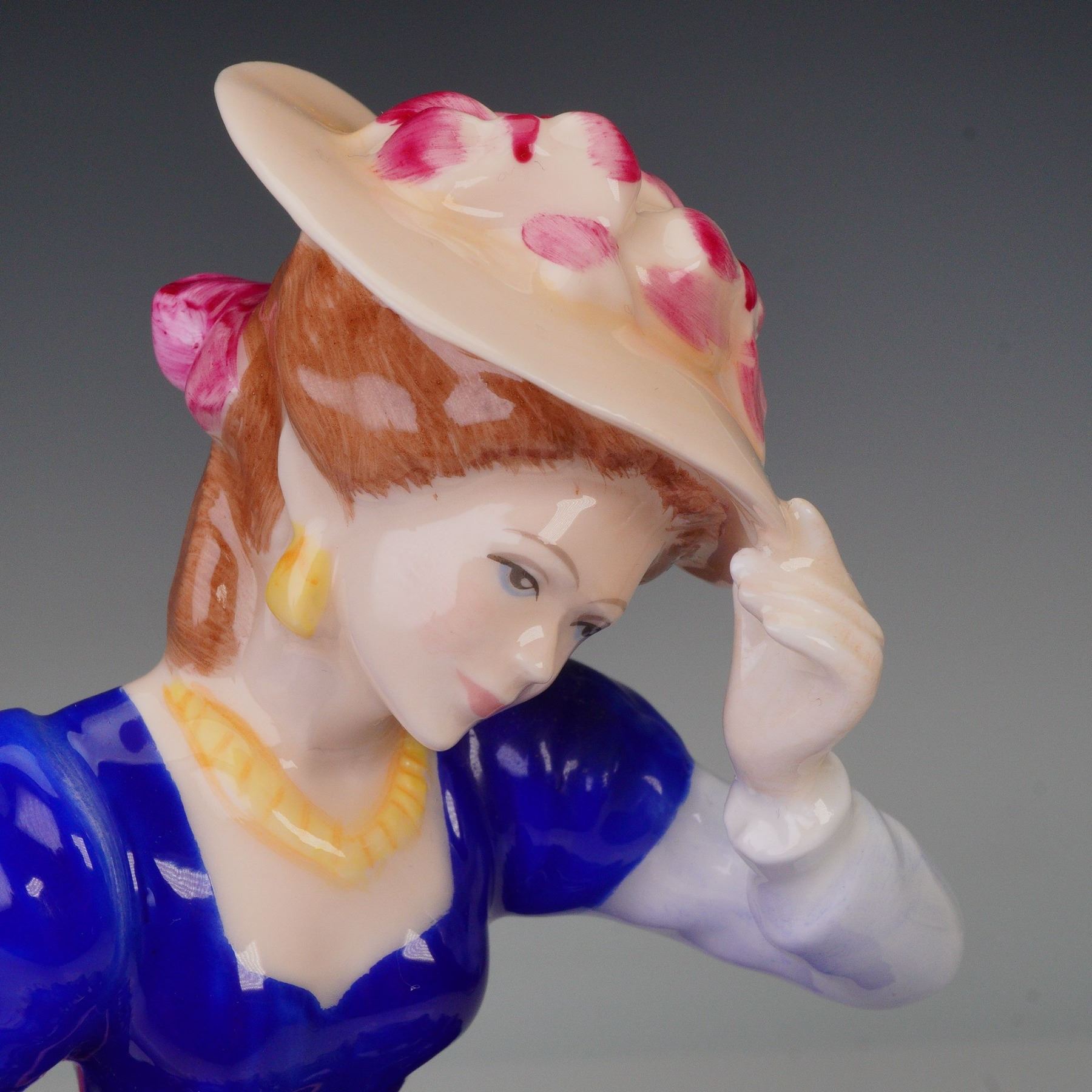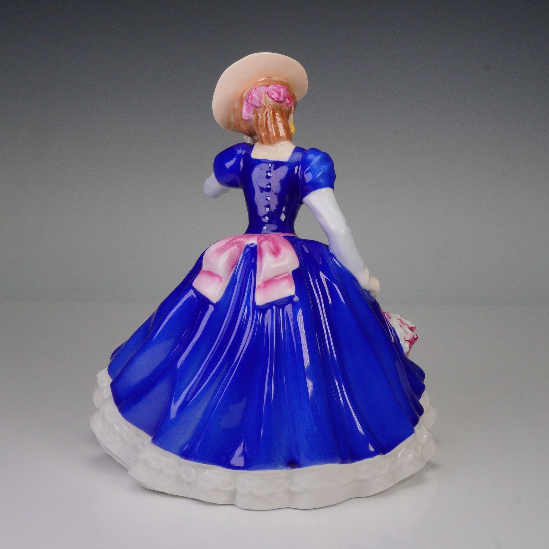 This Royal Doulton figurine Figure of the Year Mary (HN3375) depicts a woman in a blue gown with detailed accents on her dress, hat, and parasol. Released as part of the Figure of the Year series, it highlights the craftsmanship of Royal Doulton. The base features the Royal Doulton backstamp and series insignia.