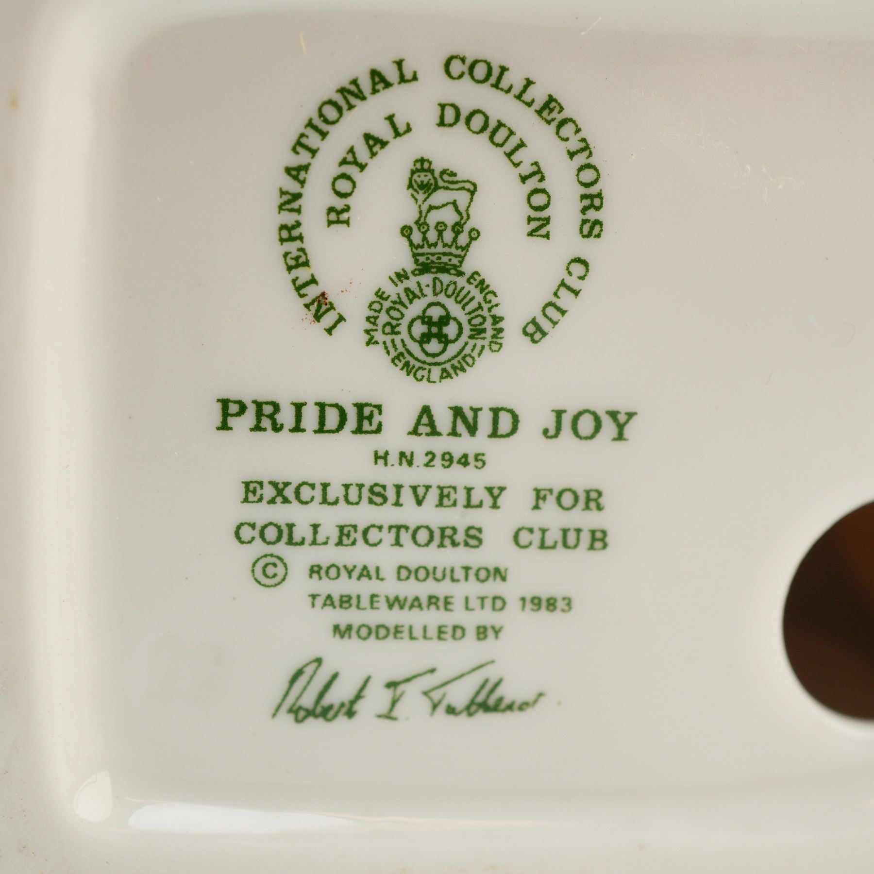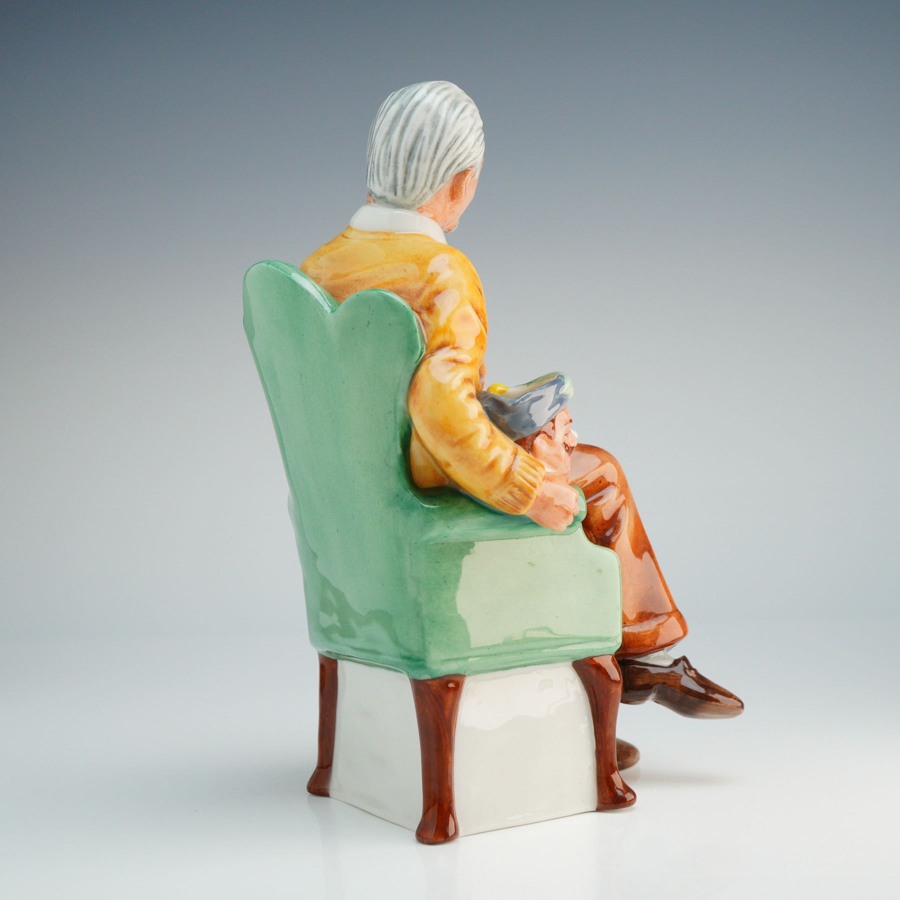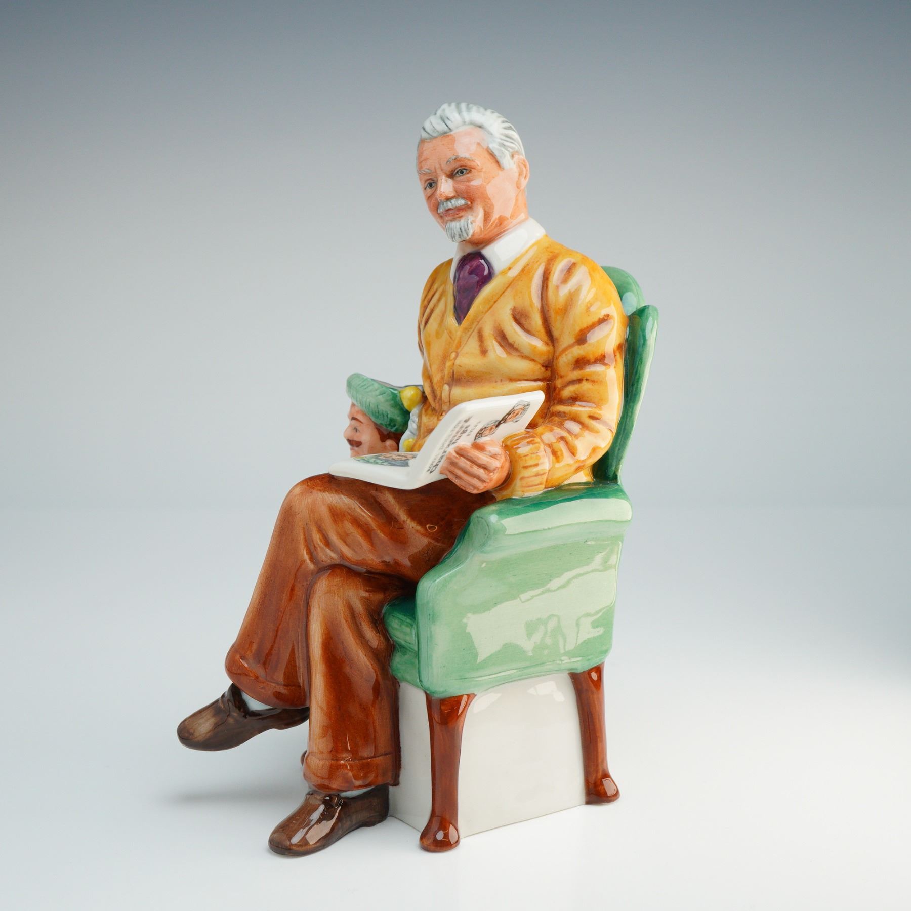 A Royal Doulton commissioned exclusively for the International Royal Doulton Collectors Club in 1983. The piece depicts an elderly man with silver hair and a goatee, dressed in a yellow cardigan, purple tie, and brown trousers, seated in a green upholstered armchair. He holds an open book featuring an illustration, while a smaller character figure is nestled beside him in the chair. The base carries a complete green printed backstamp detailing the title, model number, year of production, and the sculptor, Robert I. Tabbenor.