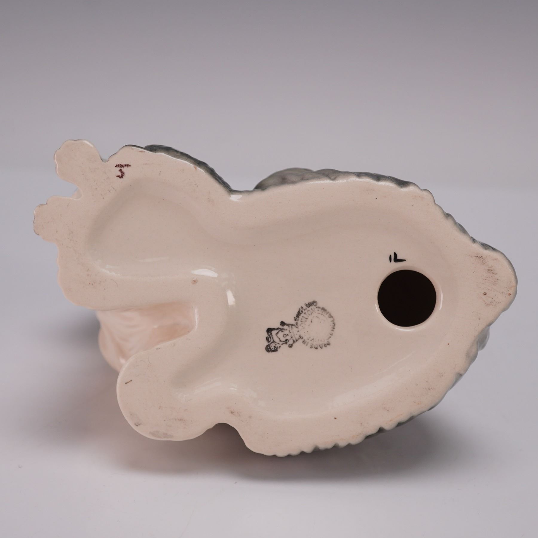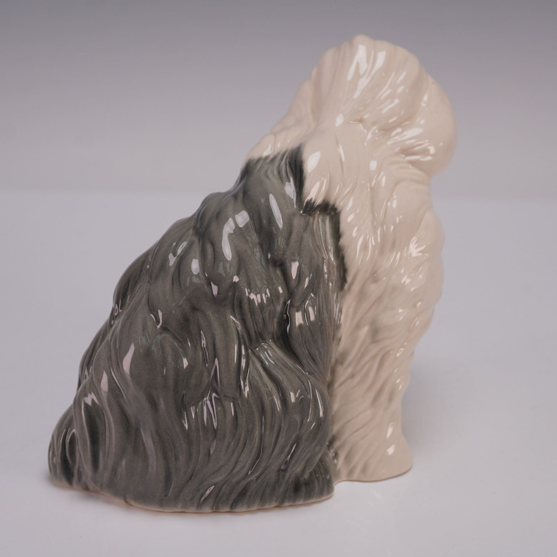A charming figure of a seated sheep dog and its pup. Hand painted in grey and white coloration. Modeled with naturalistic attention to detail and finished in a glossy glaze. Royal Doulton backstamp.