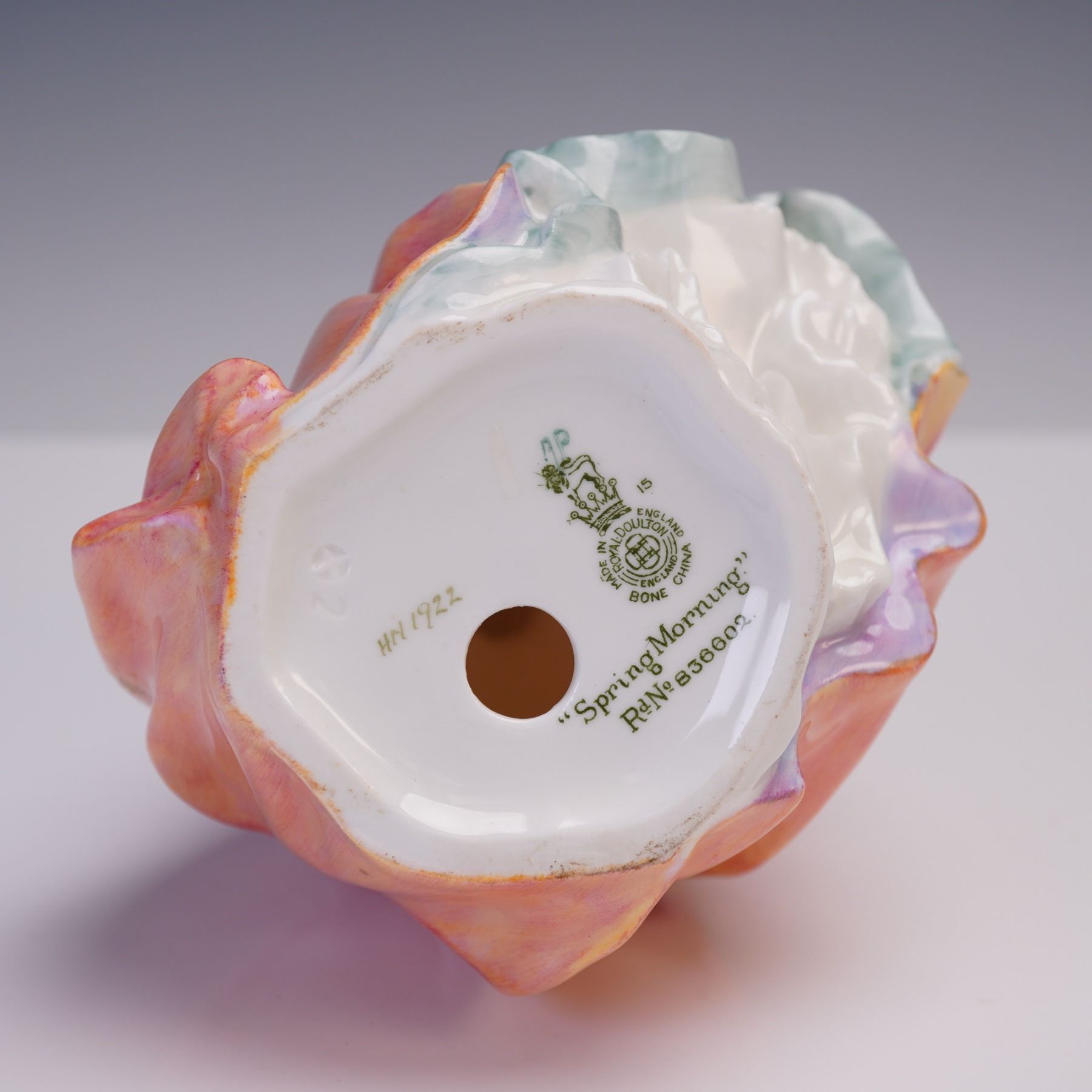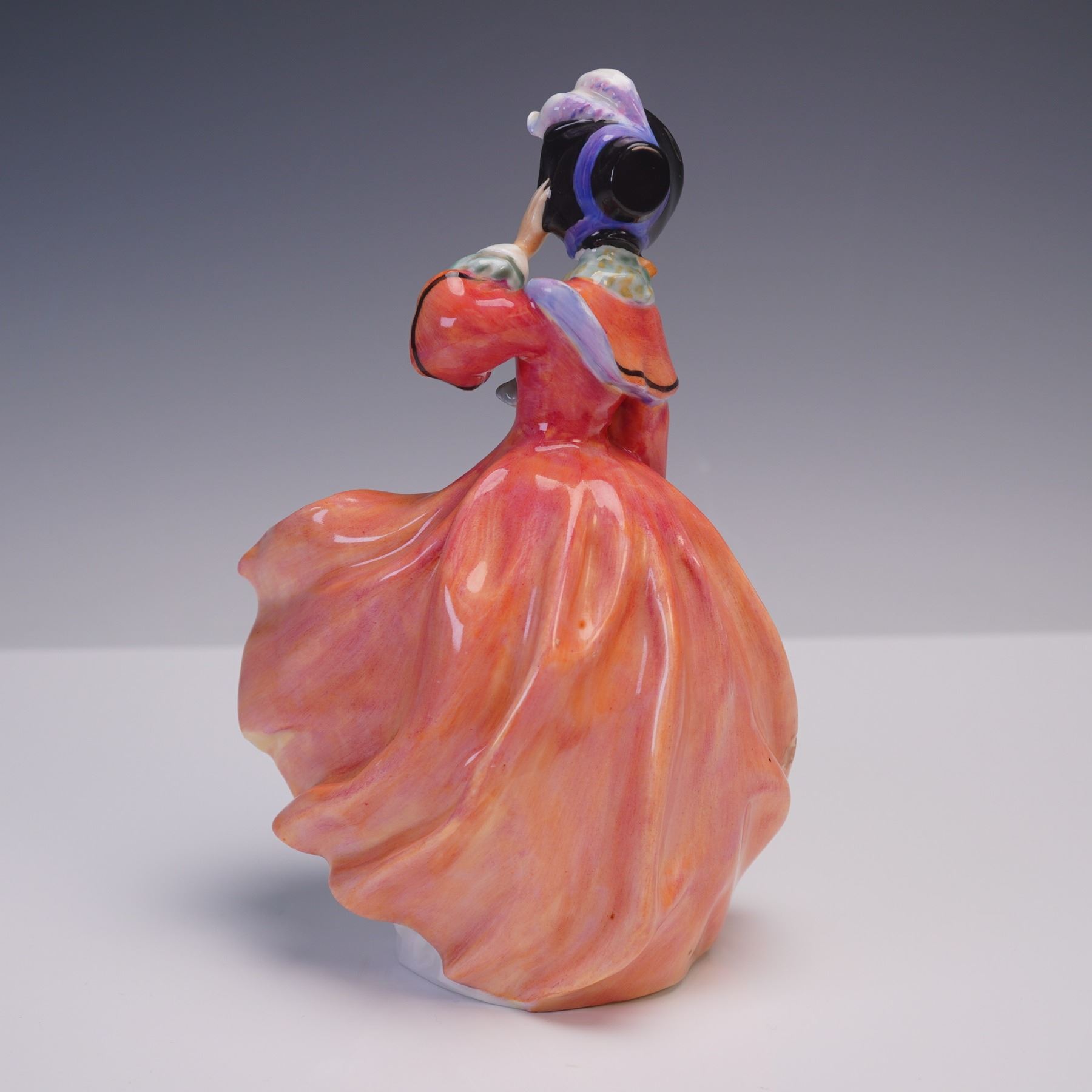 Charming hand-painted bone china figurine by Royal Doulton, depicting a graceful young lady holding her wide-brimmed turquoise bonnet in a gentle spring breeze. She wears a sweeping salmon-pink gown with soft lavender accents and a cascading petticoat in pale green and white. Designed by Leslie Harradine and issued from 1940 to 1973, this figure captures delicate motion and Edwardian elegance. Model HN1922. Royal Doulton backstamp. Measures 7.5"H.