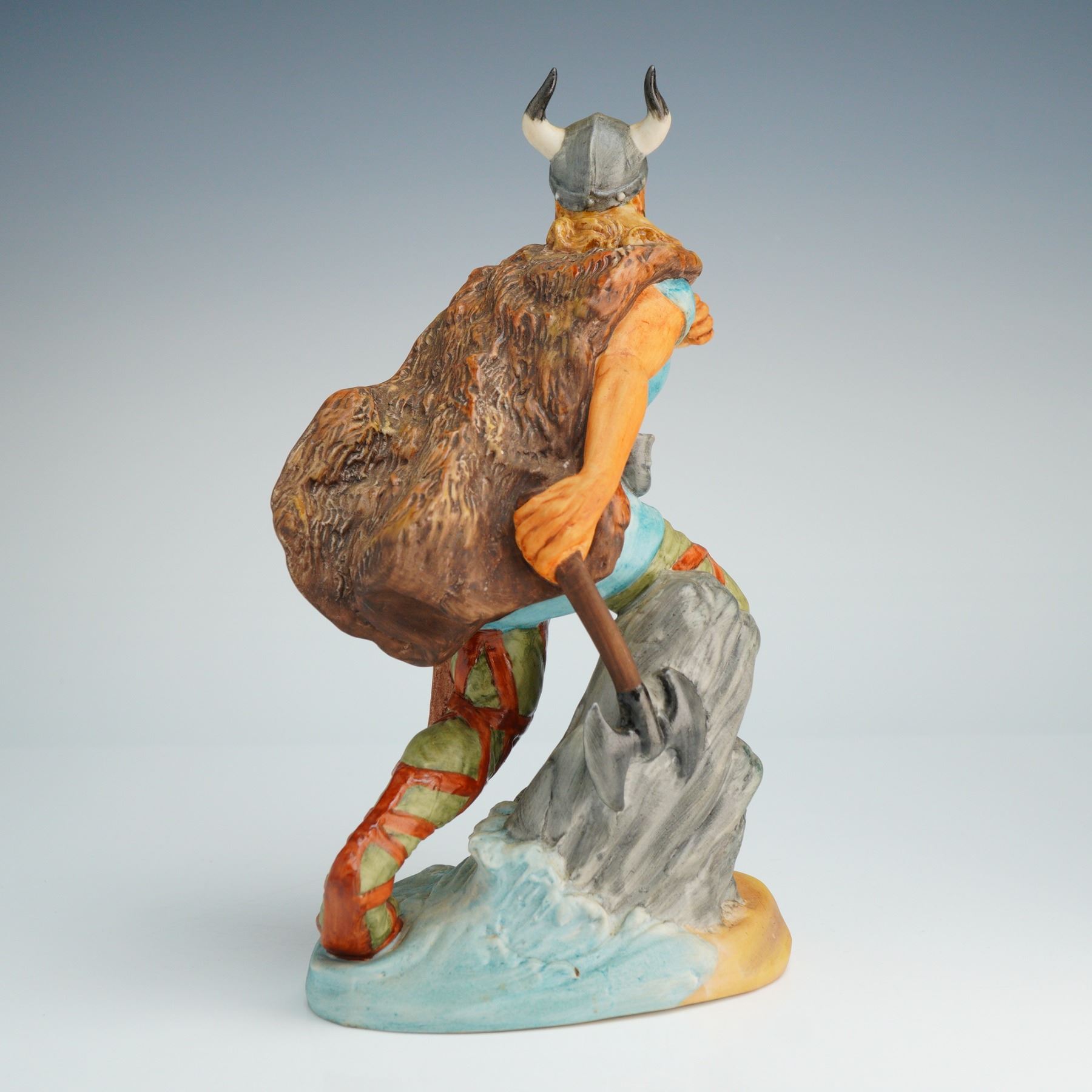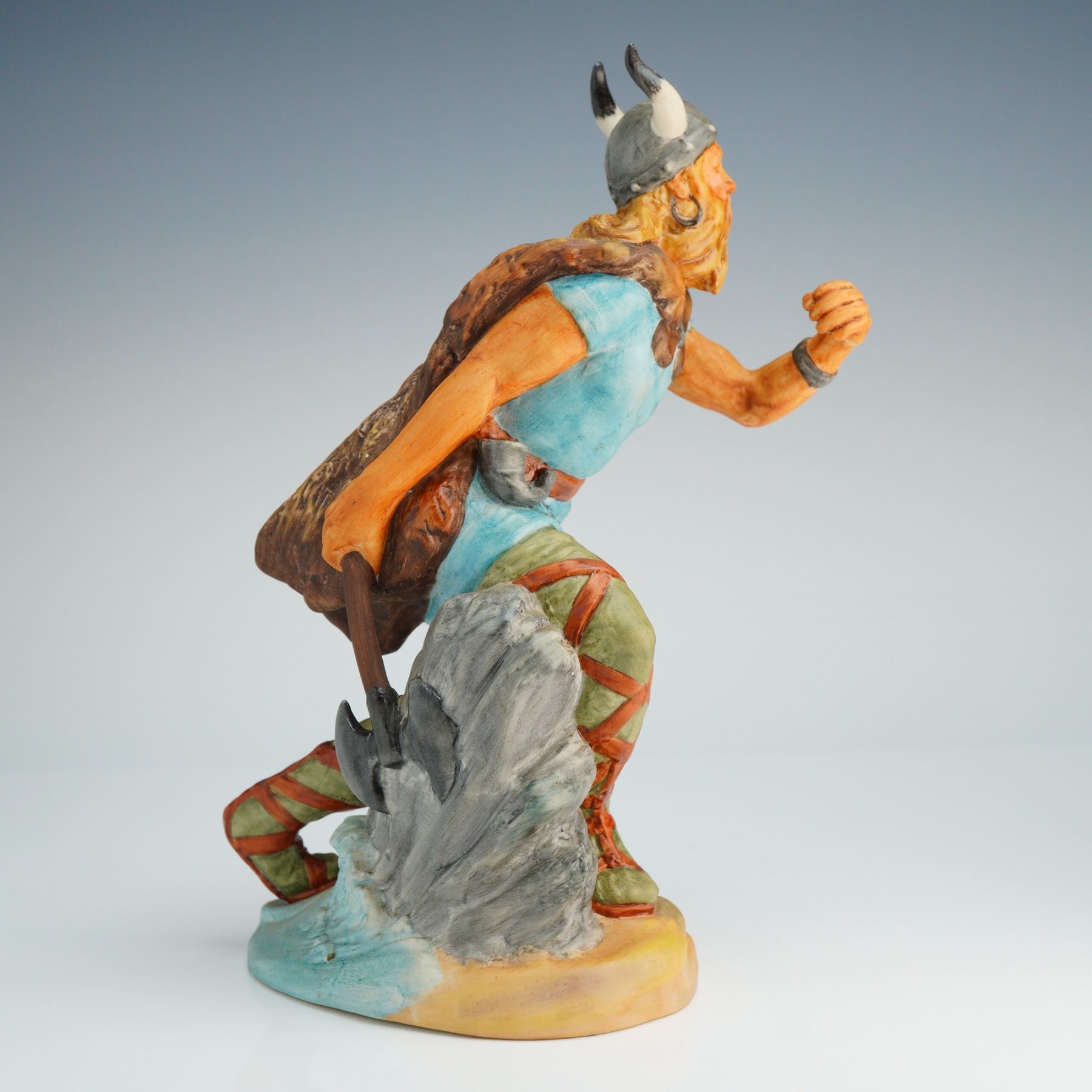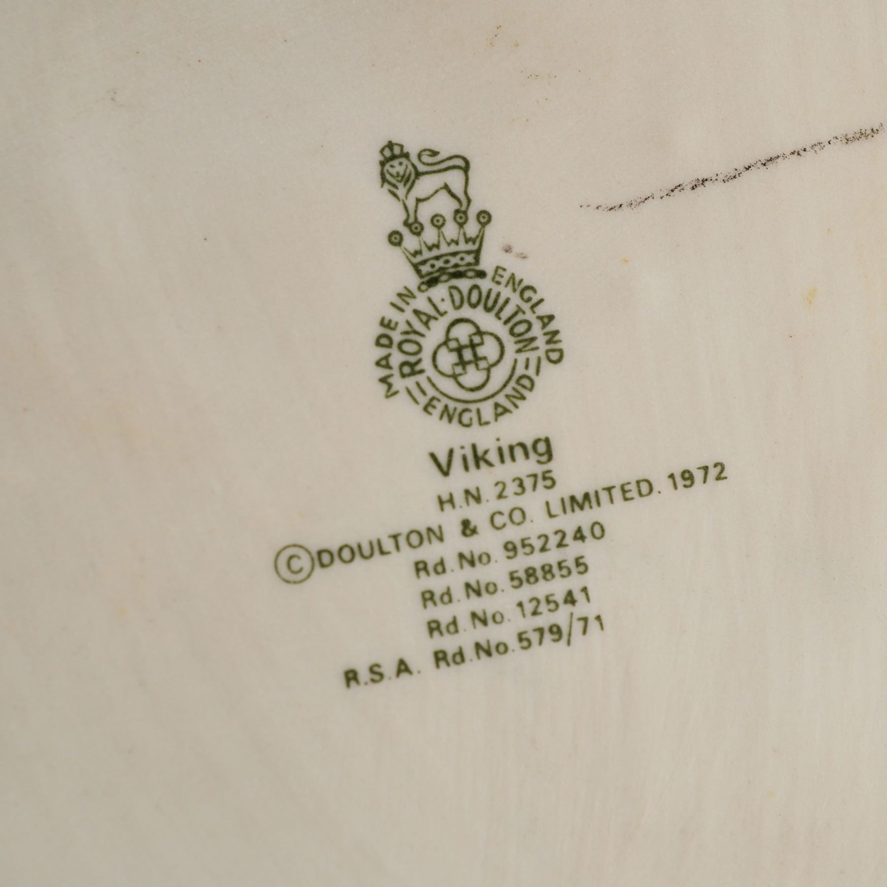This Royal Doulton figurine is a polychrome ceramic work with a matte finish. The figure depicts a bearded warrior in a dynamic striding pose across a rocky, wave-lapped base. The warrior is outfitted in a horned helmet, a fur-lined cloak over a light blue tunic, and cross-garnered green trousers. He carries a battle axe in his trailing hand and a sheathed sword at his hip. The underside of the base bears the green Royal Doulton printed mark, the title, model number, a copyright date of 1972, and registration numbers Rd. No. 952240, Rd. No. 58855, Rd. No. 12541, and R.S.A. Rd. No. 579/71.