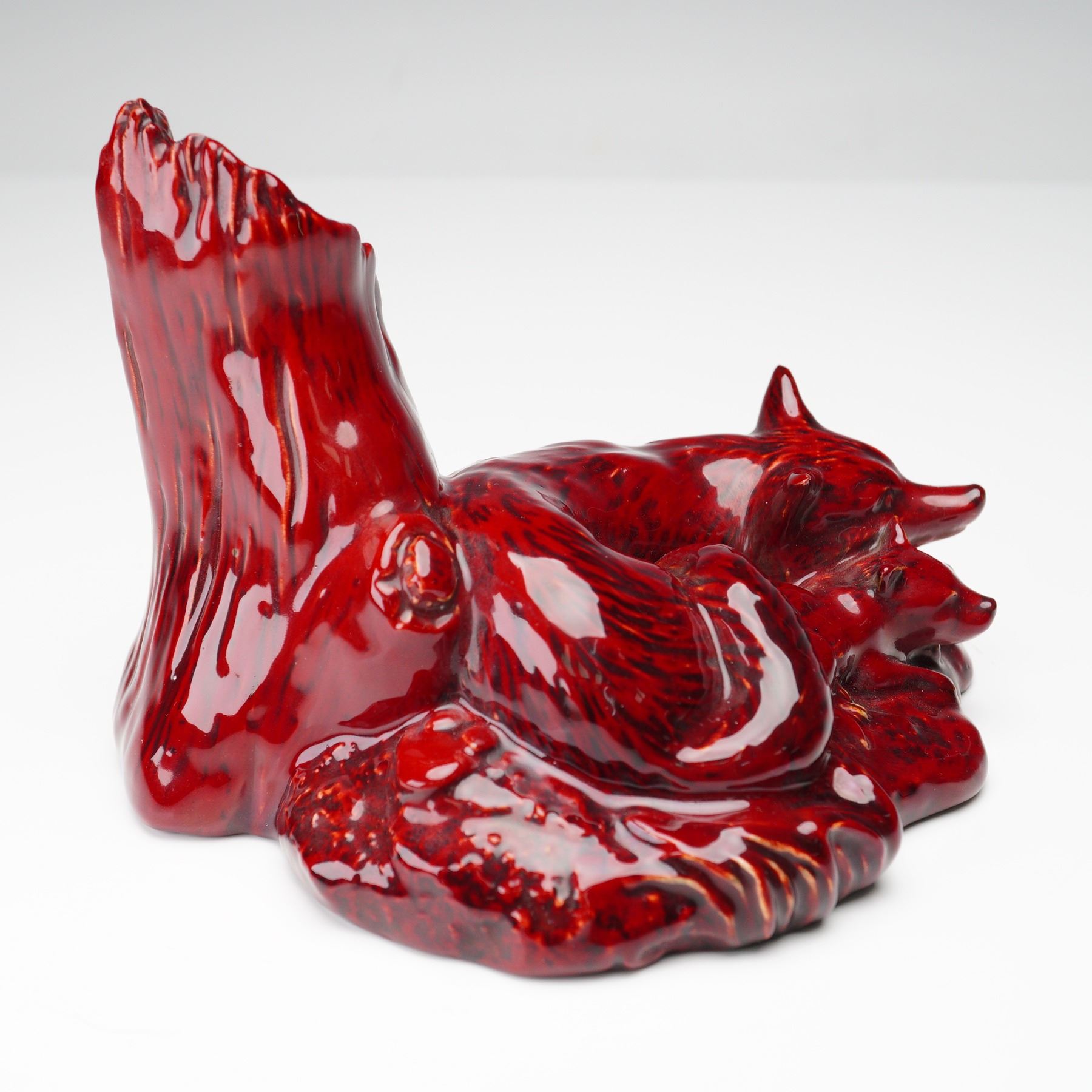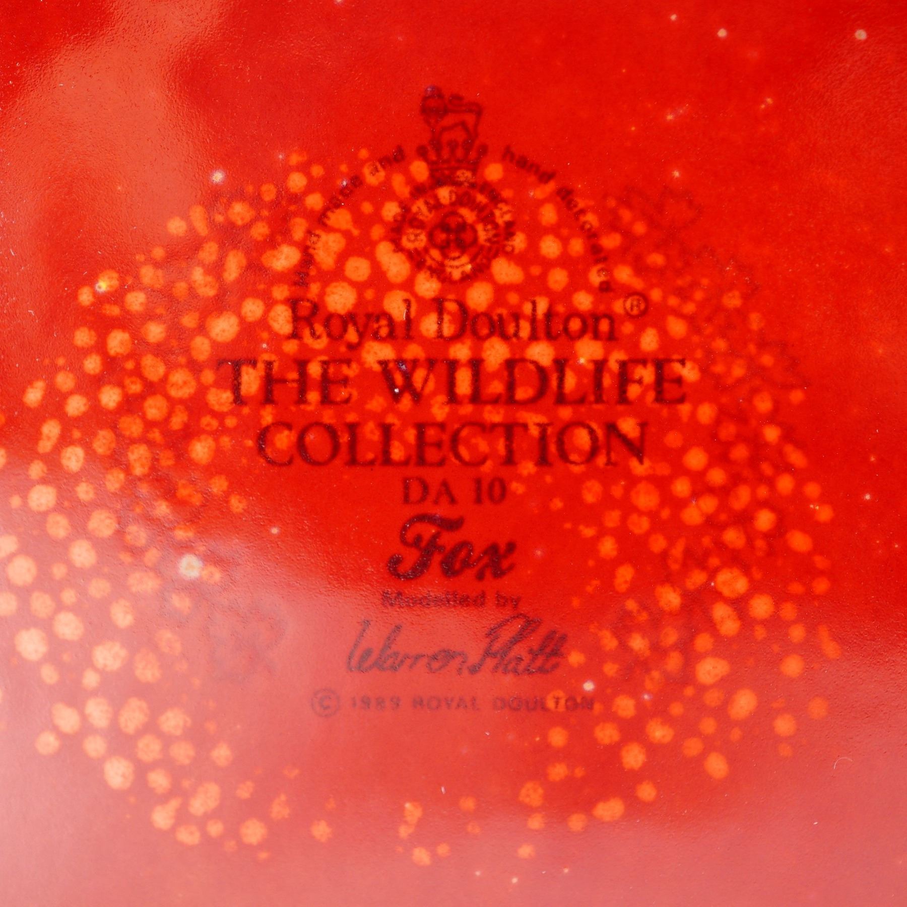 A striking Royal Doulton porcelain figurine from The Wildlife Collection, model DA10, titled Fox (sometimes Fox with Cub), depicting a fox and her cub resting beside a tree stump. Rendered in the rich flambe colorway, this edition features deep crimson and scarlet hues enhanced by a glossy finish unique to Doulton's celebrated glaze technique. Modeled by Warren Platt and marked to the base with the Royal Doulton backstamp, series title, and artist signature. Issued in 1989, this collectible piece exemplifies the artistry and refinement of Royal Doulton's Wildlife Collection.