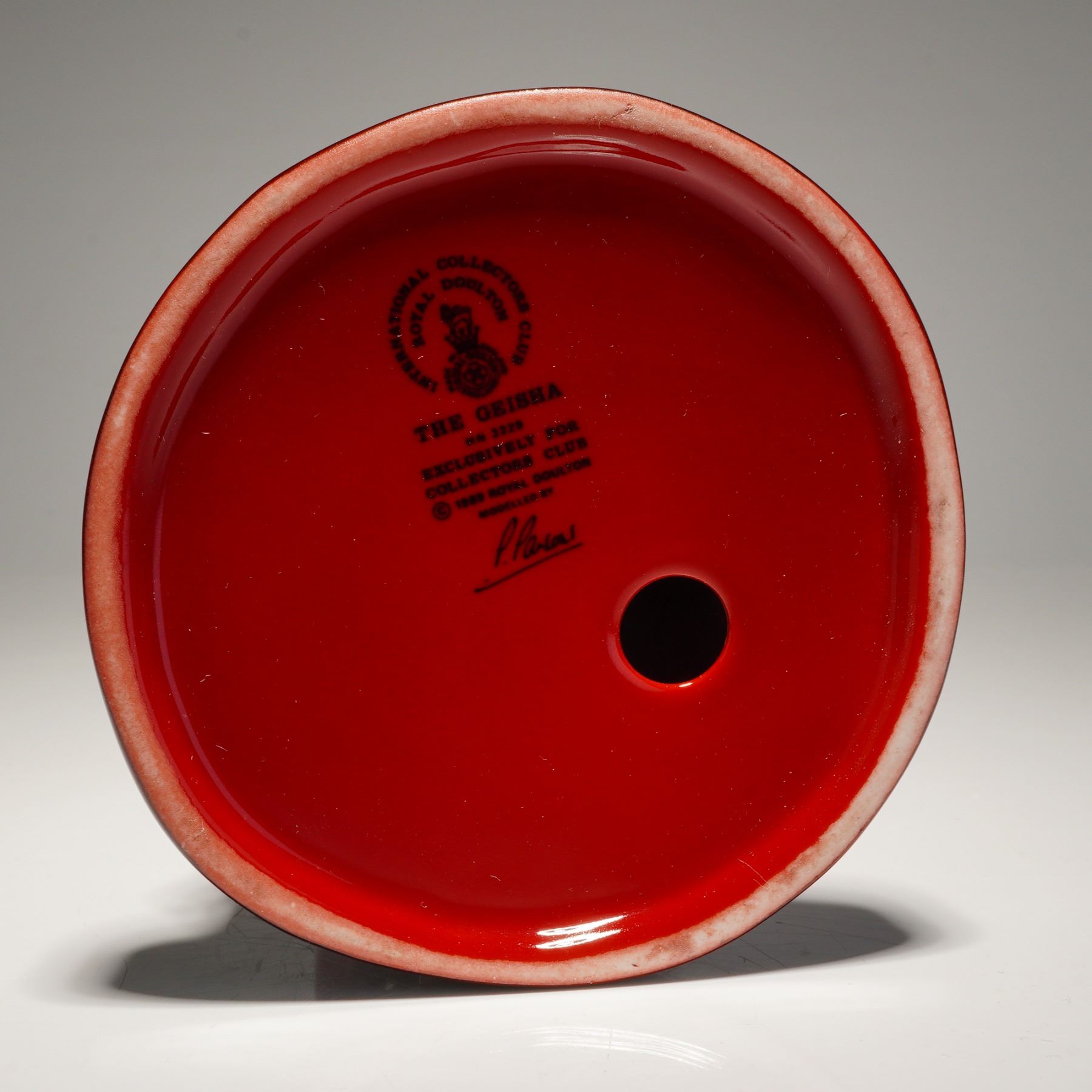 Royal Doulton Flambe porcelain figurine titled The Geisha HN 3229. This model was sculpted by Pauline Parsons and released in 1989 as an exclusive for the Royal Doulton International Collectors Club. The figurine is executed in a high-gloss sang-de-boeuf red glaze with deep black tonal accents applied to the hair, sash, and the lower portions of the kimono. The figure is depicted in traditional Japanese attire with hands clasped. The underside of the circular base is marked with the official Royal Doulton International Collectors Club backstamp, including the title, HN number, and the printed signature of the modeler.