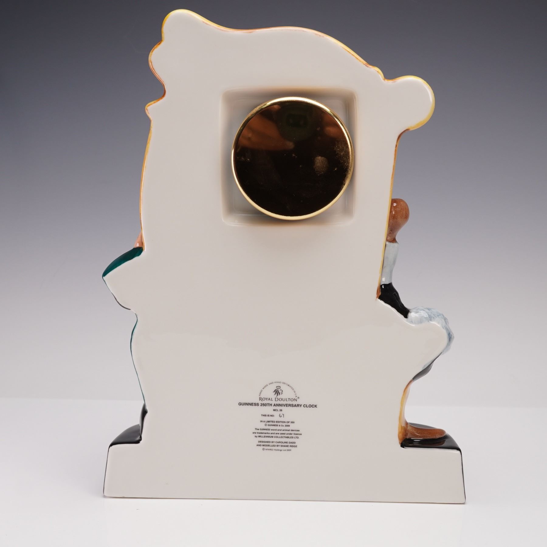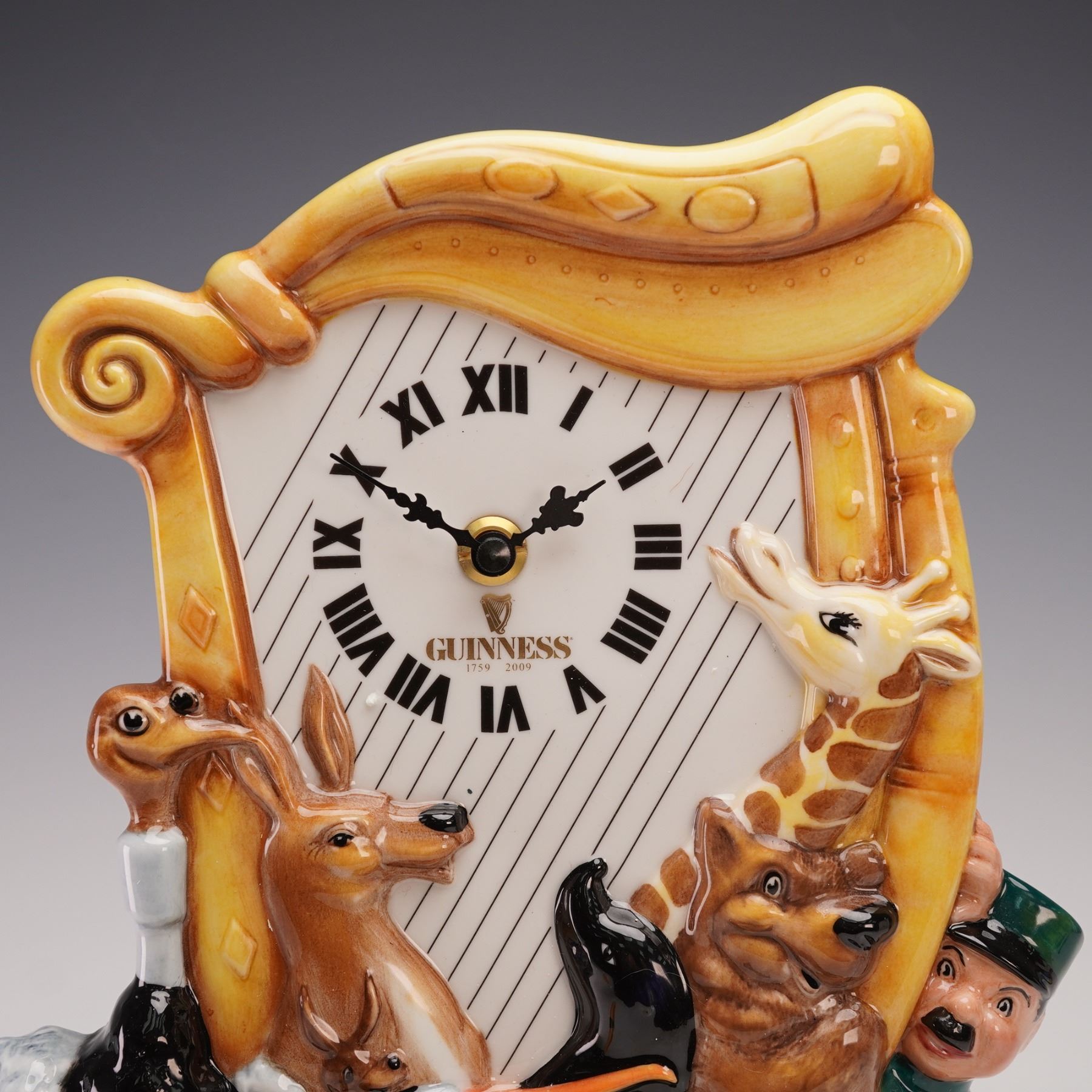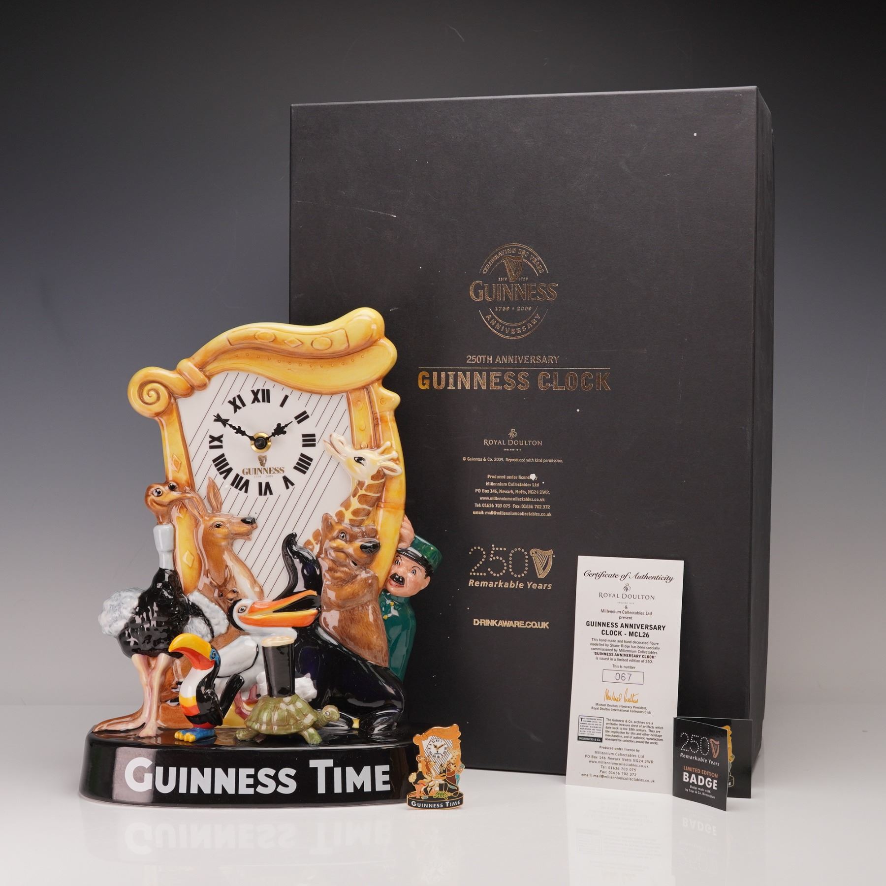 A limited edition ceramic mantel clock for the 250th anniversary of Guinness, modelled with the brewery's iconic advertising characters. The characters gathered around a gilt-framed clockface bearing Roman numerals, the plinth titled Guinness Time, accompanied by the matching enamel lapel. Produced under license by Millennium Collectable Ltd. Movement. Royal Doulton backstamp, This item has its original box. Certificate of Authenticity included.