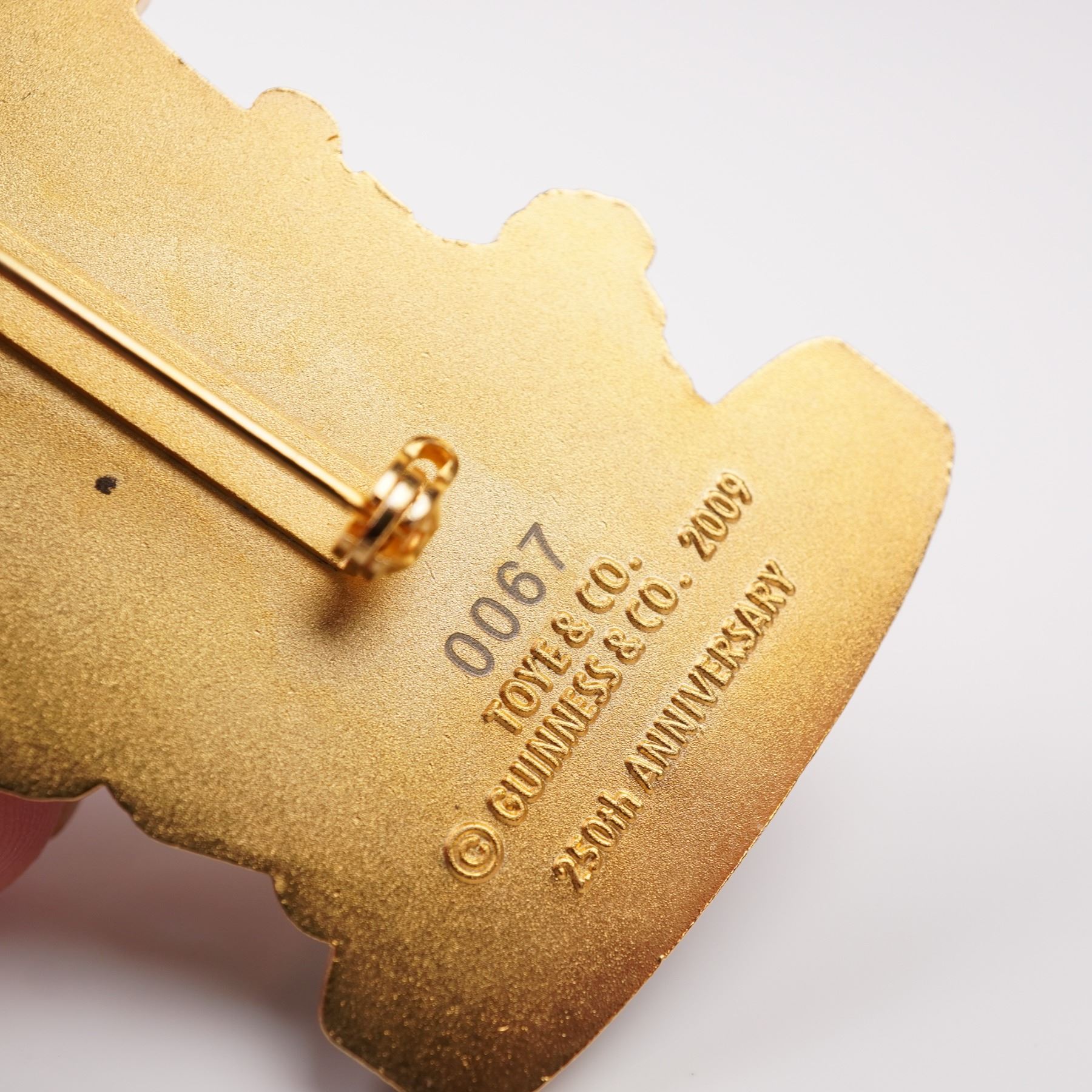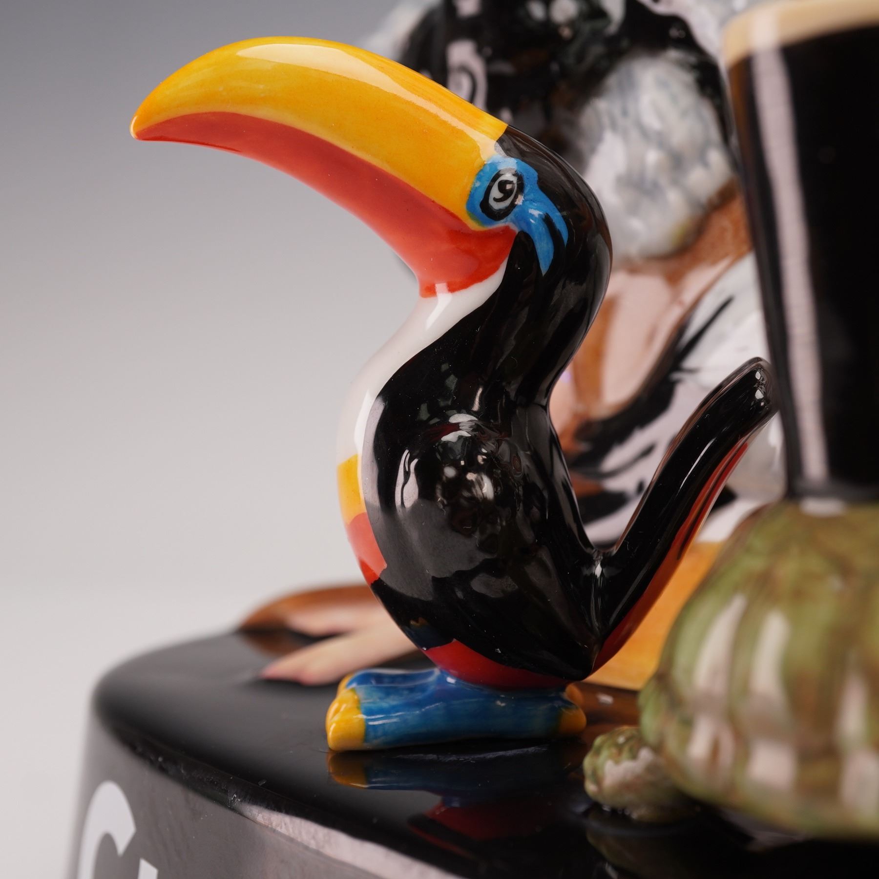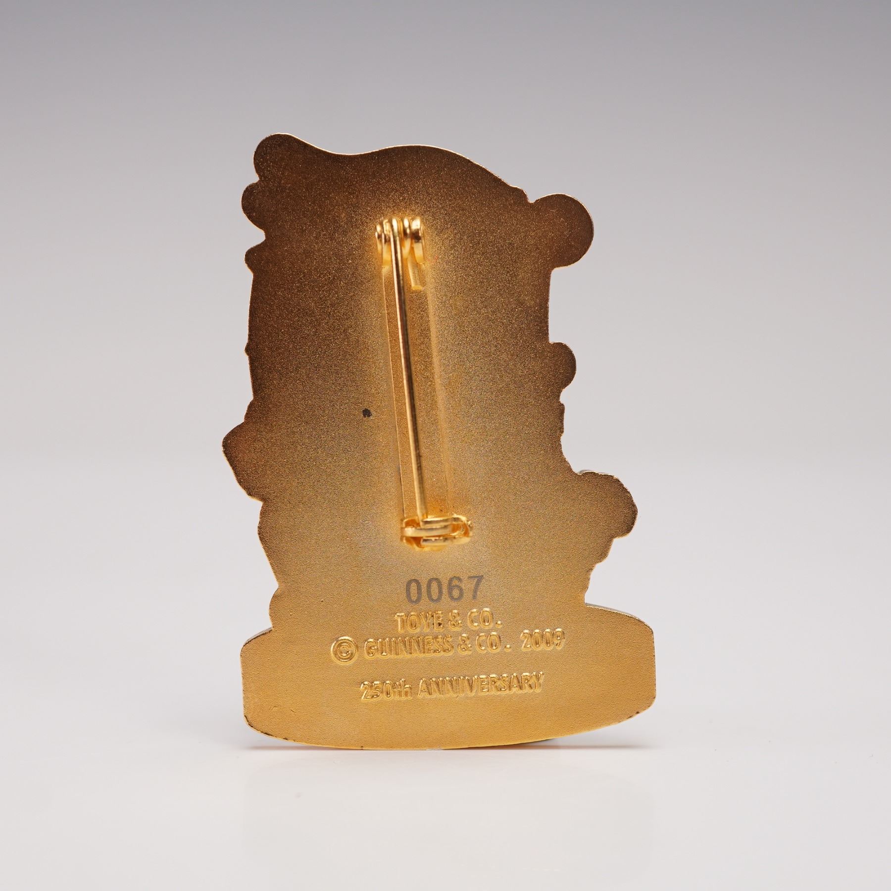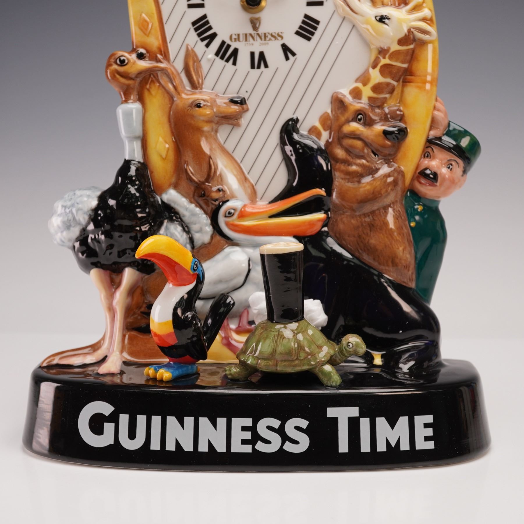 A limited edition ceramic mantel clock for the 250th anniversary of Guinness, modelled with the brewery's iconic advertising characters. The characters gathered around a gilt-framed clockface bearing Roman numerals, the plinth titled Guinness Time, accompanied by the matching enamel lapel. Produced under license by Millennium Collectable Ltd. Movement. Royal Doulton backstamp, This item has its original box. Certificate of Authenticity included.