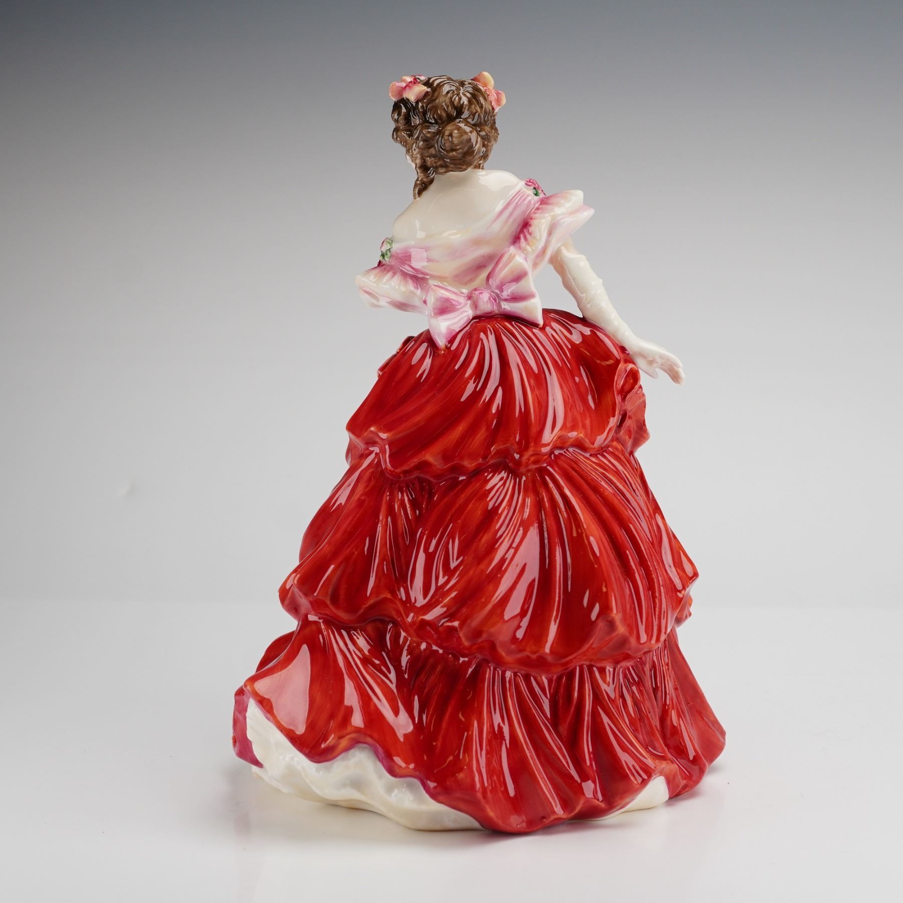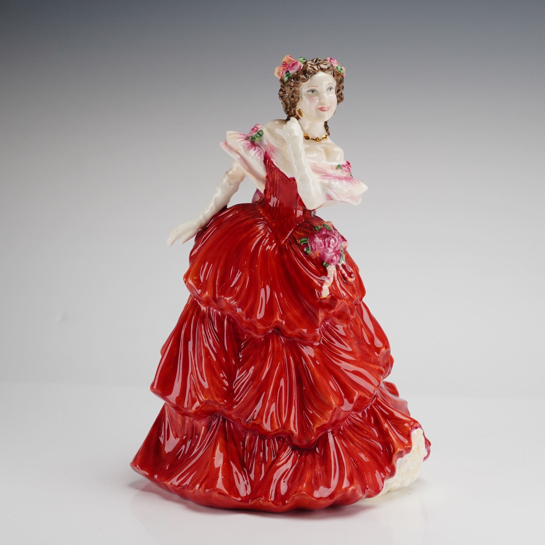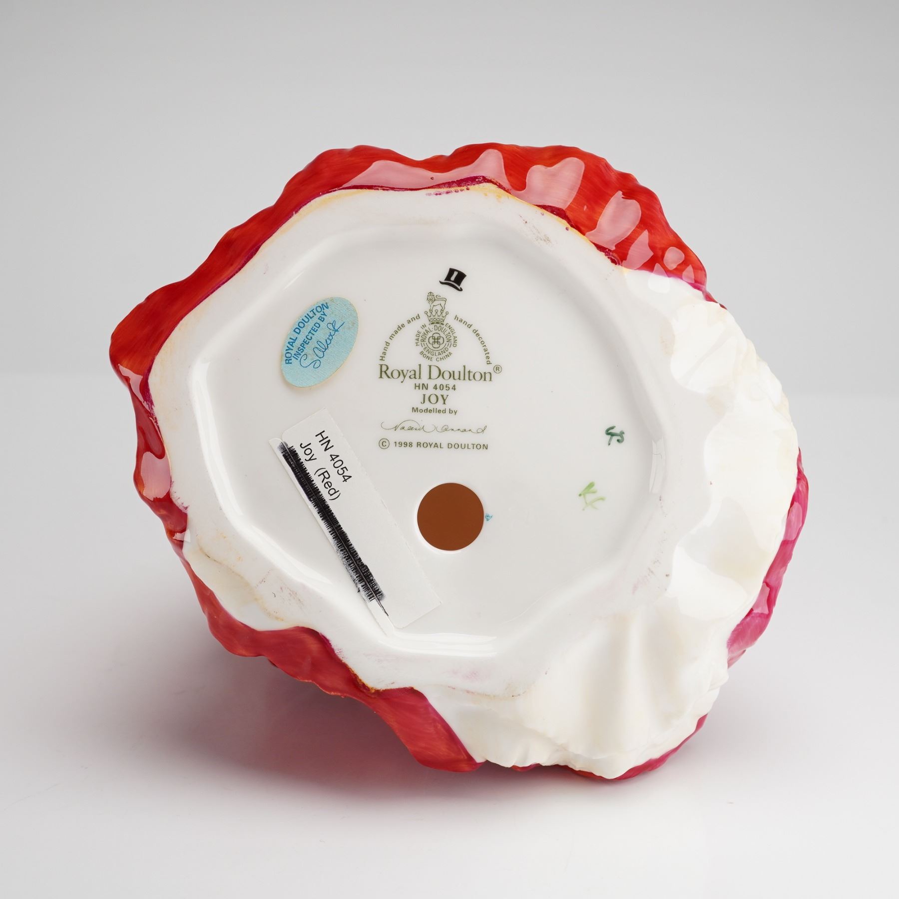 A Royal Doulton hand-decorated bone china figurine titled Joy, model number HN 4054. The figure depicts a woman in a red tiered ballgown with a pink shawl tied in a bow at the back. The subject features brown hair with pink and yellow floral accents and a gold-toned necklace, with further floral details at the waist. The underside displays the Royal Doulton lion and crown backstamp, specifying manufacture in England and a copyright date of 1998. The base also features the printed signature of modeler Valerie Annand, hand-painted initials, a Royal Doulton inspection sticker, and a retail inventory sticker.