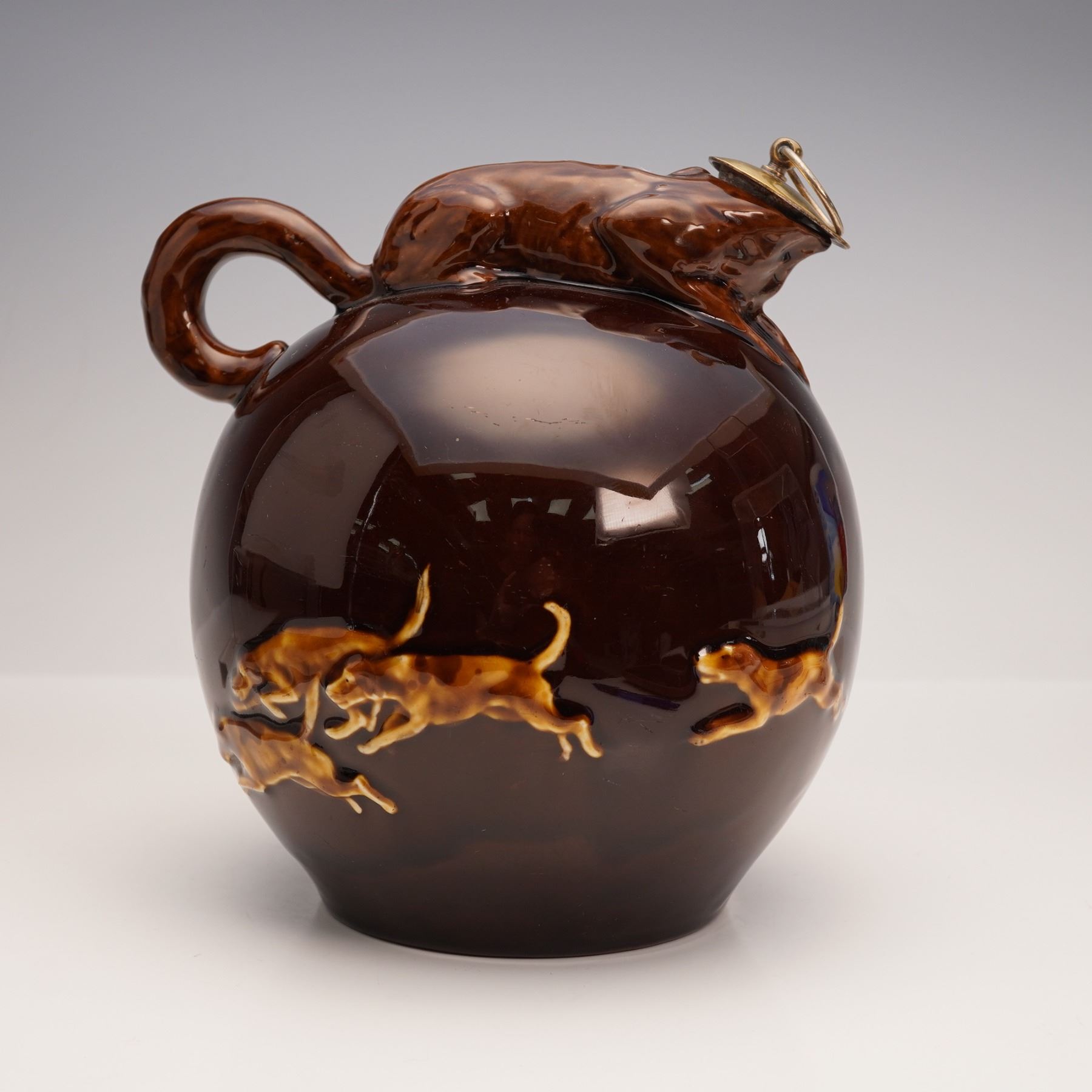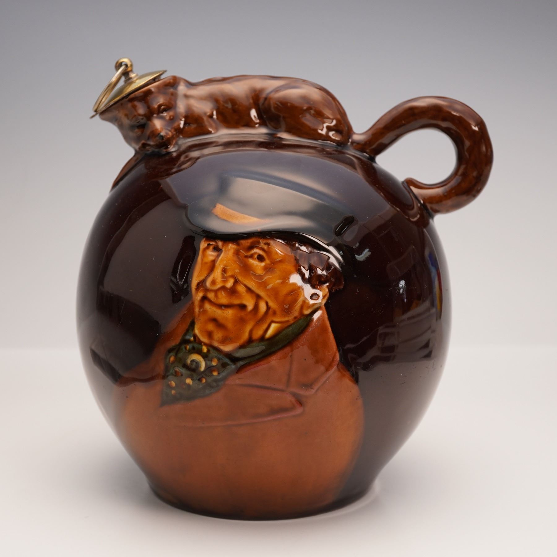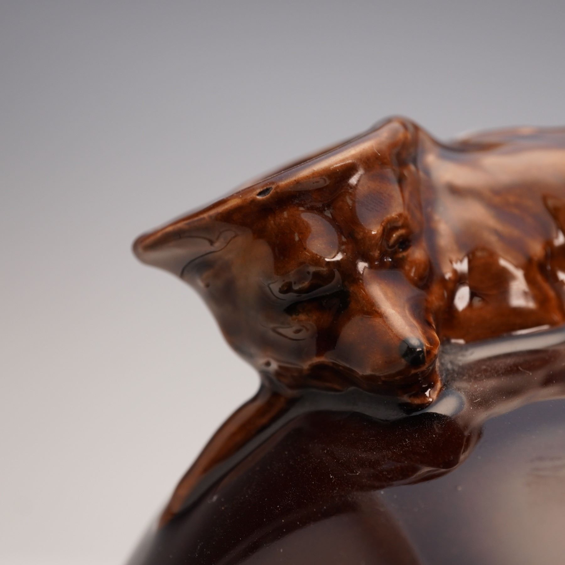 This Royal Doulton Kingsware Master of the Foxhounds Flagon features a crouching fox on top with its tail forming the handle and its body shaping the spout. The face of the flask depicts the Sporting Squire. The rich brown glaze and detailed relief molding showcase Royal Doulton's craftsmanship. Royal Doulton backstamp.