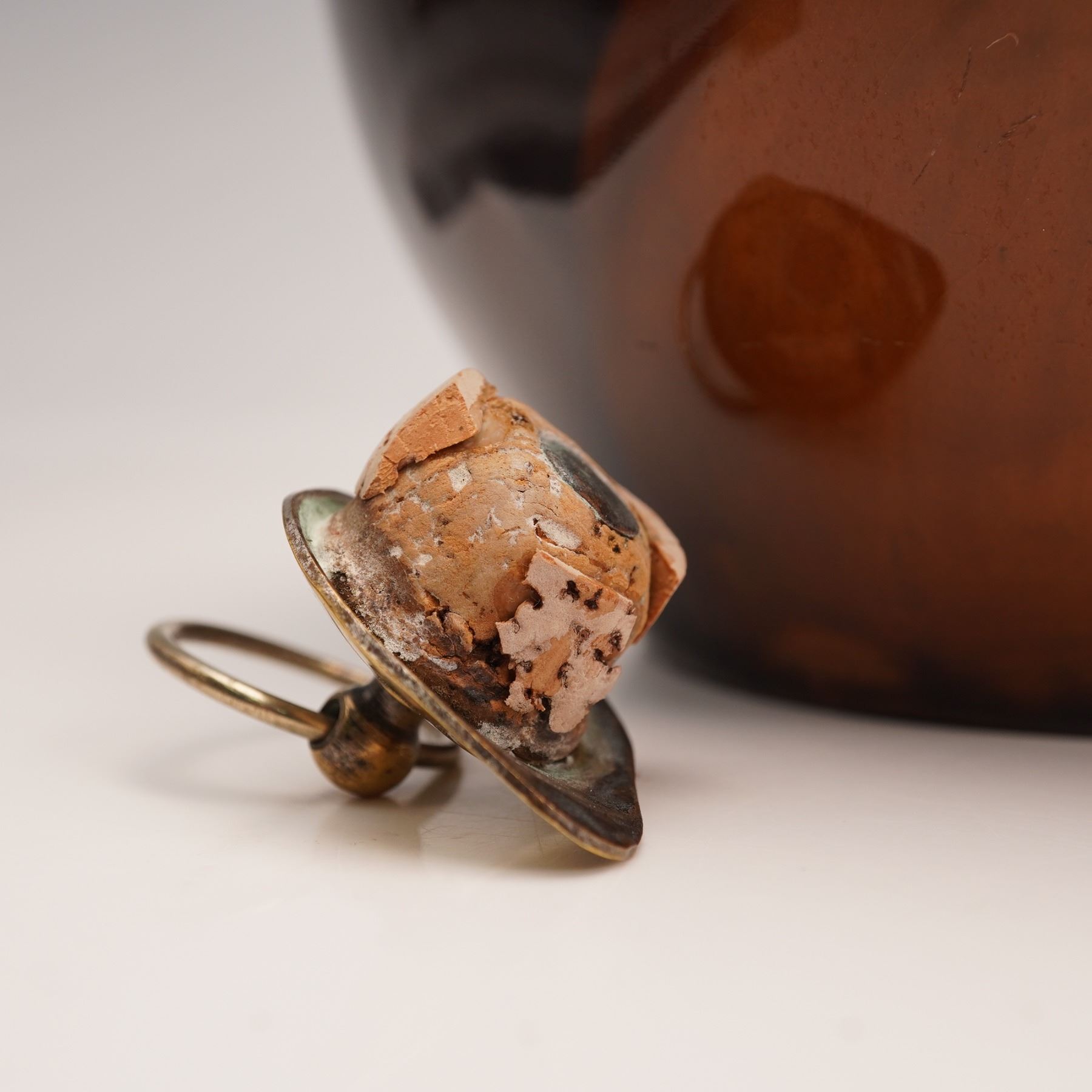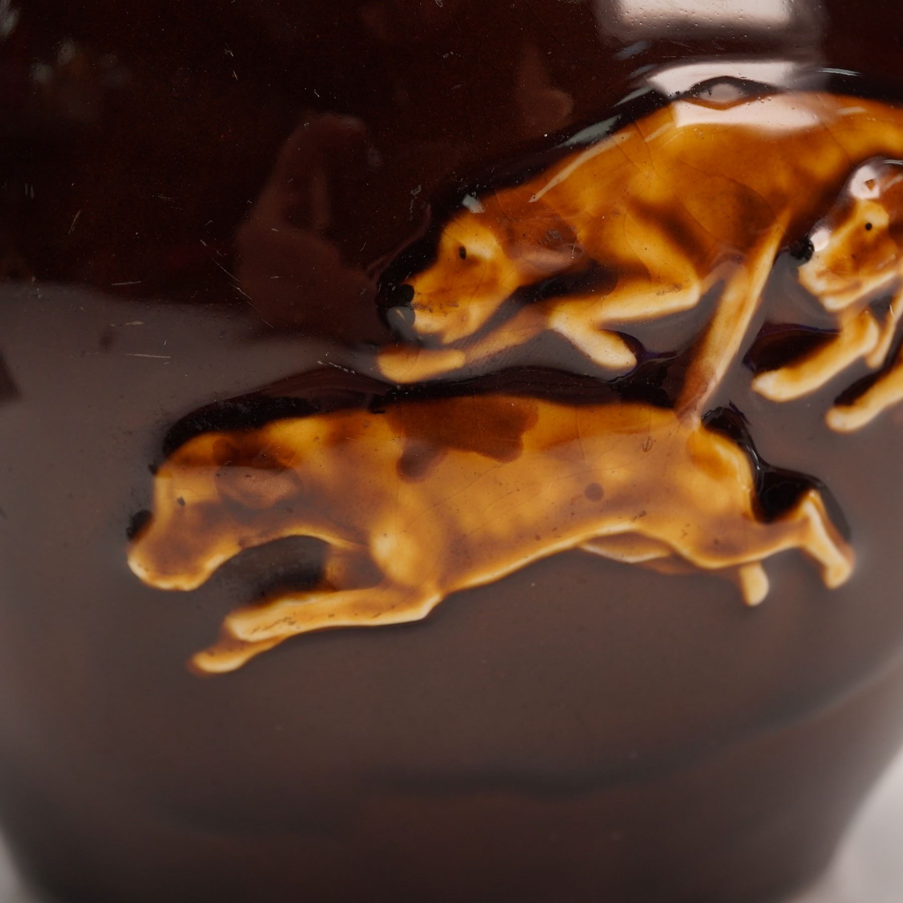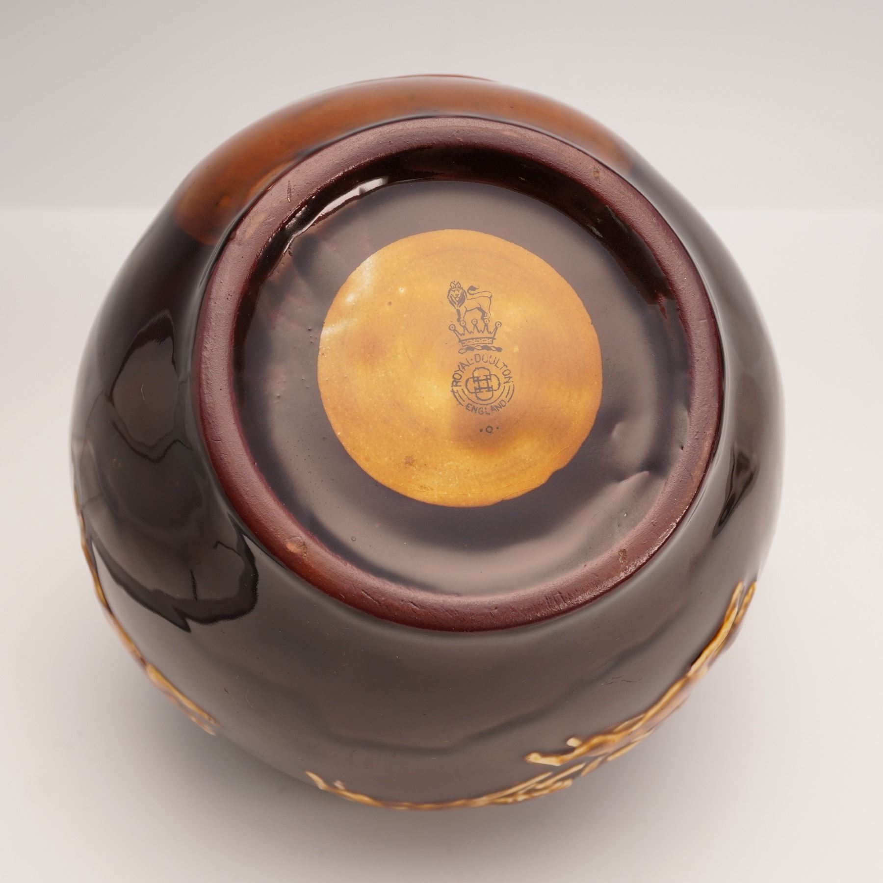 This Royal Doulton Kingsware Master of the Foxhounds Flagon features a crouching fox on top with its tail forming the handle and its body shaping the spout. The face of the flask depicts the Sporting Squire. The rich brown glaze and detailed relief molding showcase Royal Doulton's craftsmanship. Royal Doulton backstamp.