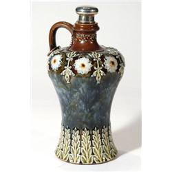 Royal Doulton Lambeth Stoneware flask, relief moulded with flowers and leaves onto a green ground with silver top, impressed marks and initialled HW to base, 26cm high
