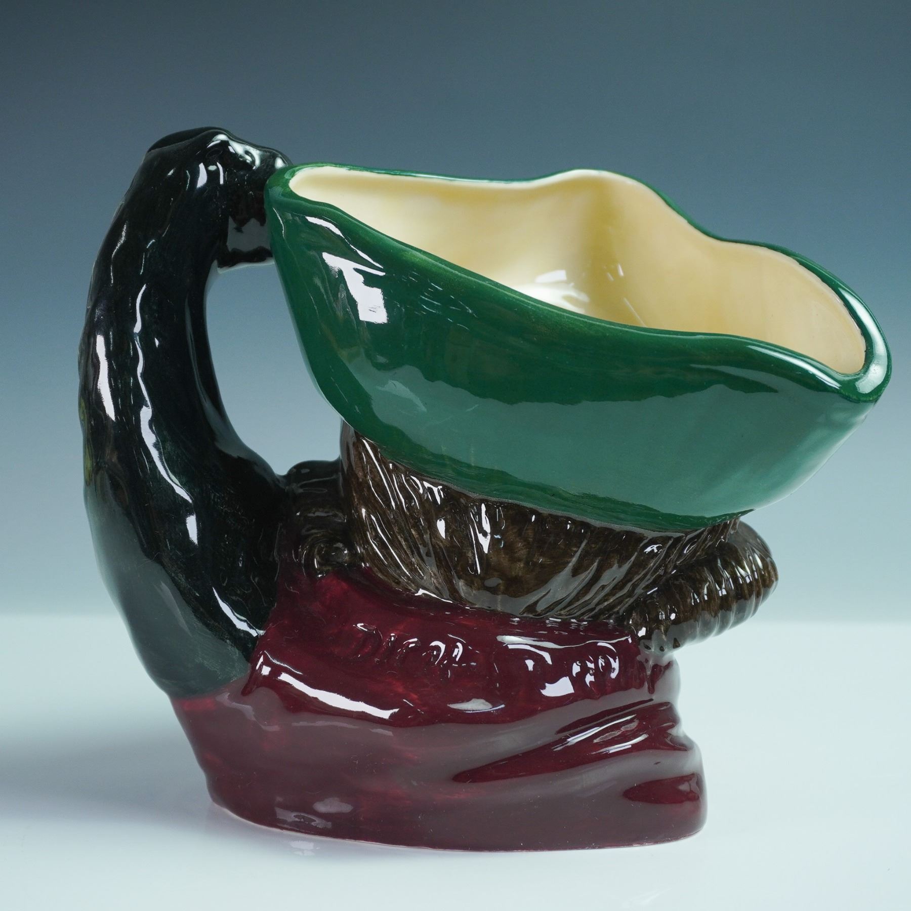 This jug features Turpin wearing a green tricorn hat, a black mask covering his eyes, and a red jacket. The handle is sculpted in the form of a horse's head and neck, representing his legendary steed, Black Bess. This version differs from the earlier style, which featured the mask raised on the hat and a pistol handle. Marked with the Royal Doulton backstamp on the base.
