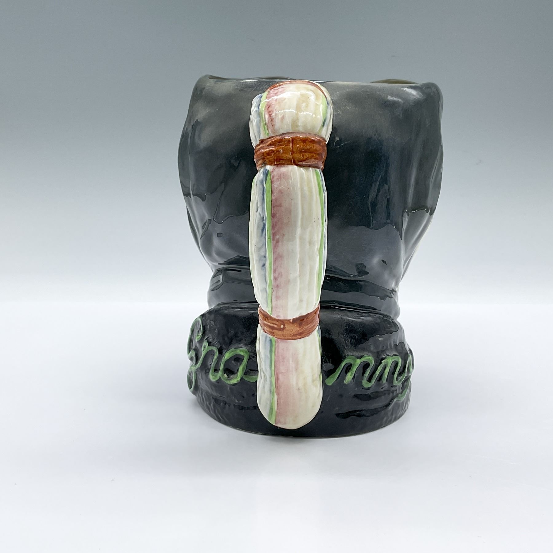 Hand painted and hand decorated figural jug of an elderly lady, with a single tooth shown in her smile. Tied colored yarn shaped the handle. Royal Doulton backstamp.