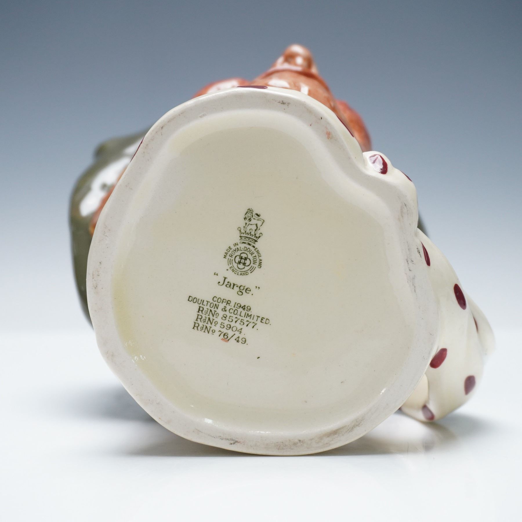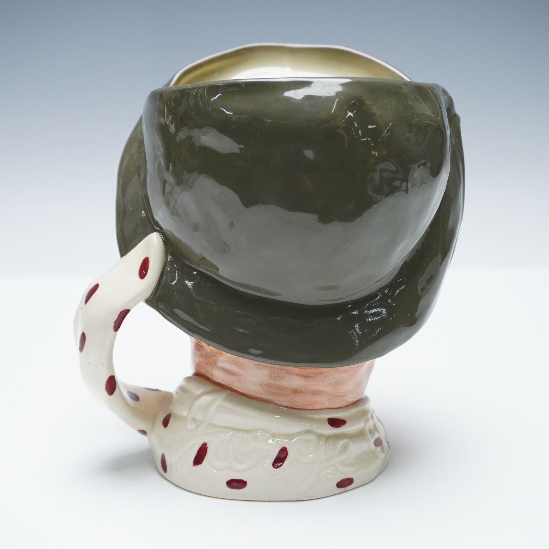 This expressive jug captures a whimsical English countryman with reddish hair and a comical expression, wearing a green cap and a polka-dotted neckerchief that forms the handle. Royal Doulton backstamp.