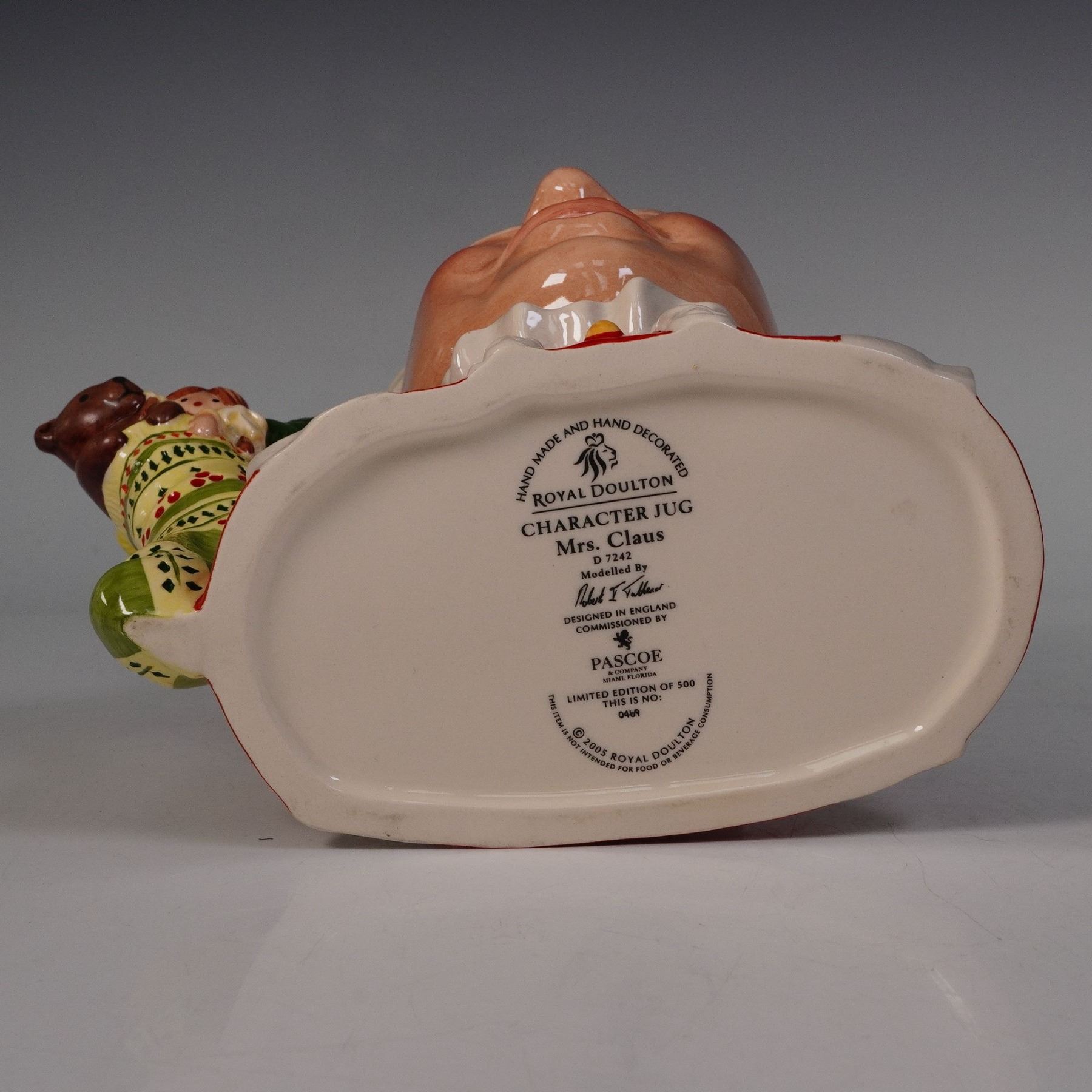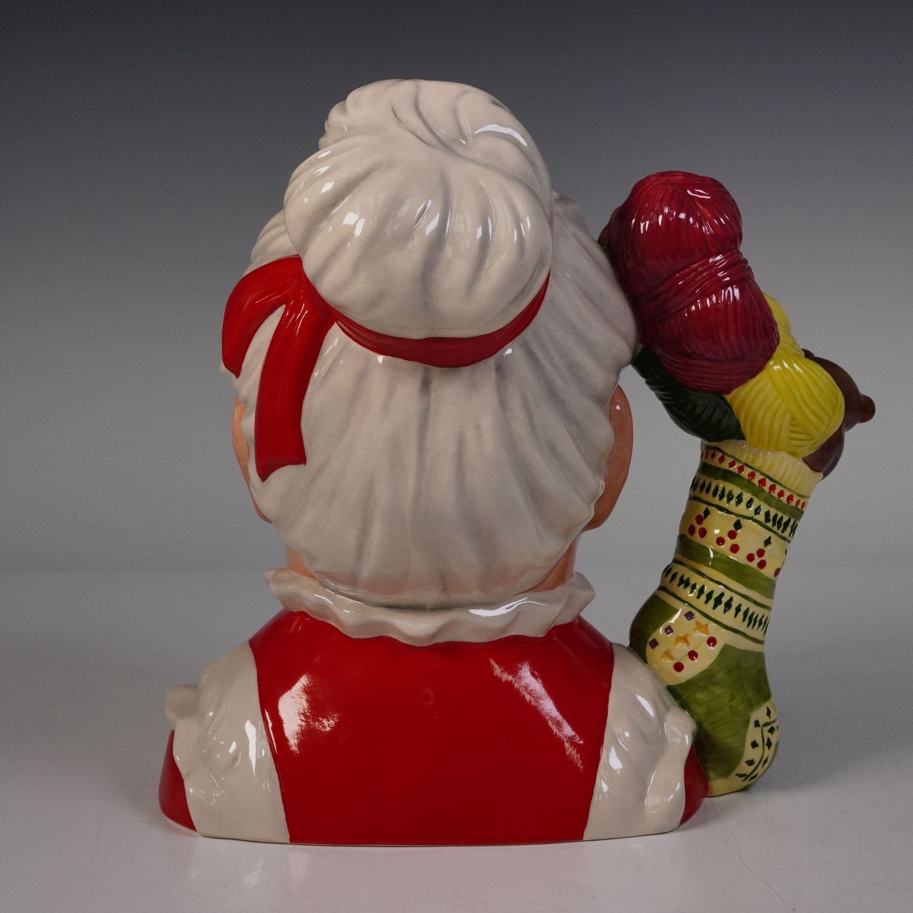 Mrs. Claus is depicted with a warm smile and rosy cheeks, dressed in her classic red and white attire. The handle takes the shape of a festive stocking brimming with gifts including a teddy bear, doll, and colorful ornaments. The cheerful detail and bright colors capture the joyful spirit of the holiday season. Marked D7242. Royal Doulton backstamp.