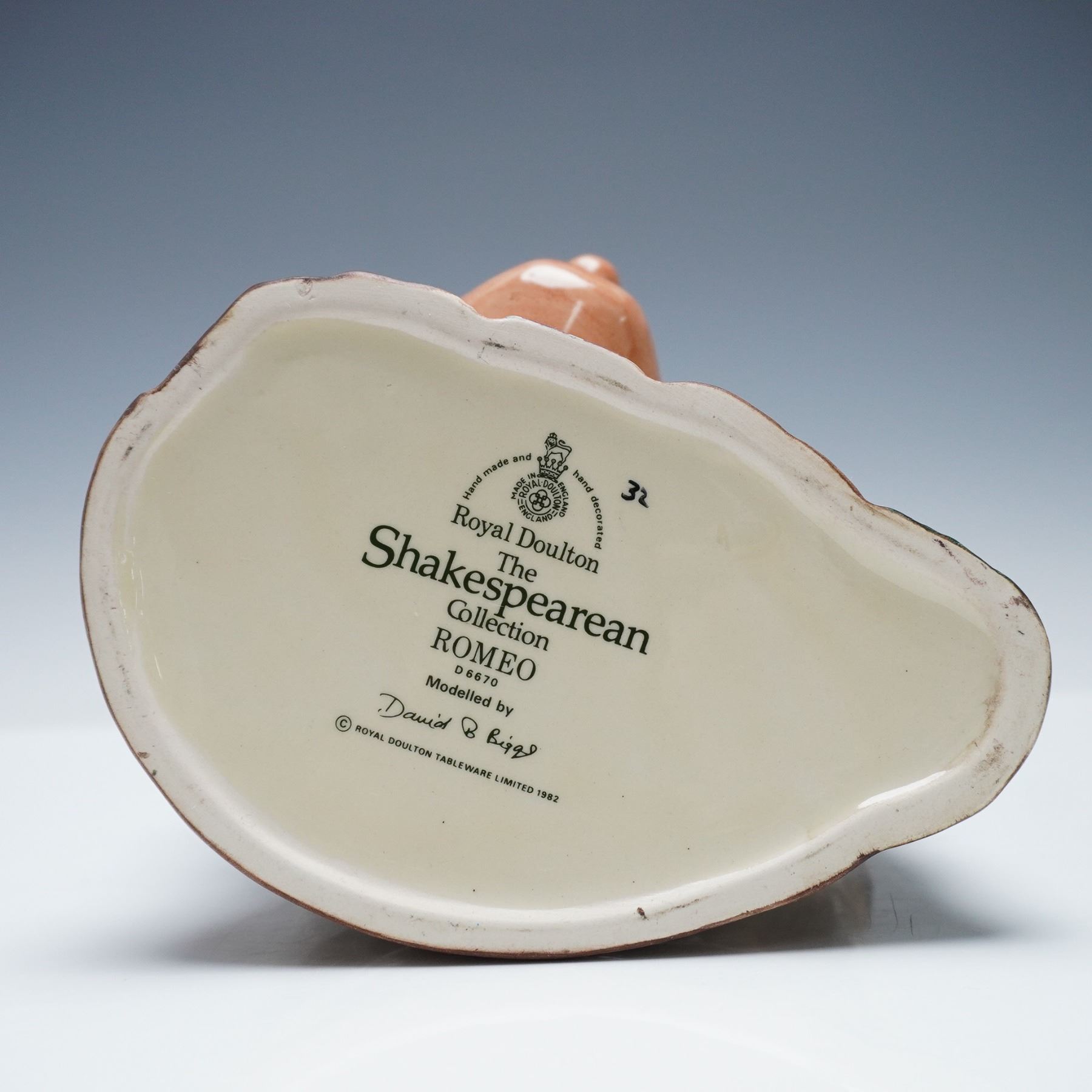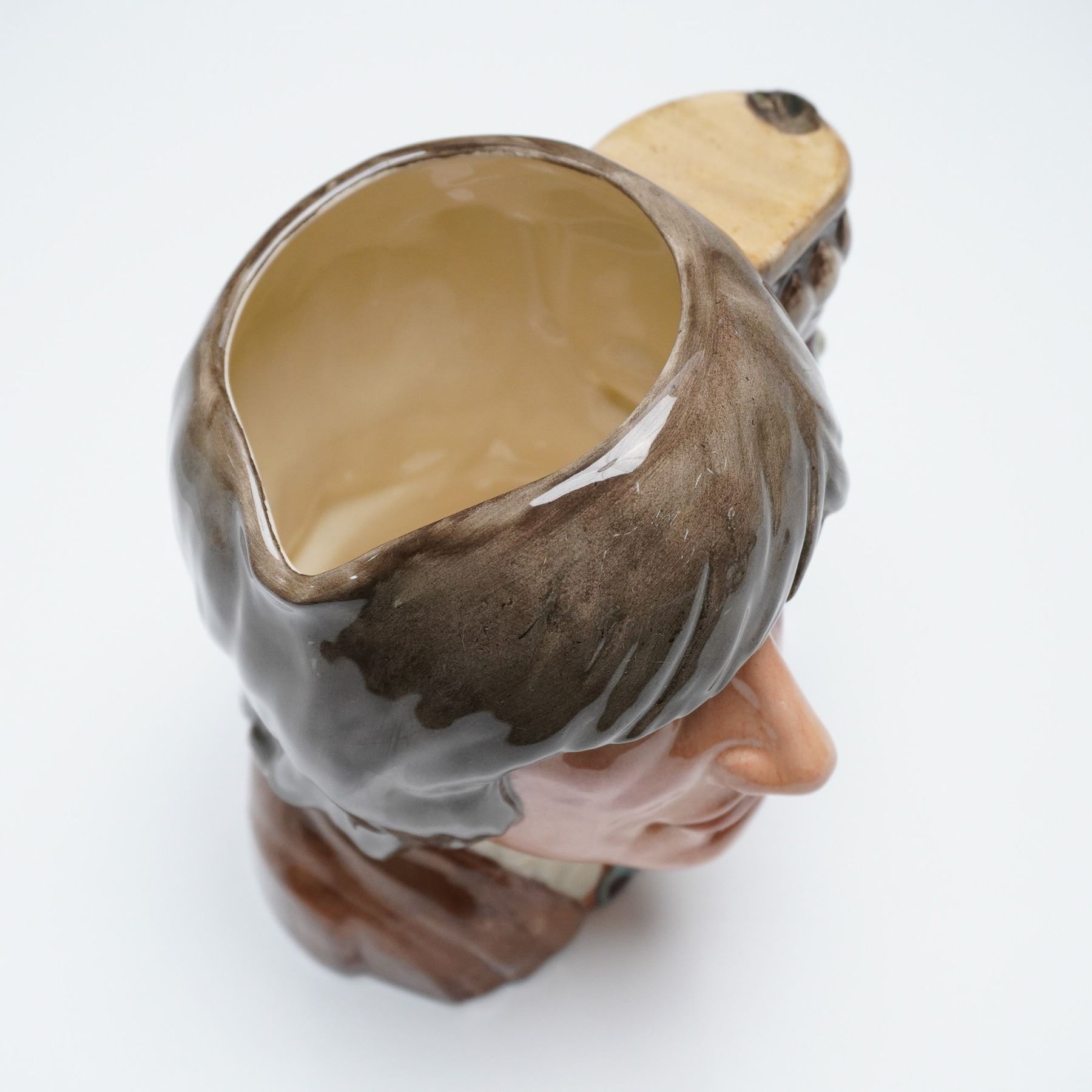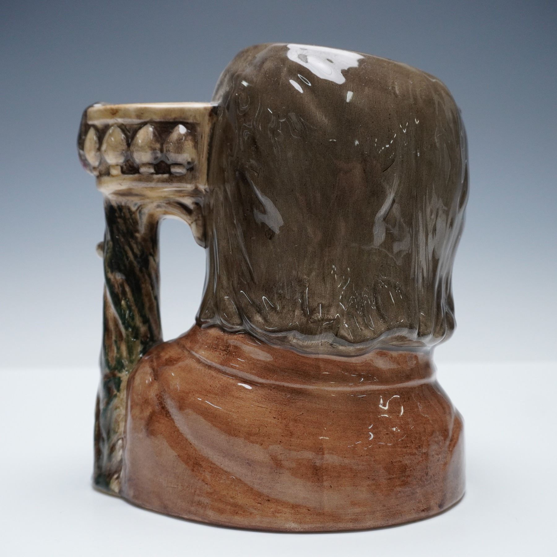 This jug represents the tragic hero from William Shakespeare's Romeo and Juliet. The jug captures Romeo's youthful features with stylized hair and Elizabethan attire, while the handle incorporates a gothic column entwined with ivy and a sword, symbolizing both the romance and conflict central to the play. Royal Doulton backstamp.