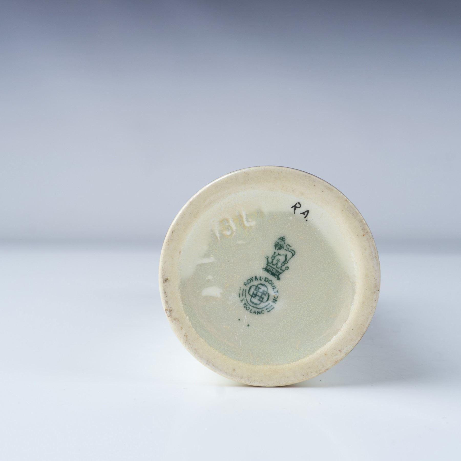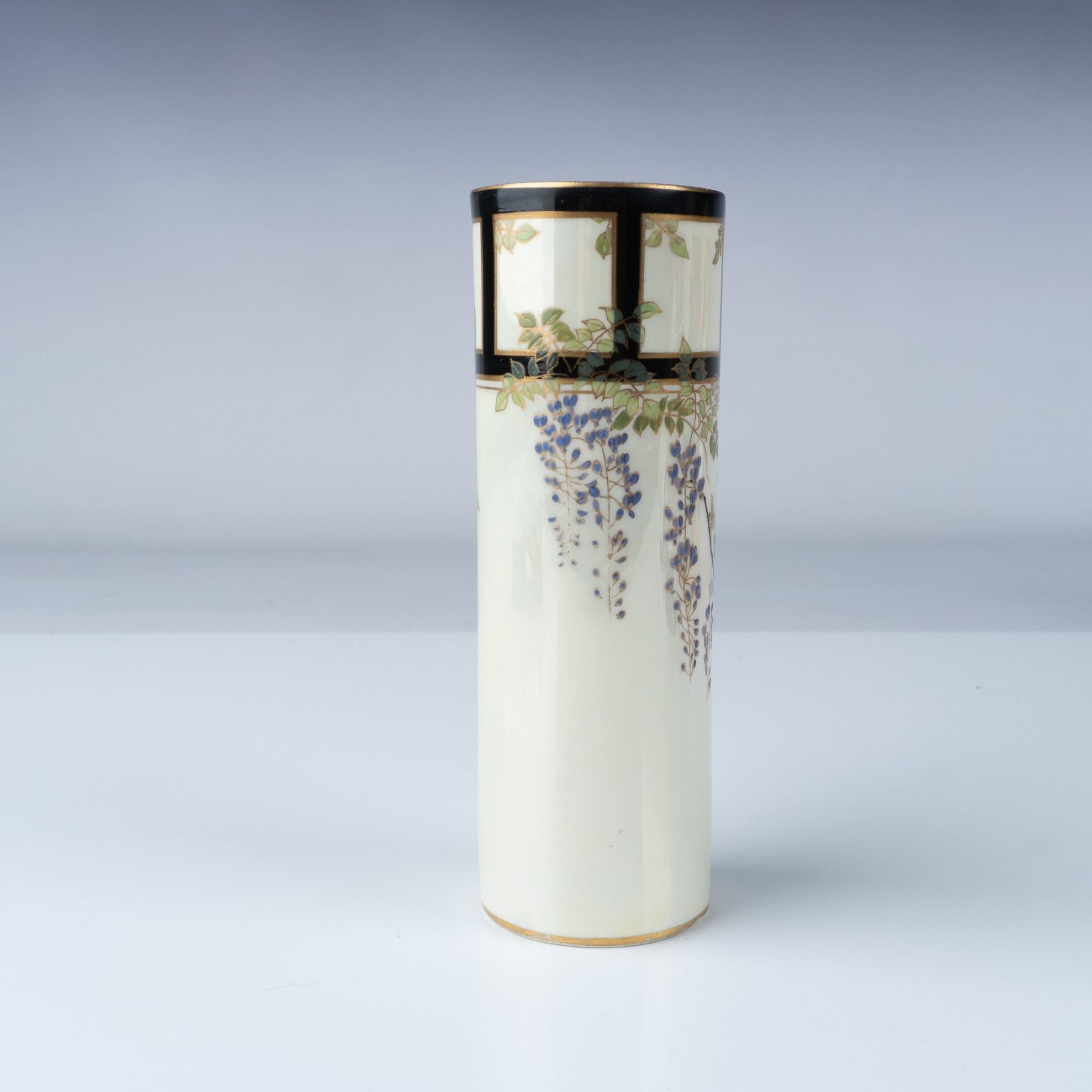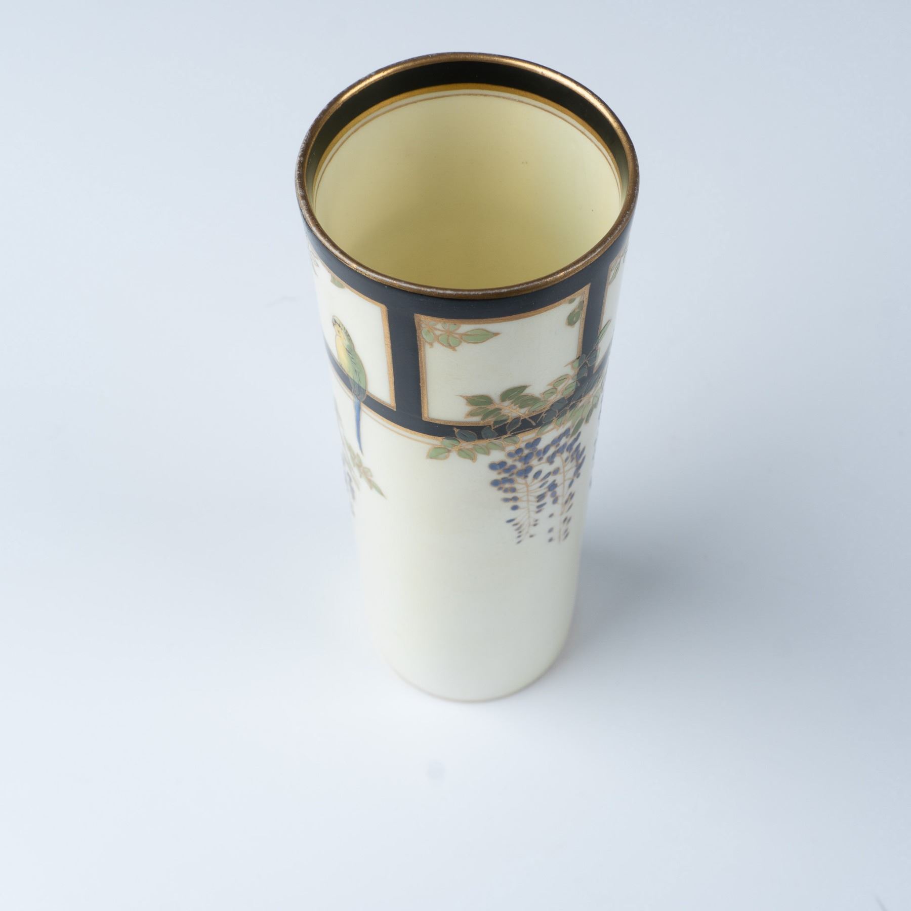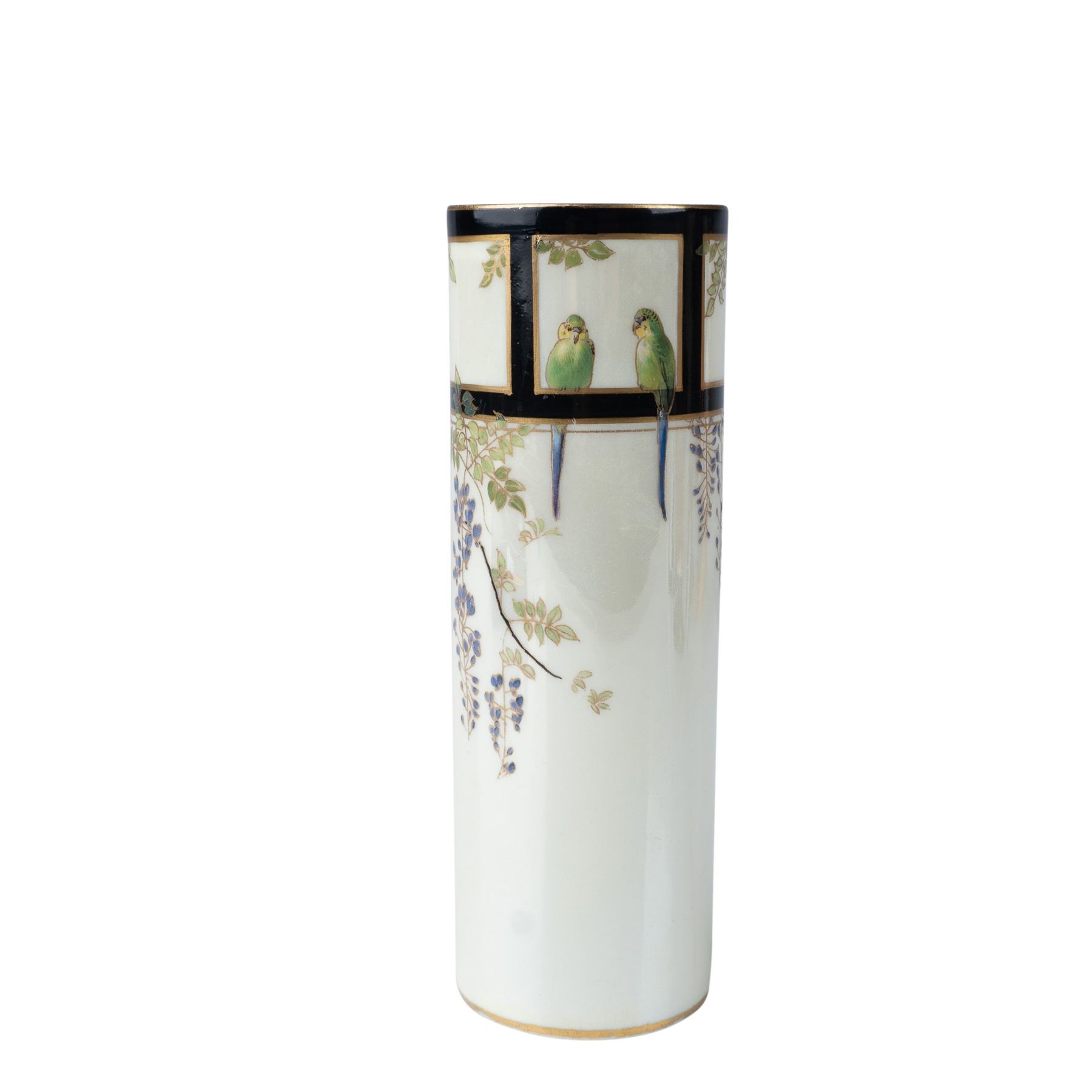 A stunning, rare Royal Doulton lustre ware vase featuring vibrant parakeets perched amidst wisteria-like floral motifs. The vase is adorned with a lustrous finish, accentuating its soft cream background and delicate hand painted details. The design is framed with bold black and gold borders, highlighting the fine craftsmanship and aesthetic appeal typical of Royal Doulton's lustre ware. Royal Doulton backstamp.