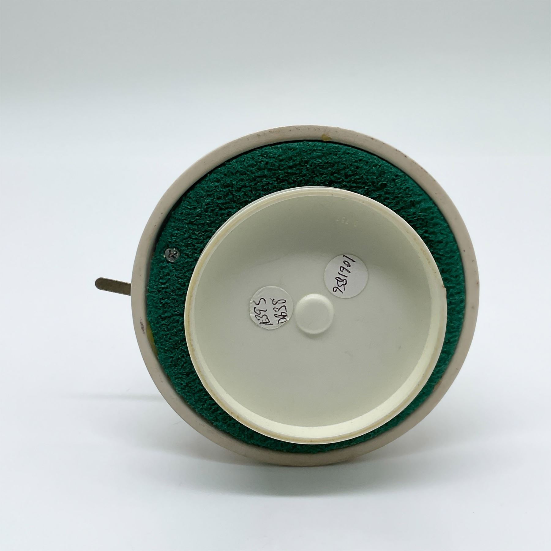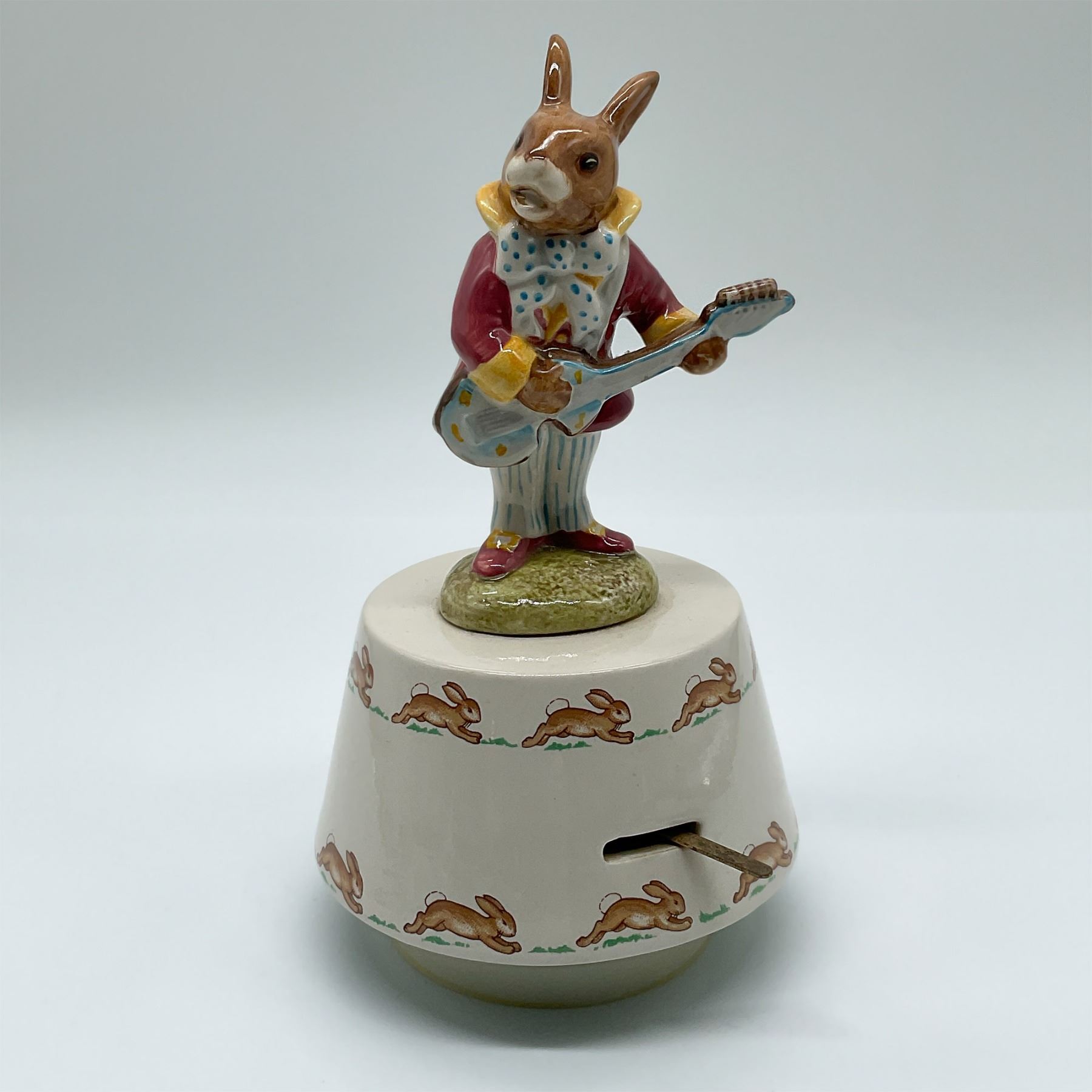 Charming Royal Doulton music box featuring the Hey Jude character from the beloved Bunnykins collection. This whimsical design depicts a rabbit dressed in vibrant attire, holding a guitar, atop a rotating base decorated with the classic Bunnykins running rabbit motif. The music box plays a melody inspired by the Beatles' "Hey Jude," adding a touch of nostalgia to this collectible piece. Marked with the Royal Doulton Bunnykins backstamp on the base, this piece exemplifies the brand's artistry and playful designs. It stands approximately 7"H. The base includes a functioning music box mechanism with a wind-up key.
